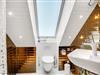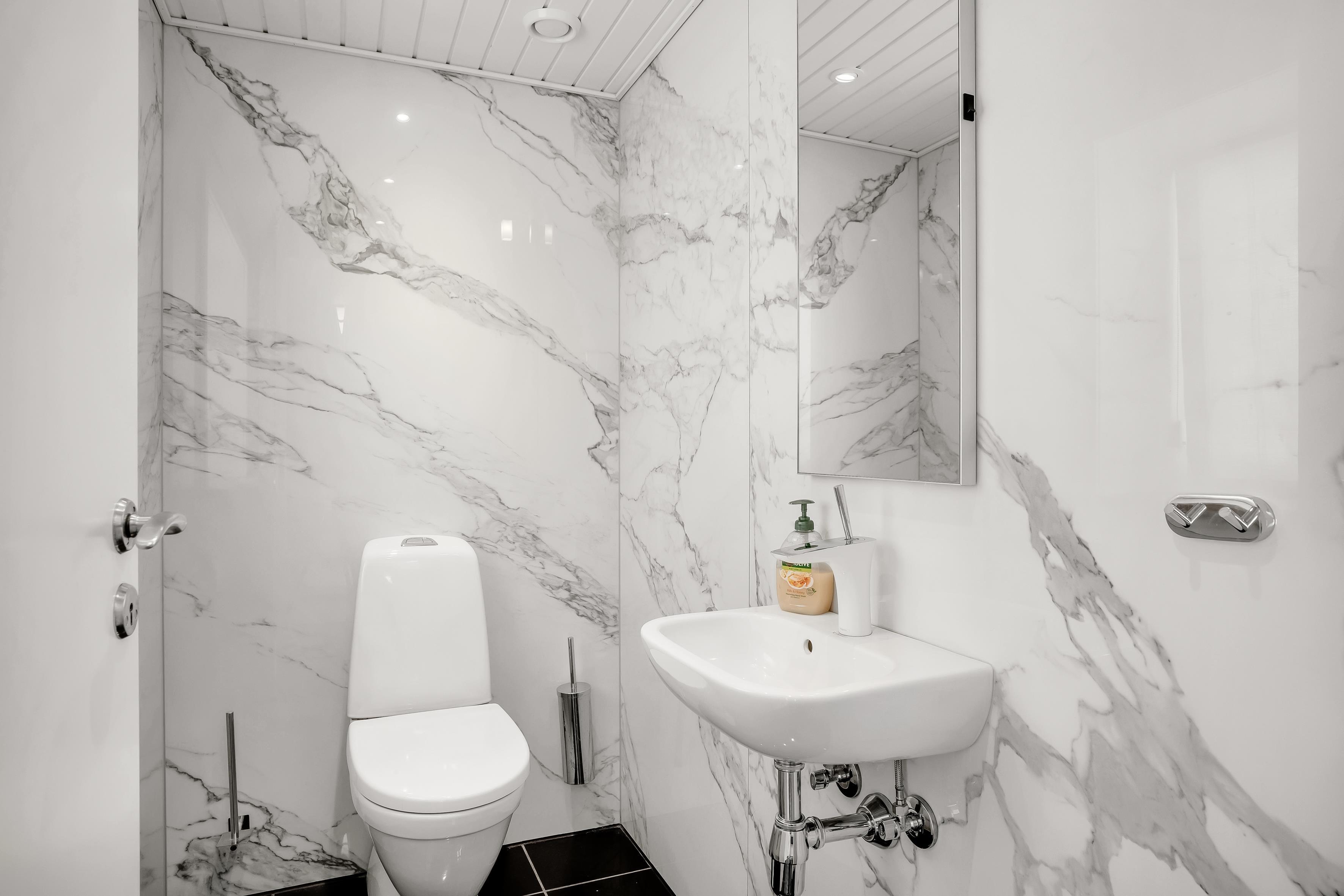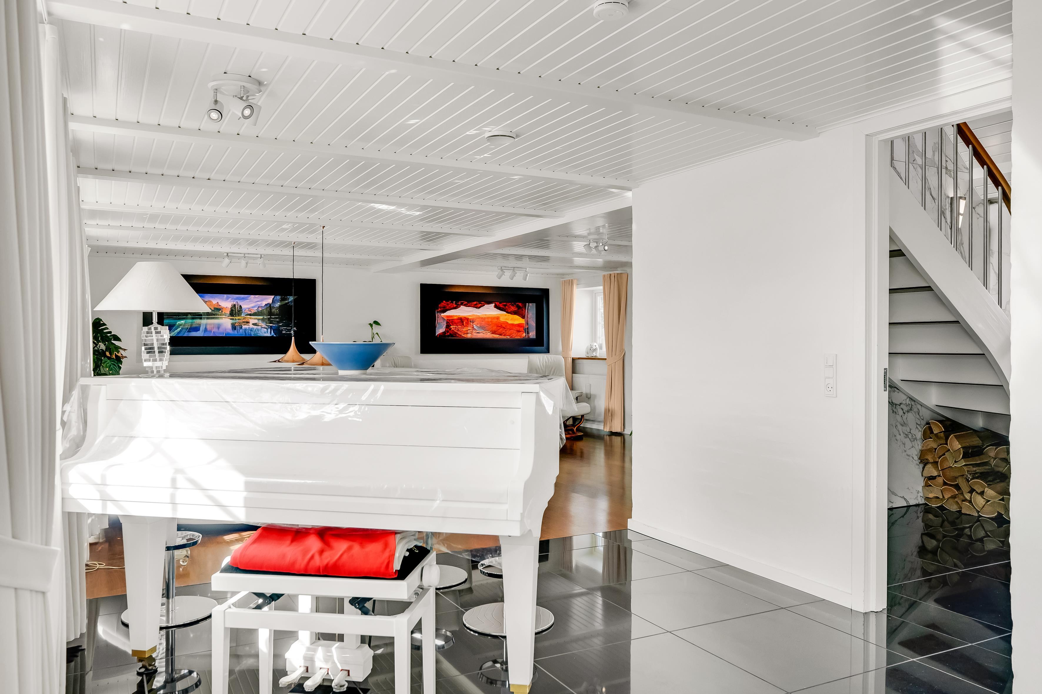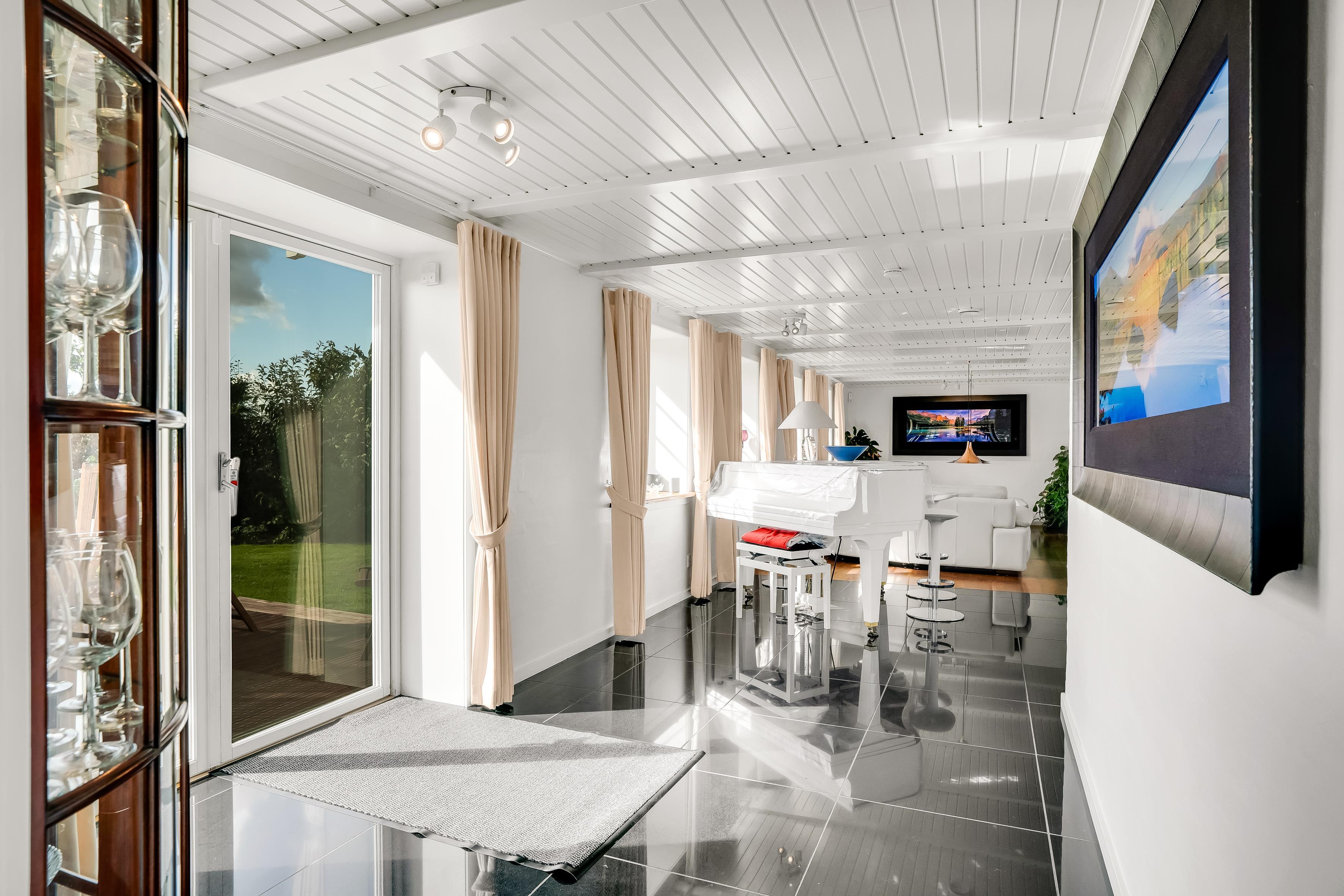 Derudover findes endnu et badeværelse på førstesalen samt en ekstra stue, hvor valnøddetrægulv, brændeovn og store vinduespartier giver en både varm og eksklusiv atmosfære med udsigt over naturen. Endelig er der en lille hyggestue med TV, kaffemaskine og tilhørende toilet.