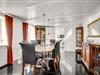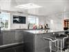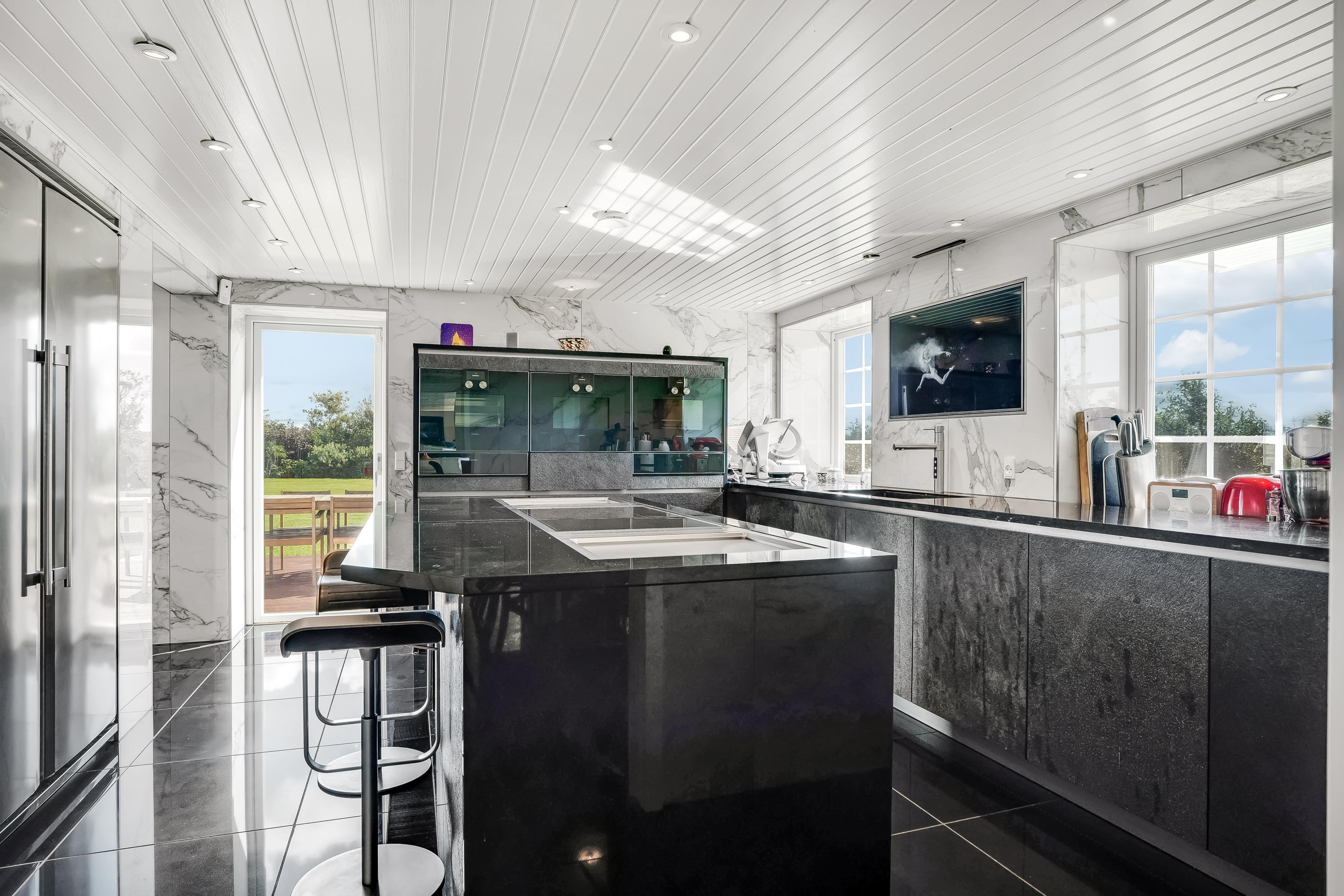 Køkkenet rummer desuden kaffemaskine, varmeskuffer og vaacumskuffe, køleskab, fryser på ca. 300 liter, et kvalitets-vinskab samt et kombineret køle-/fryseskab fra Liebherr. Kogeøen er indrettet, så der kan placeres barstole omkring – oplagt til social madlavning og samvær.