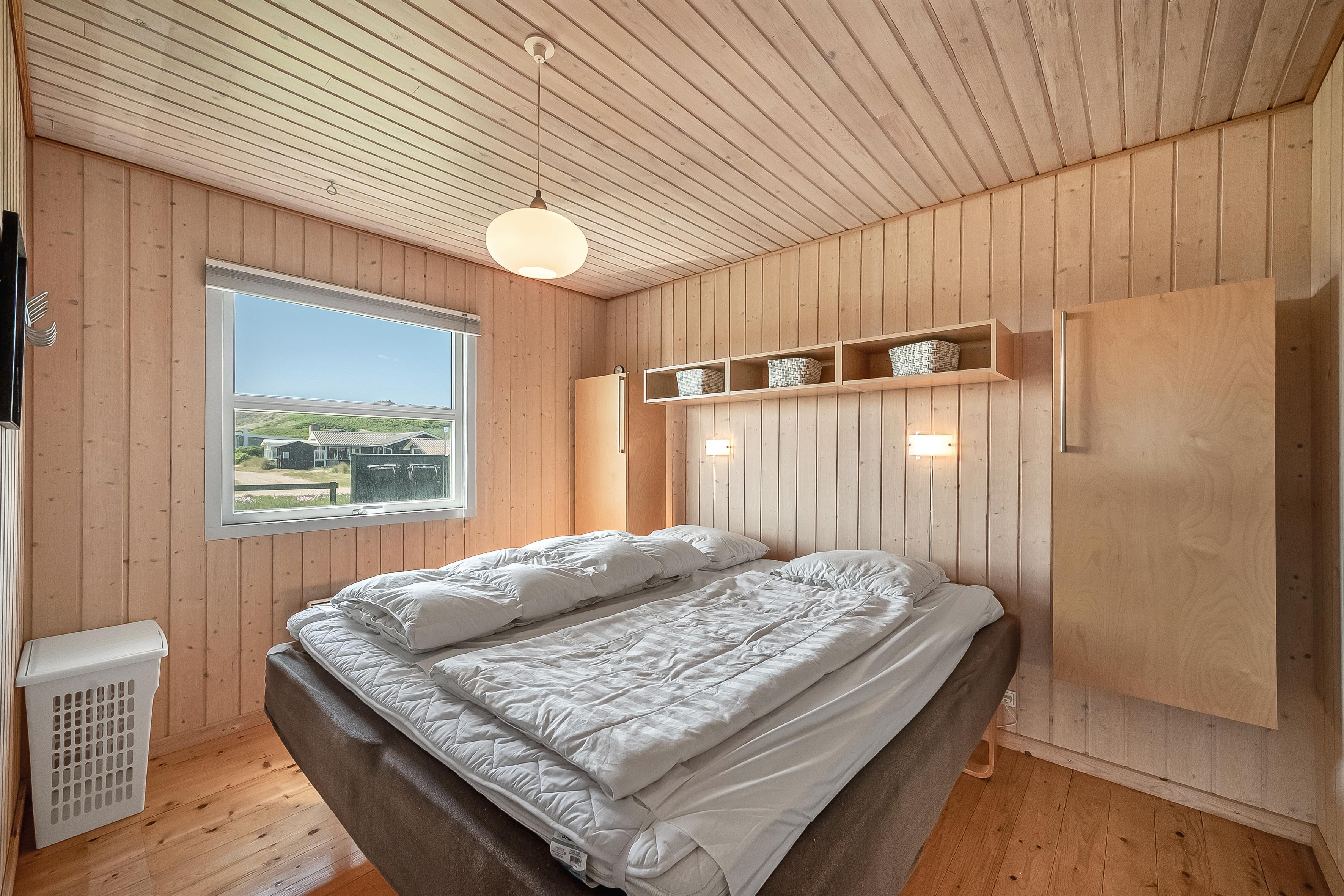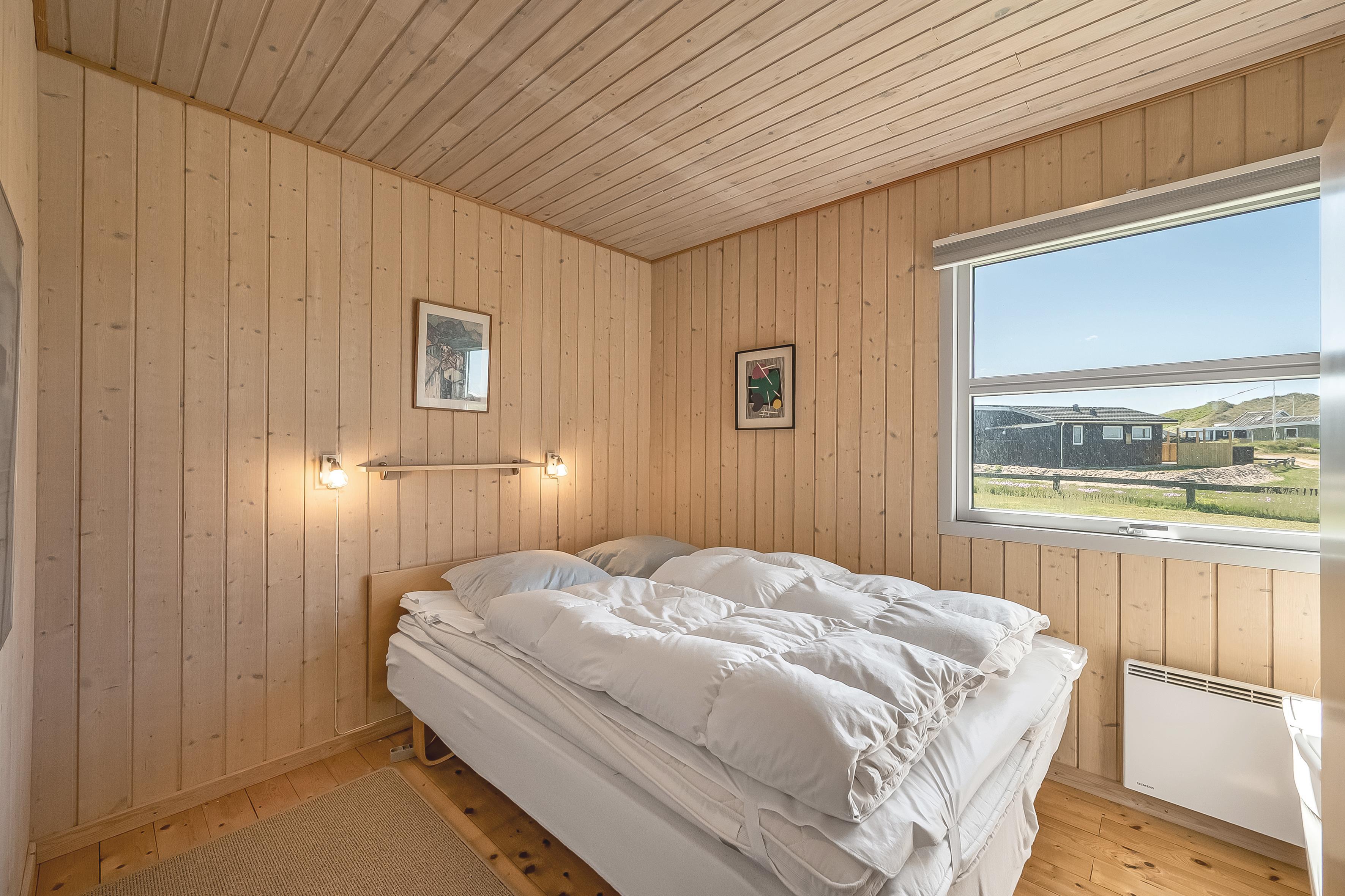 Sommerhuset har tre soveværelser med følgende sengefordeling: to dobbeltsenge og én enkeltseng.