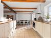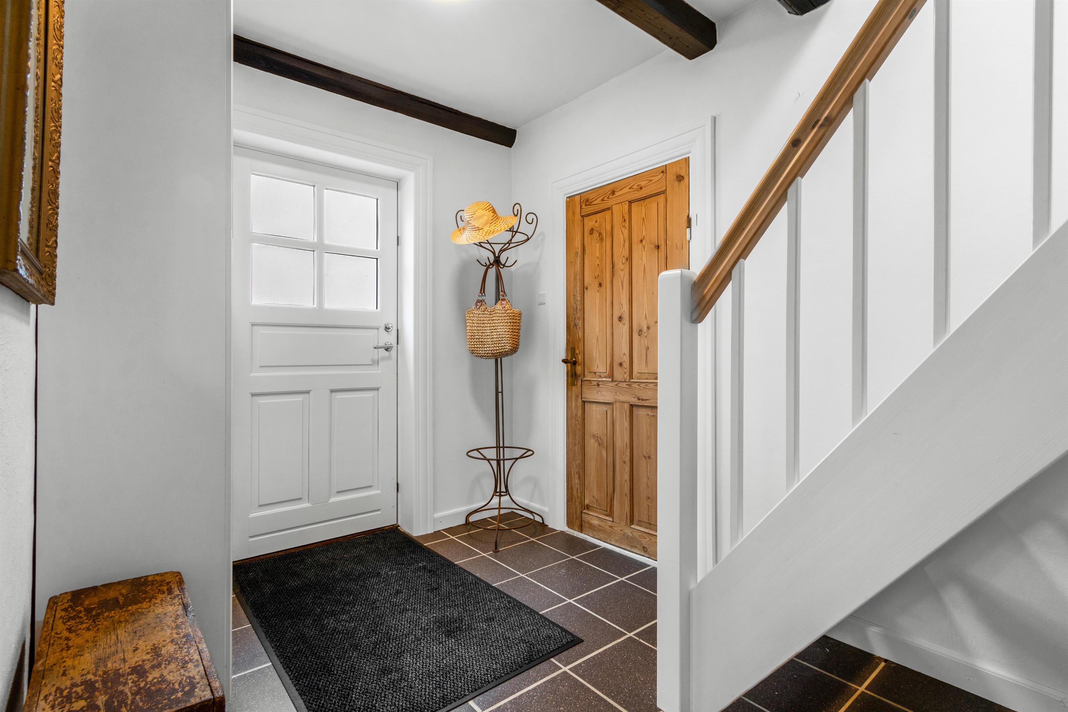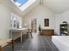 Køkkenet og stuen udgør et stort og charmerende rum, der skaber en perfekt atmosfære for samvær under madlavning og indendørs hygge. Det landlige køkken er indrettet med omhu, og tilbyder god plads til at forberede lækre måltider sammen. Ved enden af køkkenet finder du spisepladsen med plads til 6 personer og en fantastisk udsigt til haven gennem de franske dobbeltdøre. Adgang til huset sker fra terrassen, der fører dig til en unik solstue på venstre hånd - et skønt rum med fri passage til det udendørs loungeområde. I stueplan findes også badeværelse med toilet samt gæstetoilet.