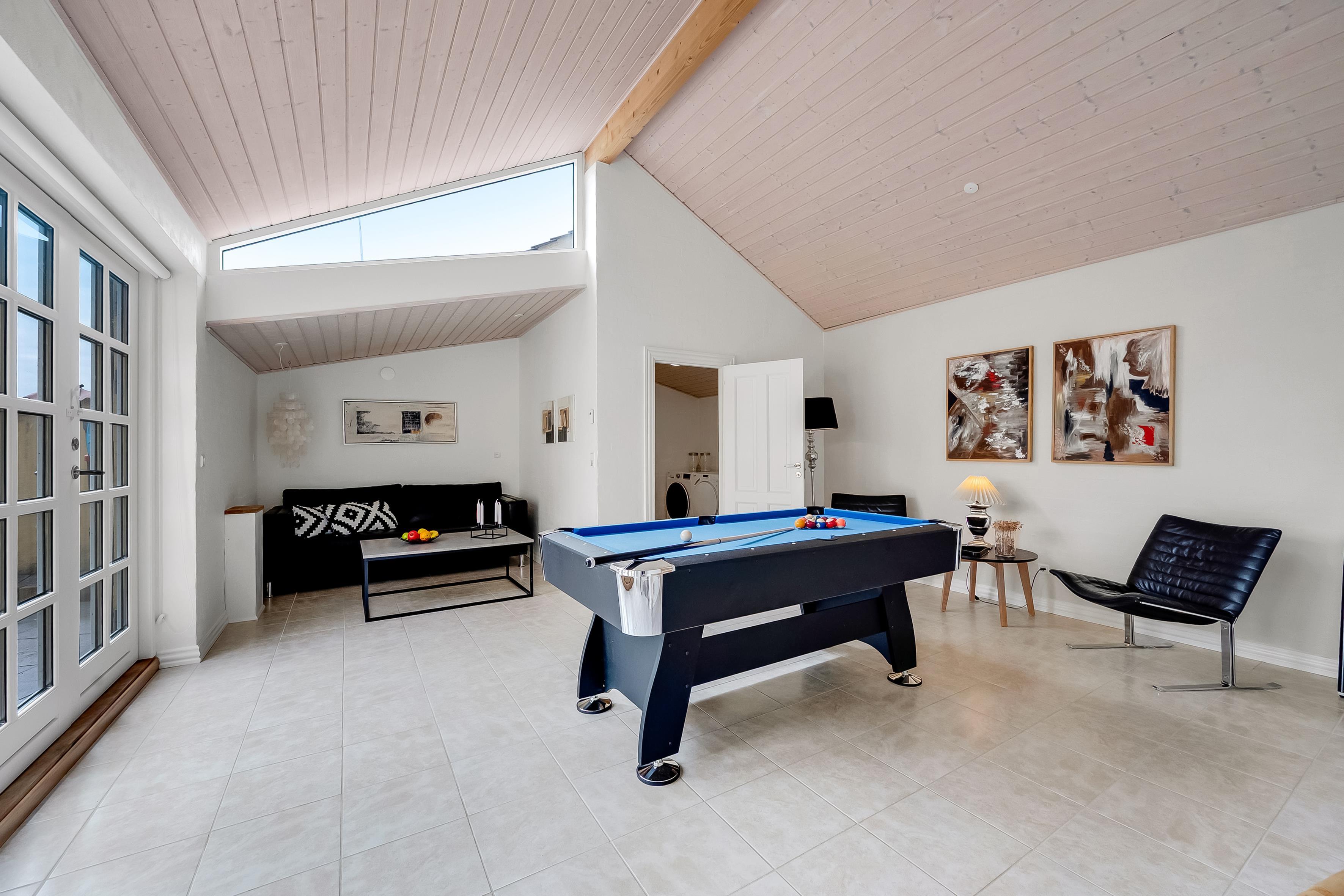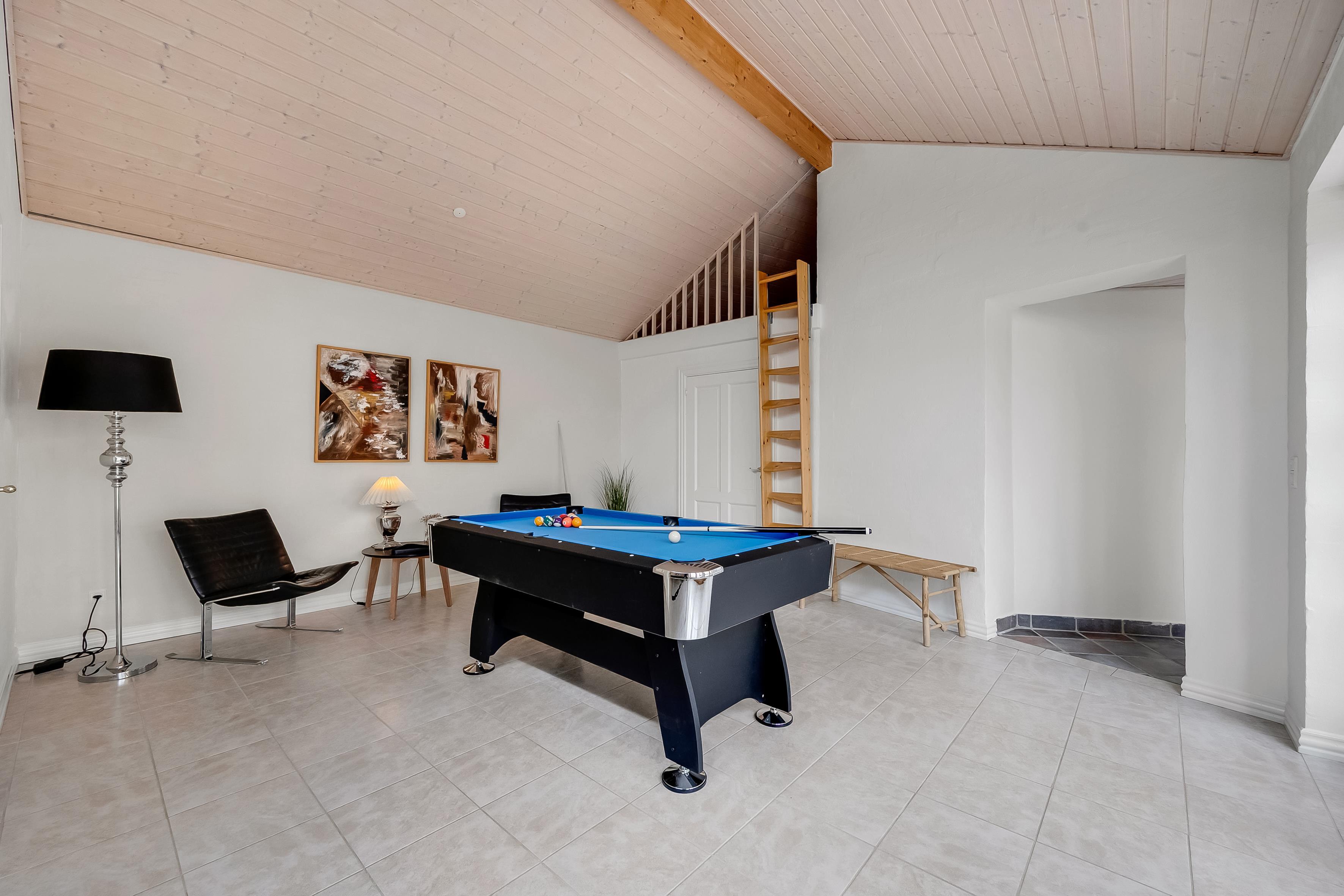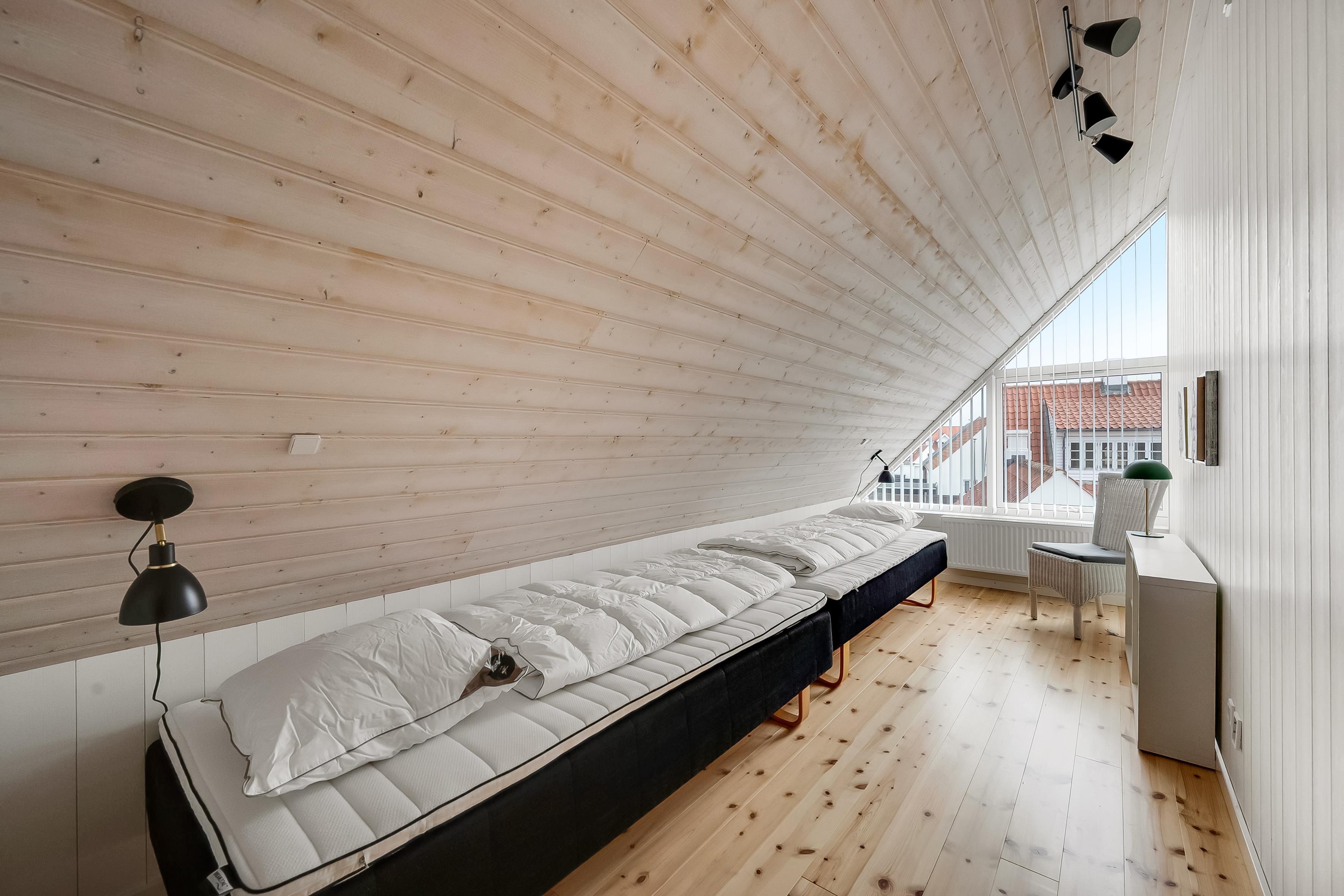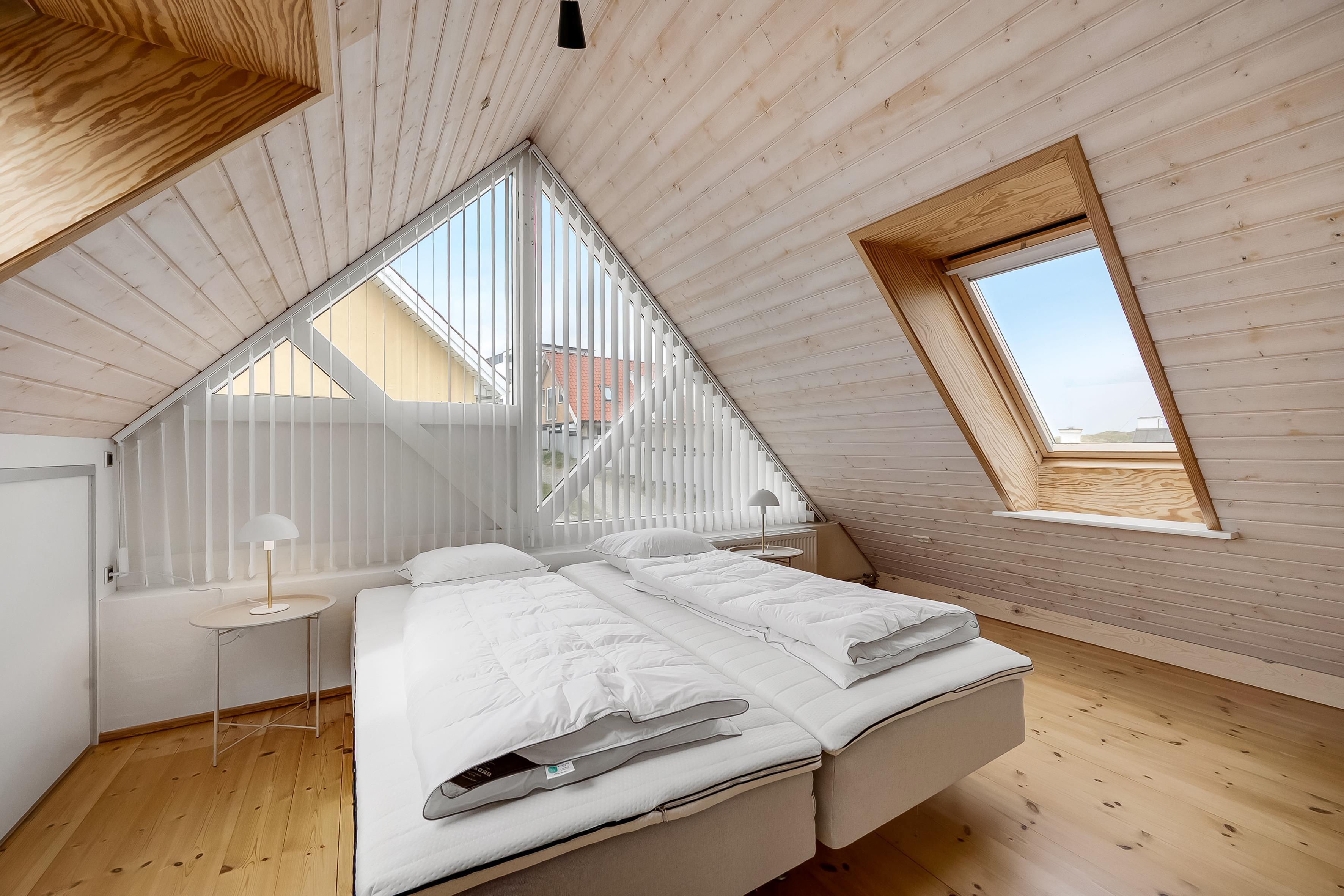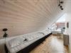 Sengefordeling: 2 dobbeltsenge + 2 opredninger på hems i stueetagen. 4 enkeltsenge på første sal.
