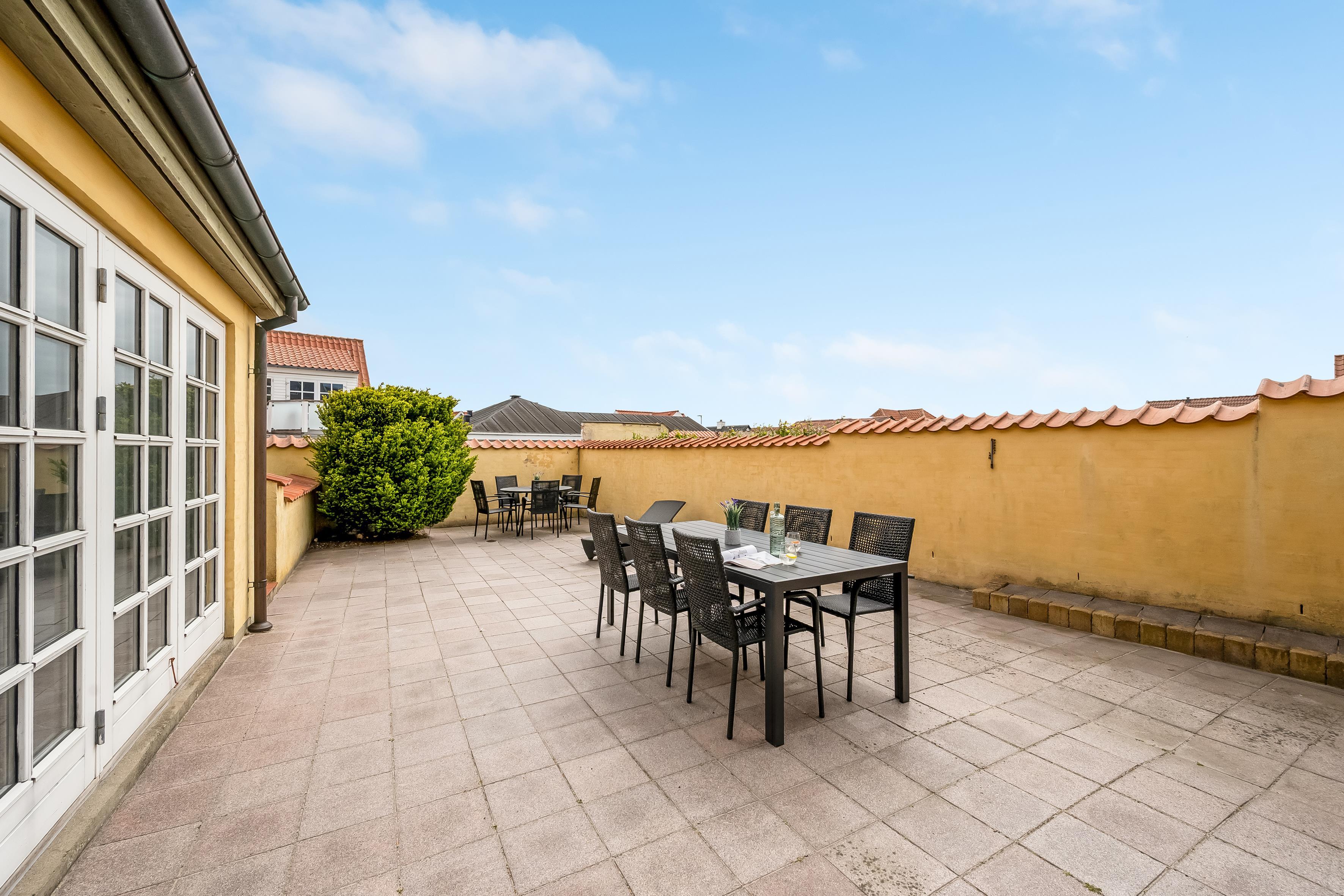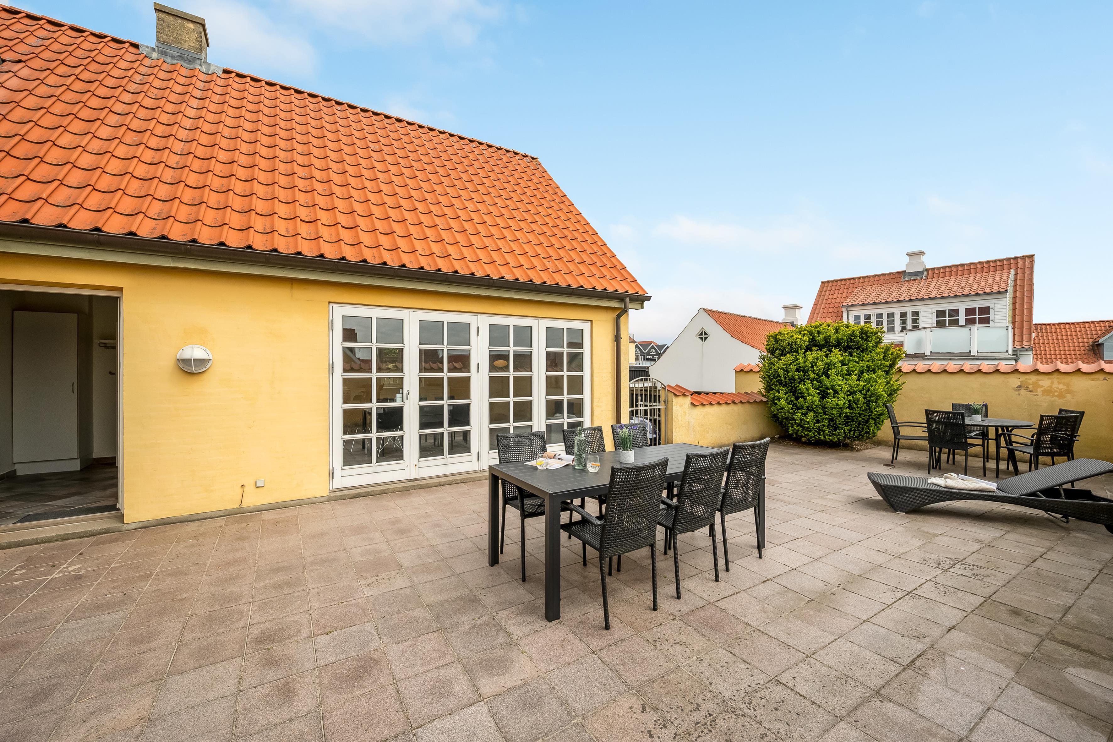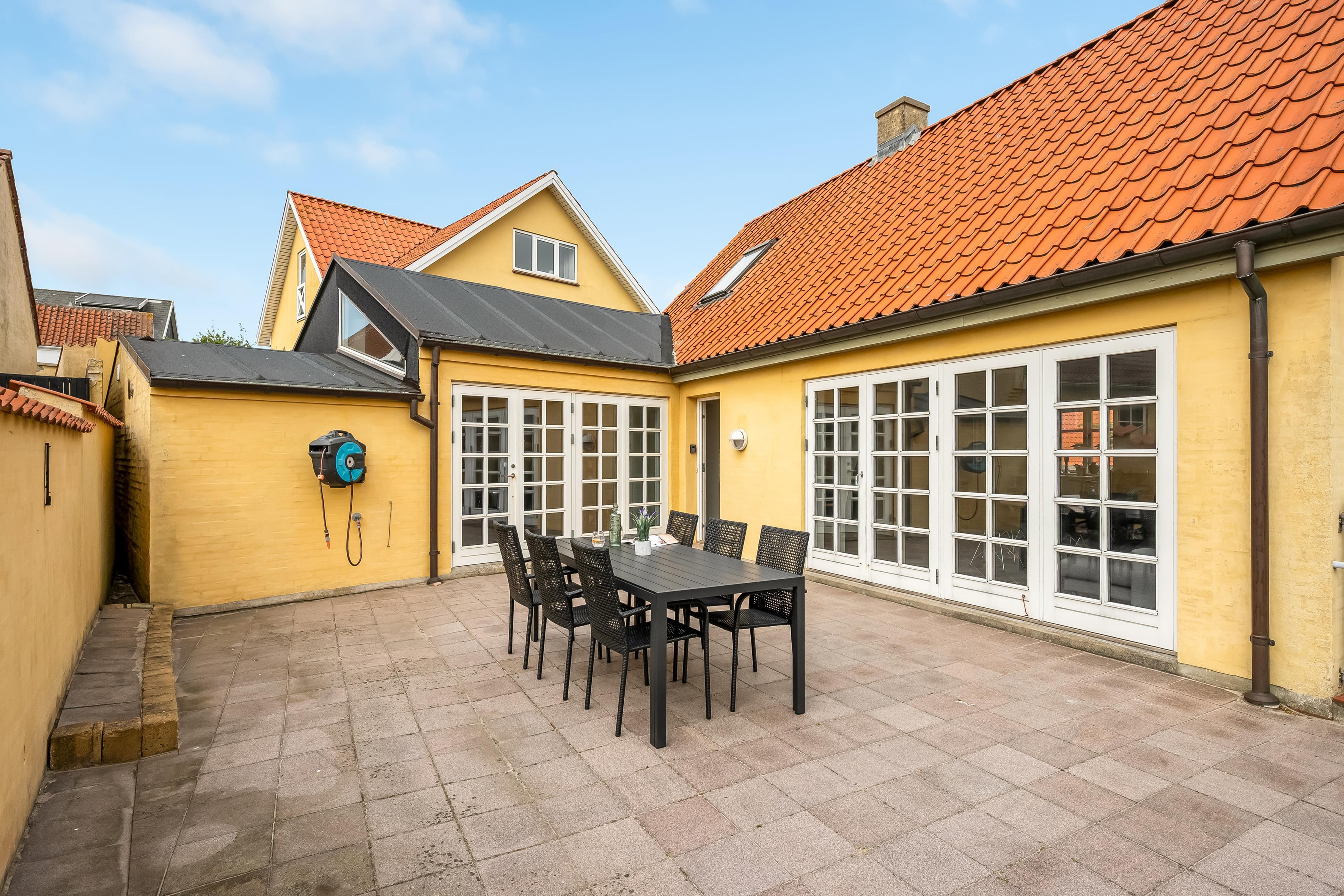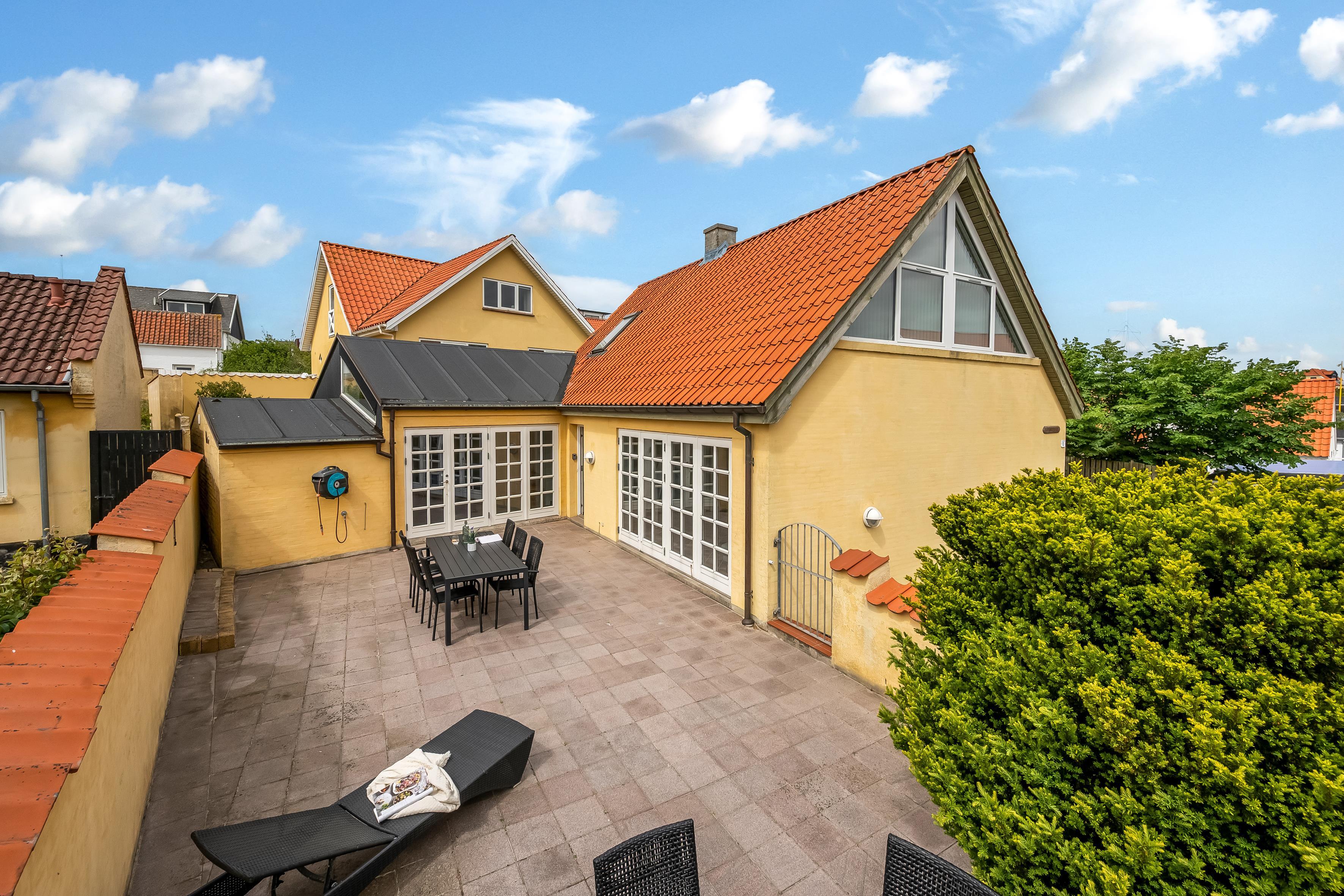 Hvad end du er til byens leben eller fred og ro på terrassen, finder du det i dette skønne sommerhus. Selve huset består af stueetage og første sal, der er opdelt i tre sektioner, hvilket gør det let at rejse flere familier eller par sammen. Den ene sektion finder du, når du kommer ind af hoveddøren og træder til venstre; her er stue, soveværelse med plads til to personer, hems med plads til to ekstra opredninger samt badeværelse. Den anden sektion er til højre, hvor husets store og lyse køkkenalrum samt andet badeværelse findes. Fra køkkenet kan du tilgå det andet soveværelse med plads til to personer, samt husets første etage, hvor der er to soverum.