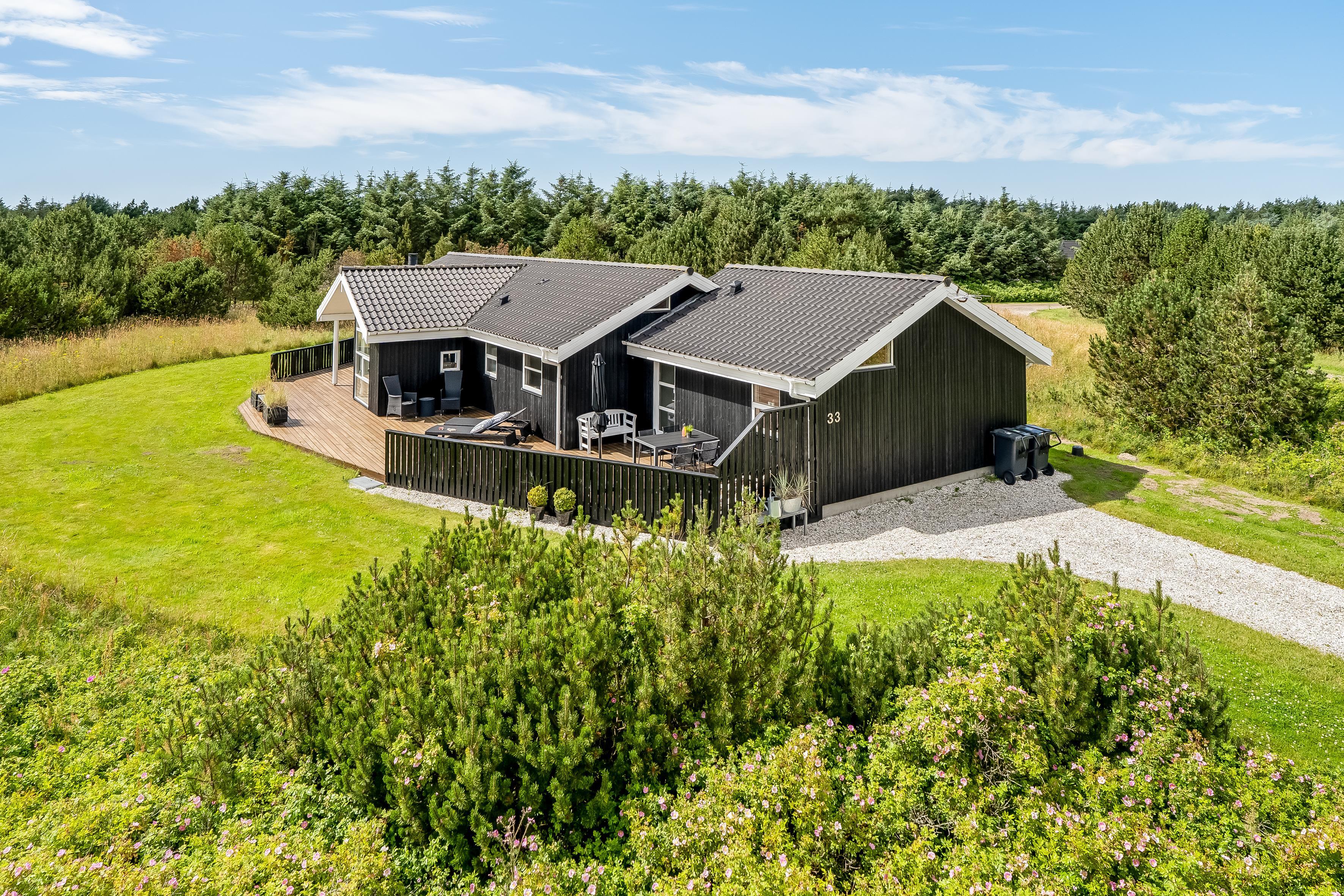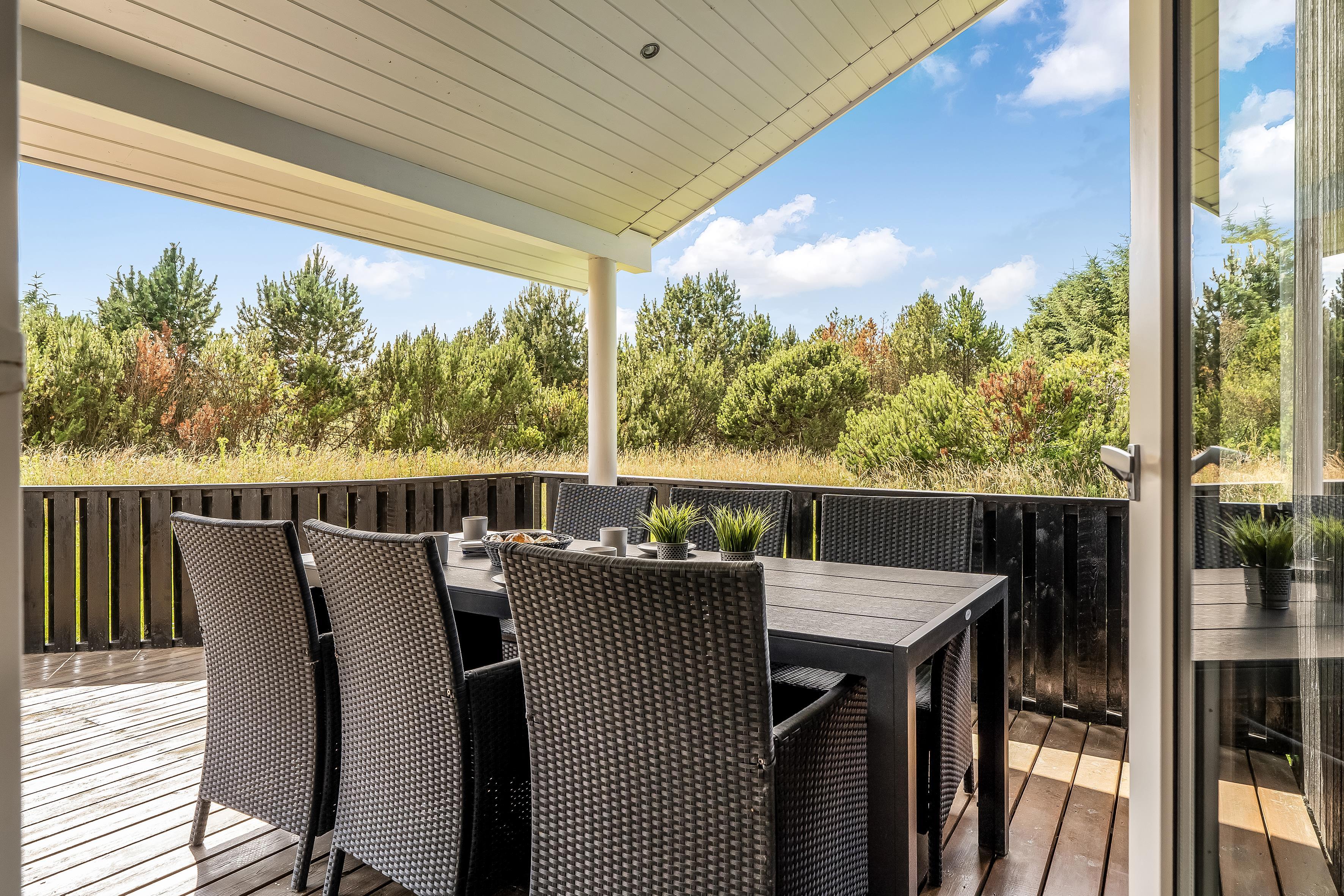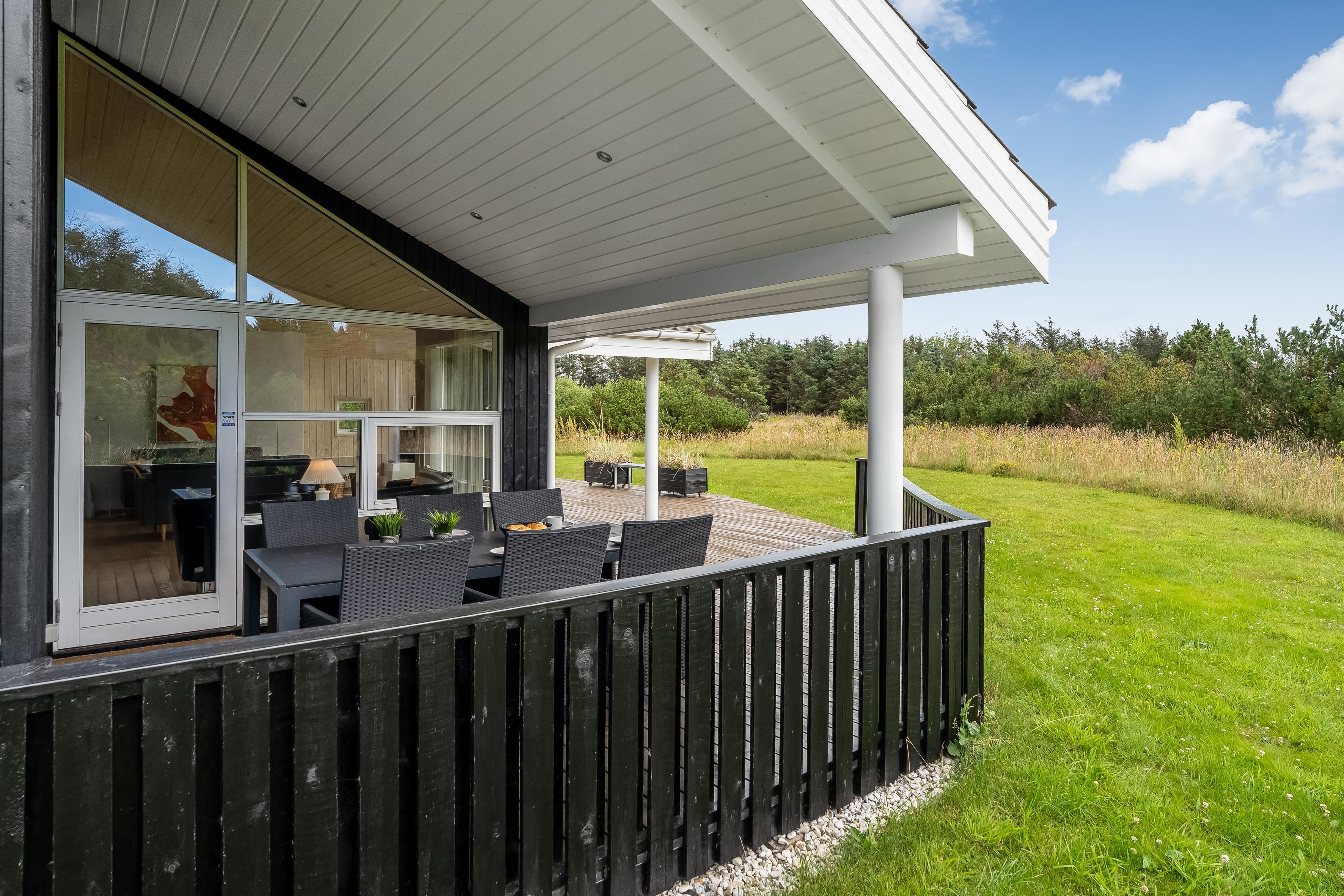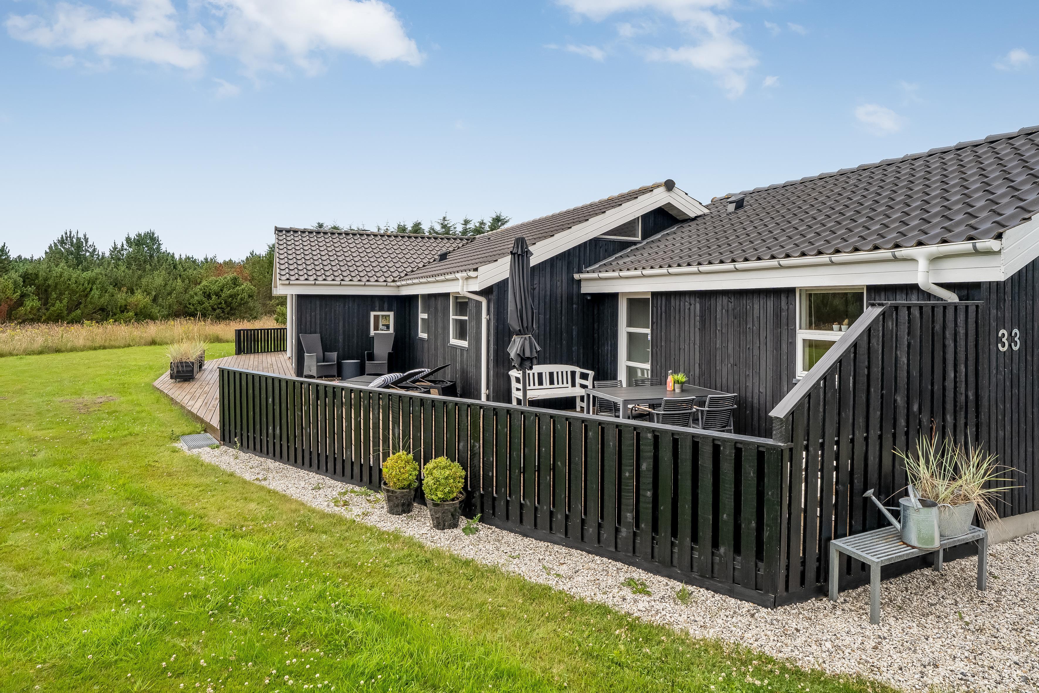 Rundt om huset ligger en stor træterrasse, der fra primo 2026 er aflukket, hvilket er ideelt til børnefamilier og husdyr. Det gør det også nemt at finde både sol, skygge og læ, alt efter årstiden. Her kan du starte dagen med en stille kop kaffe, spise frokost under åben himmel eller nyde aftenen med grill og hyggesnak. Haven giver også god plads til leg og aktiviteter for børnene.