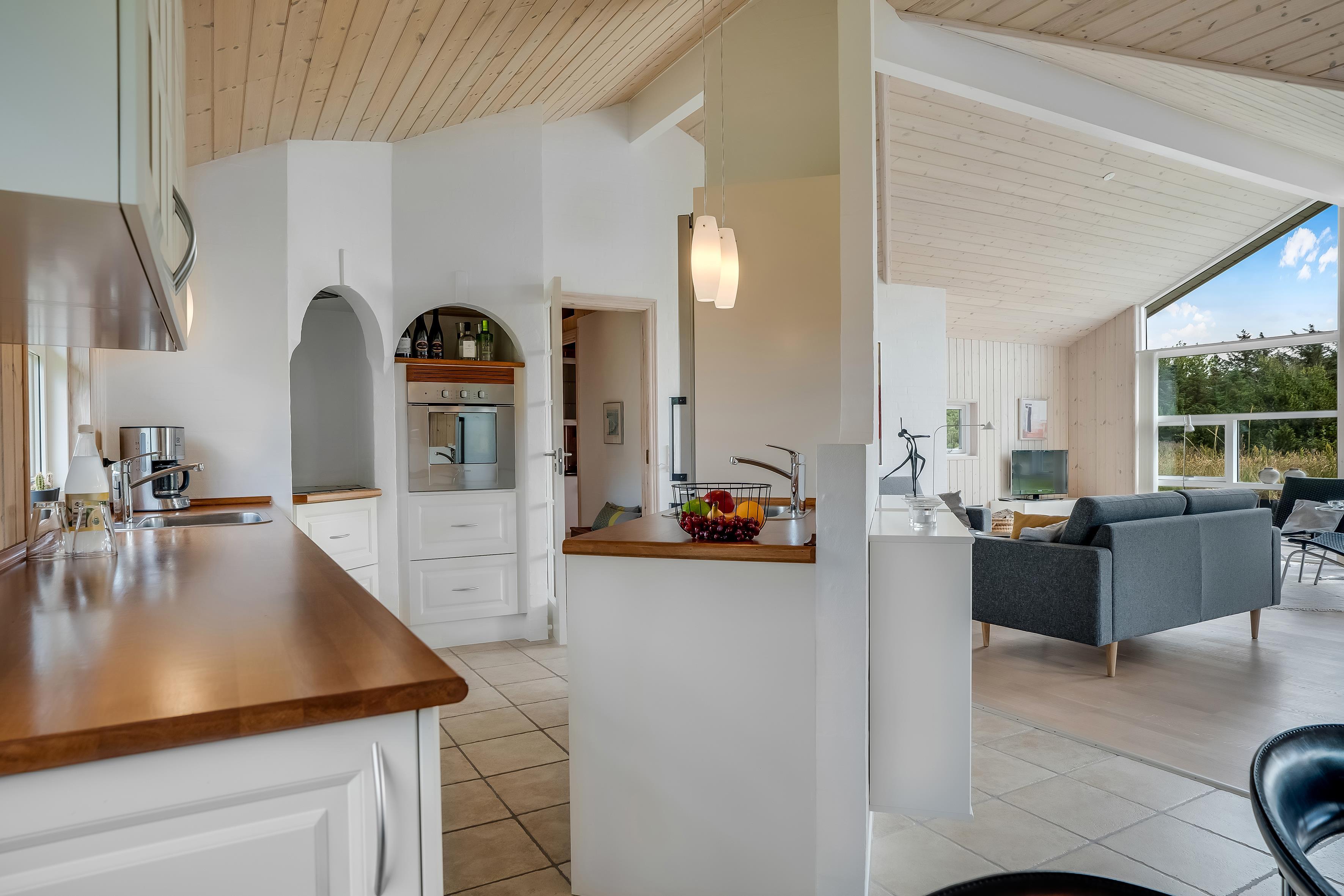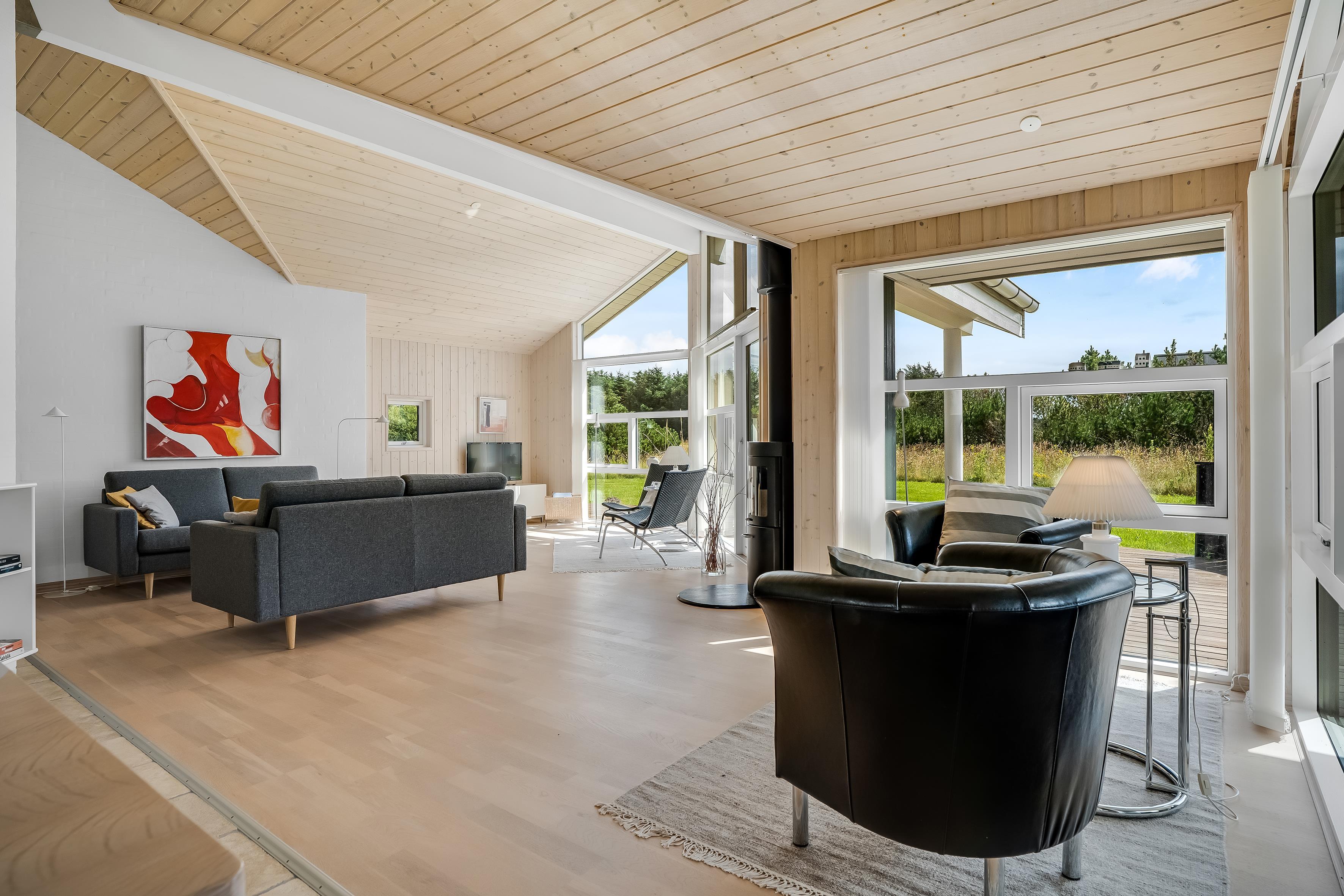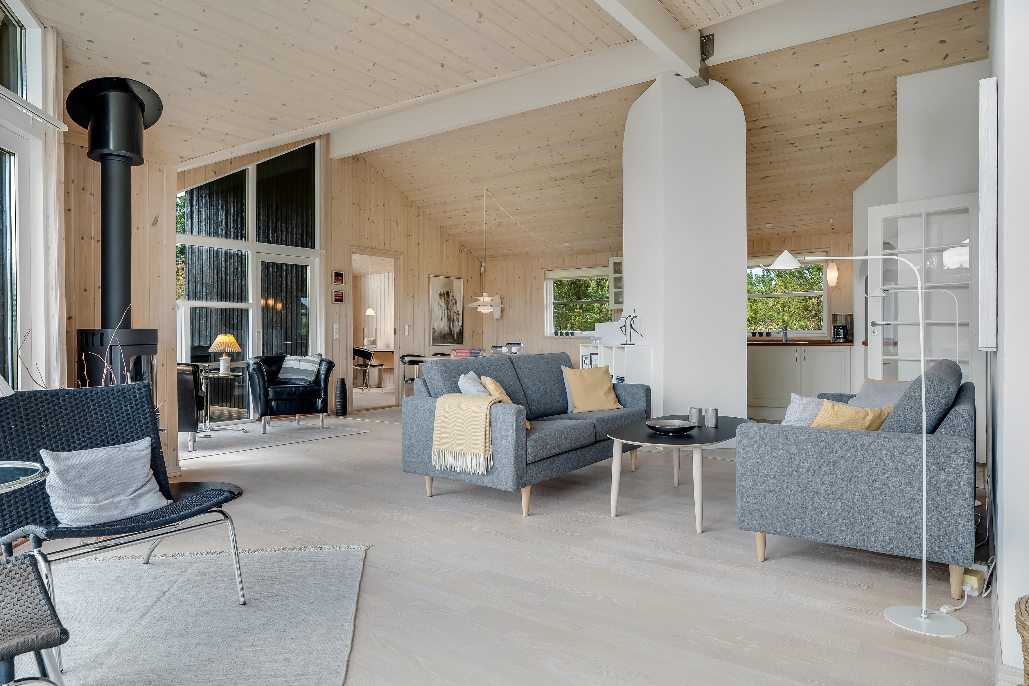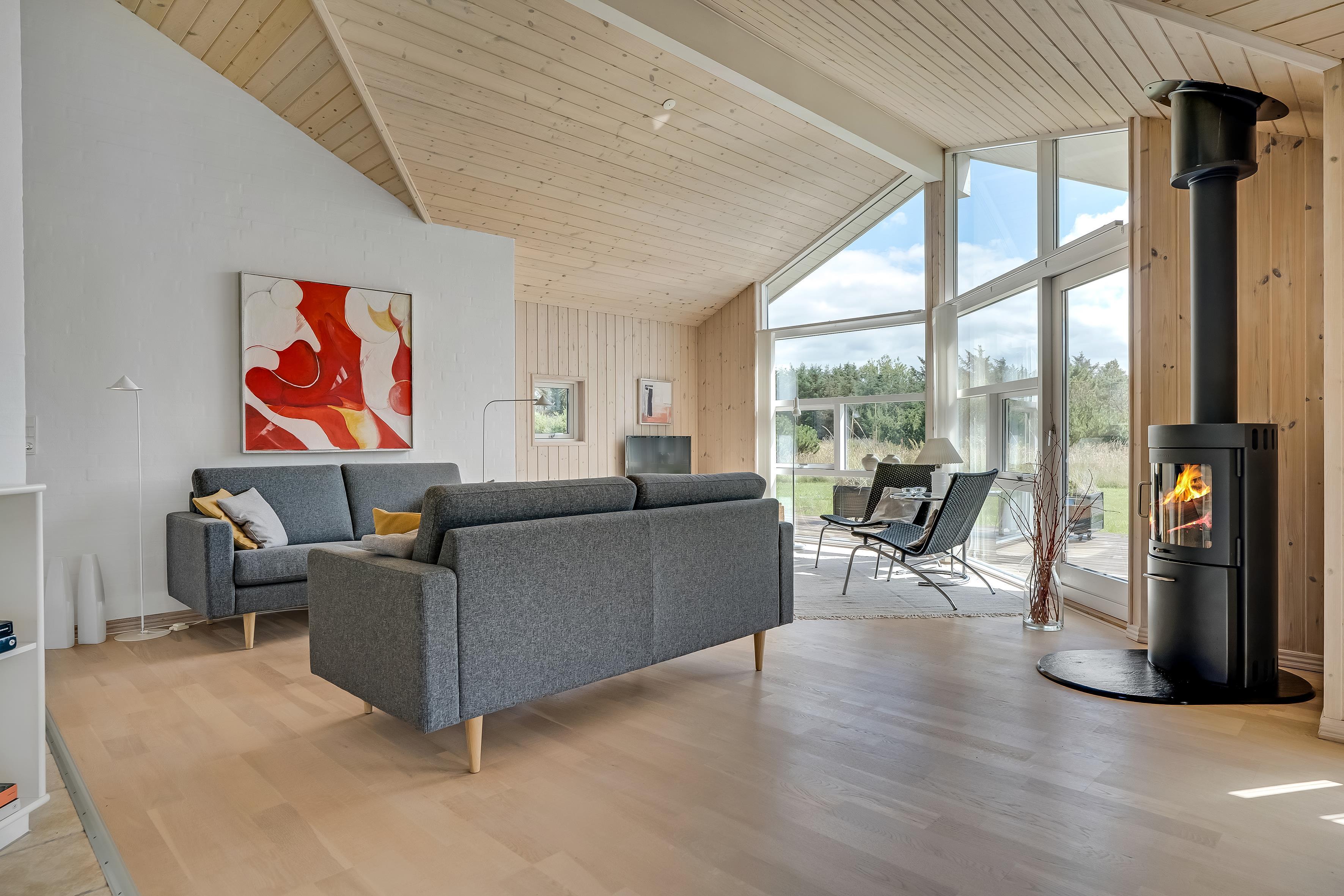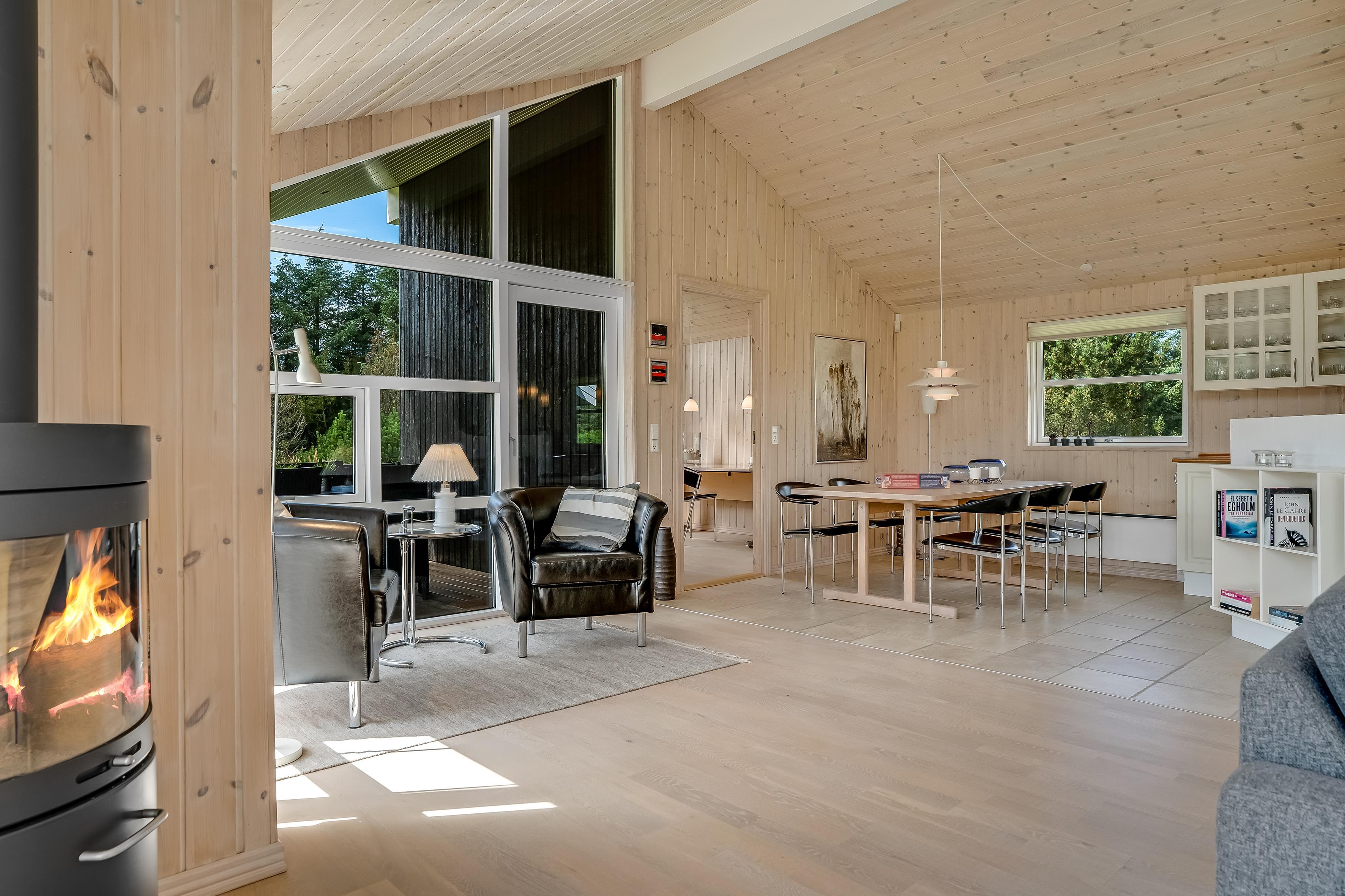 Indenfor mødes du af et lyst og åbent opholdsrum med store vinduer, der lukker masser af dagslys ind. Køkken og stue ligger i åben forbindelse, så der er god mulighed for at samles om madlavning, spil eller hygge foran brændeovnen.