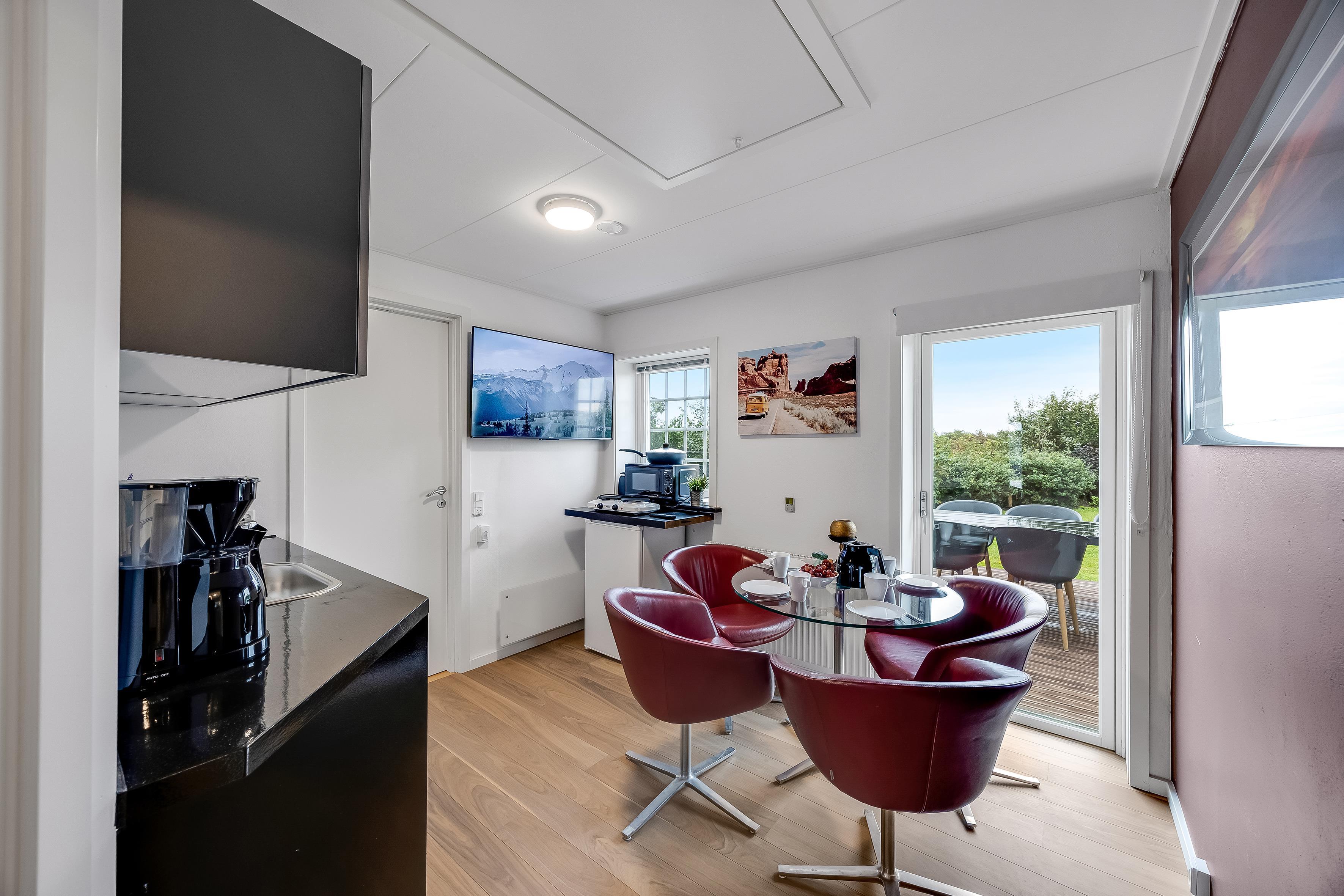 I køkkenet er der spiseplads til 4 personer. Der er kogeplader, mikroovn, ovn, to køleskabe, kaffemaskine og elkoger samt TV. Der er desuden stor spiseplads til alle i fællesrummet.