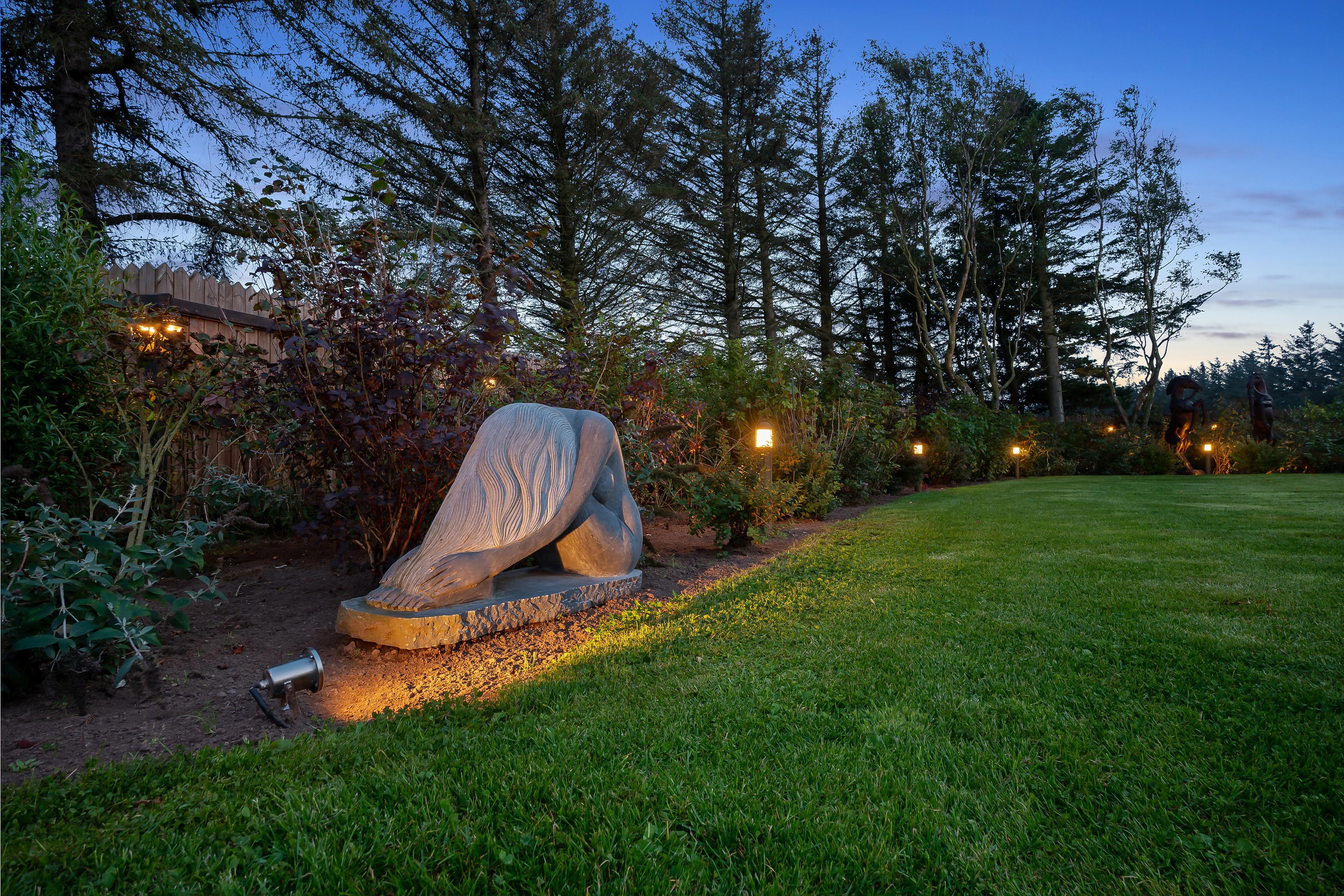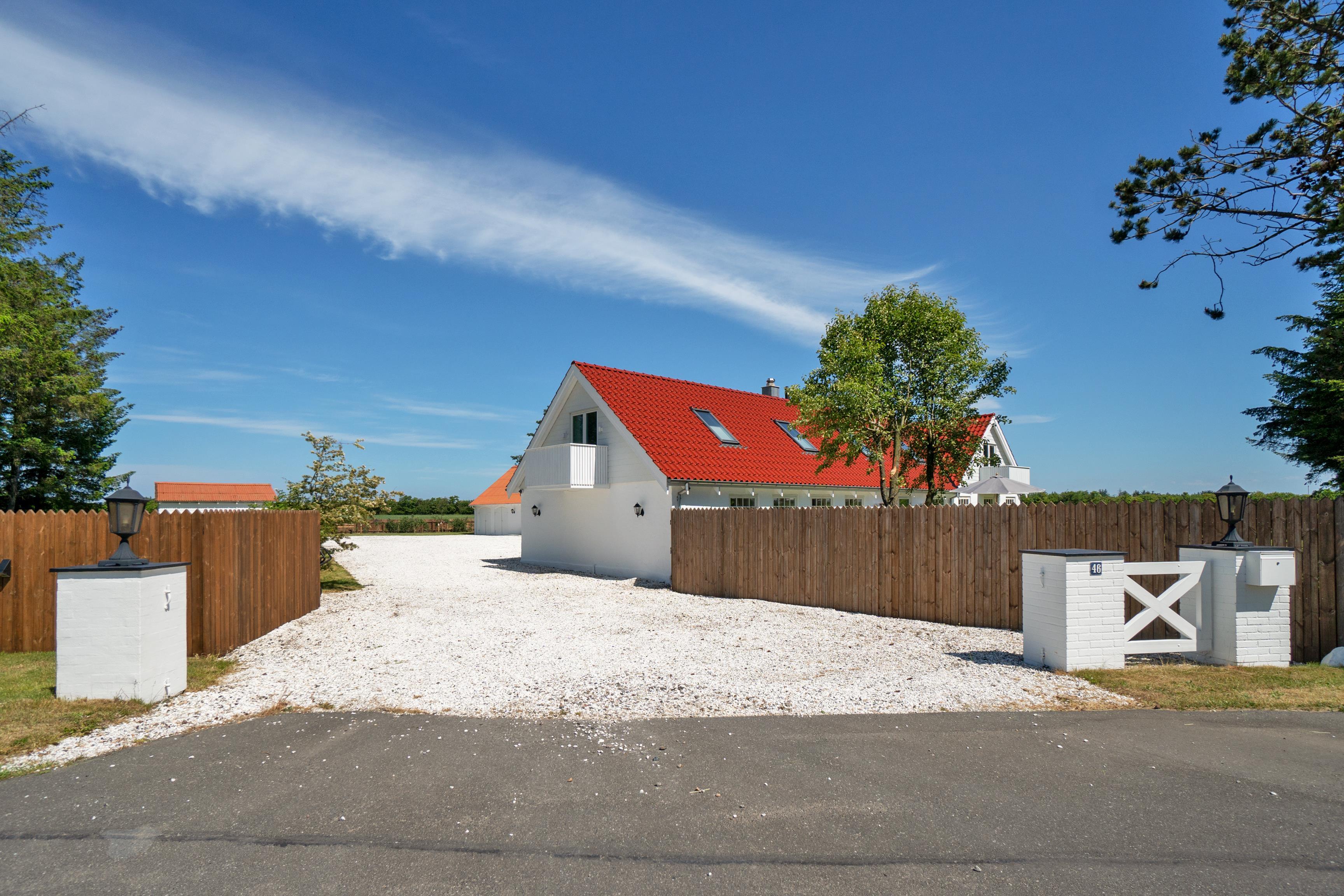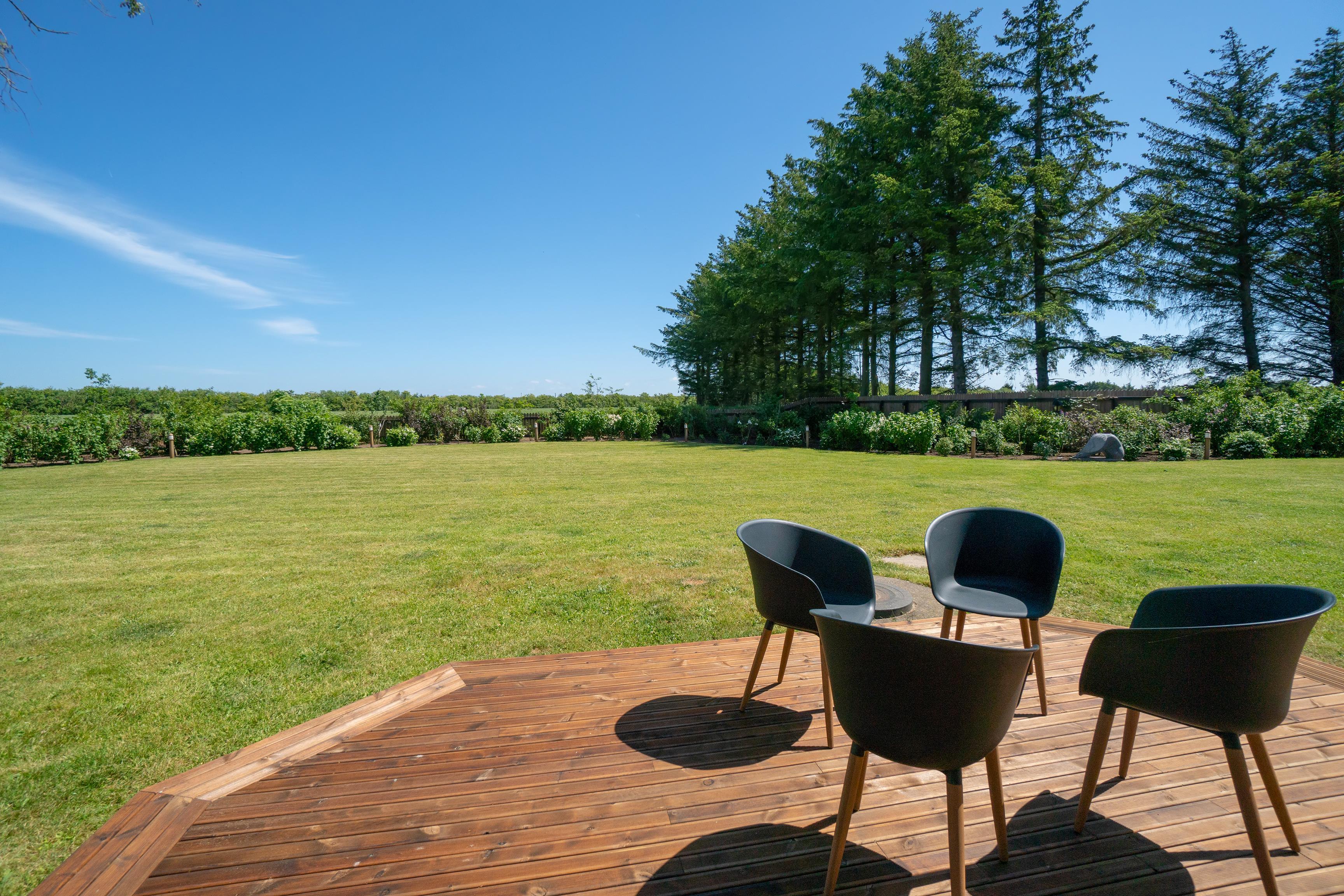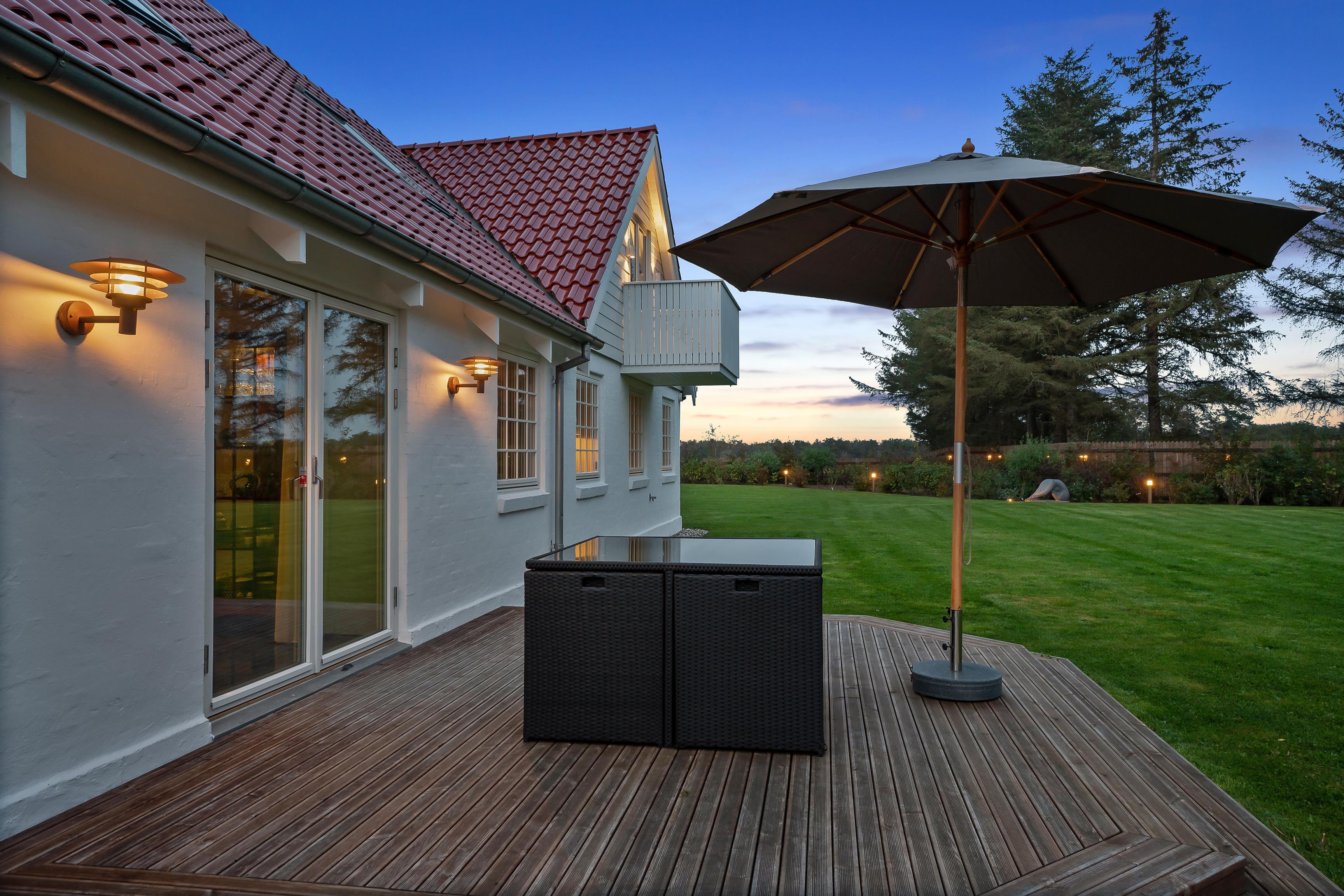 Fornøjelserne er heller ikke til at overse udendørs, hvor haven omkranses af et rækværk af træ. Rundt i haven findes velplacerede udendørslamper, som skaber et smukt syn ved aftentid.