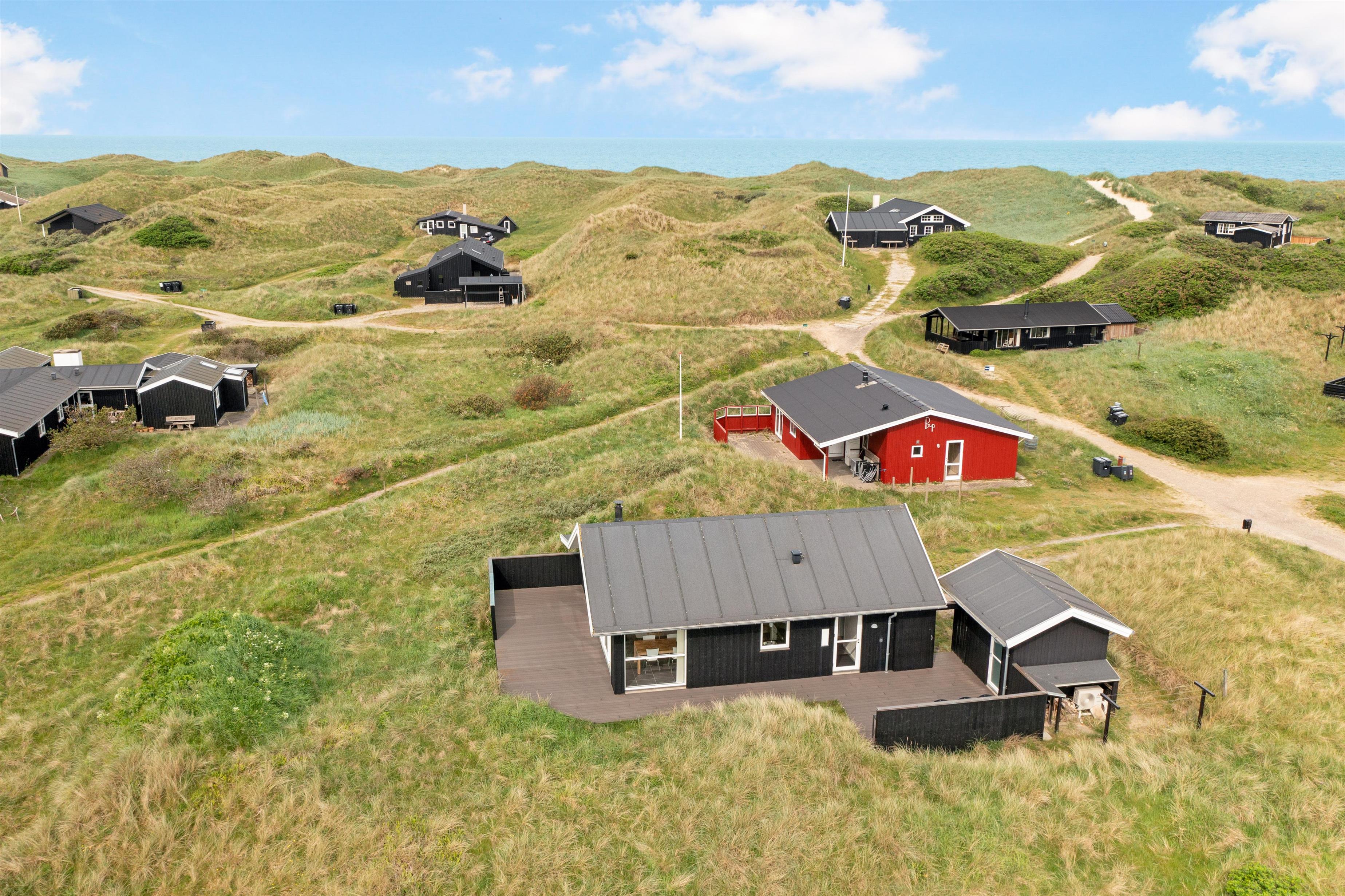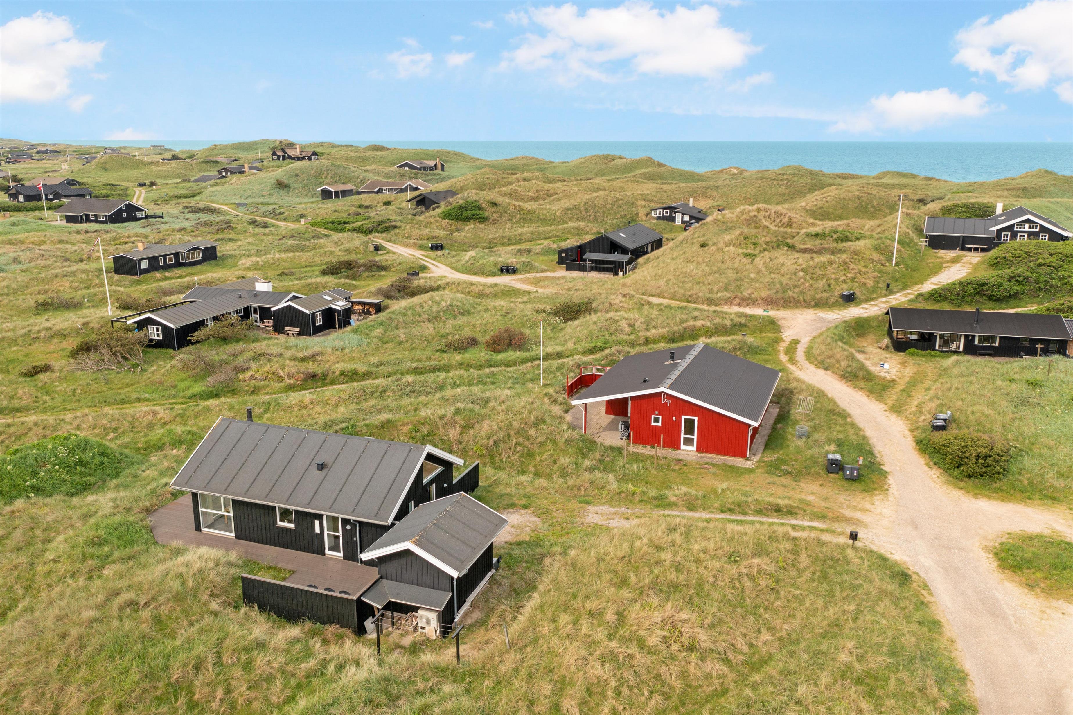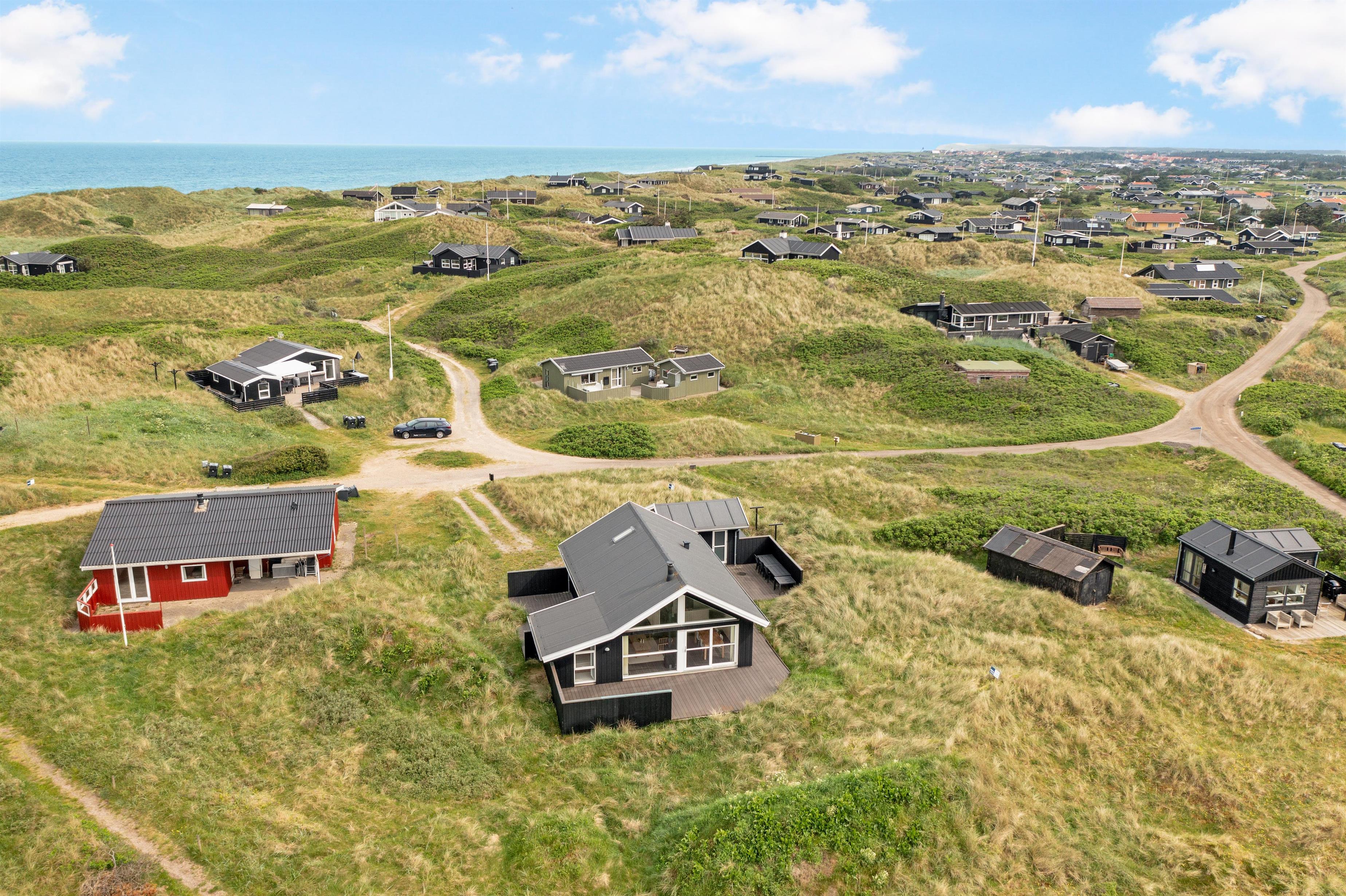 Udendørsområdet byder på store terrasseområder, hvor du kan nyde din morgenkaffe, grille om aftenen eller bare slappe af med en god bog. Det er også et perfekt sted for børnene at lege og nyde den friske havluft. Hvis du vil opleve byens summen af glade gæster, skal du blot bevæge dig ca. 2 km, og det er endda tilladt at køre på bil ned på stranden, der er en af Danmarks mest eftertragtede badestrande.