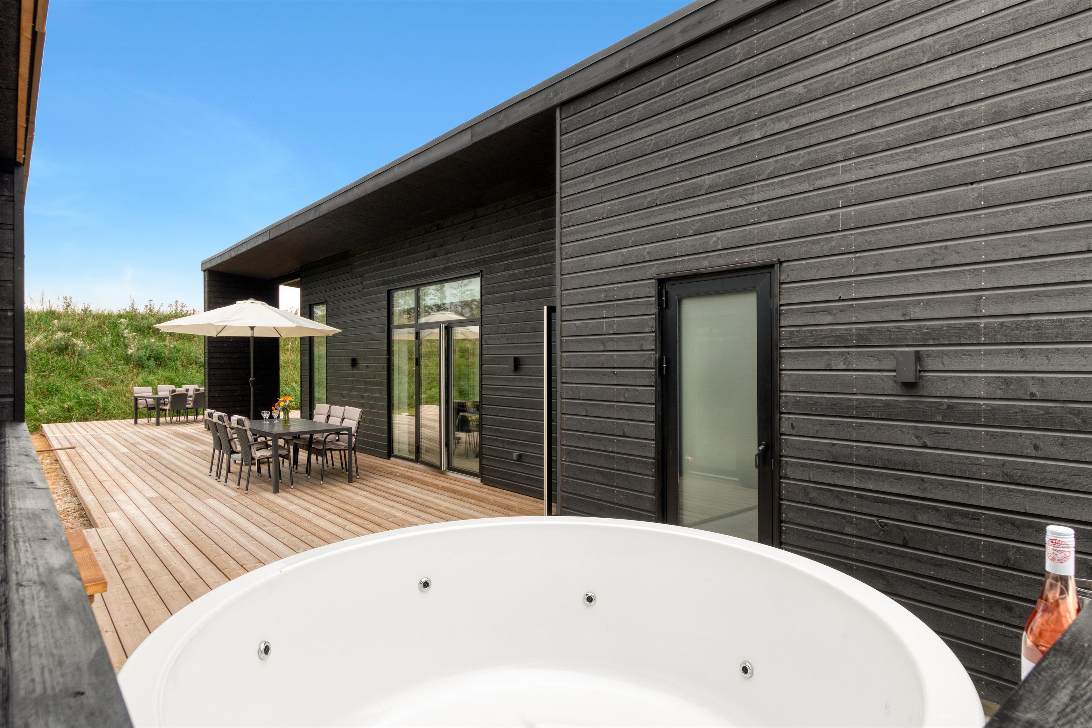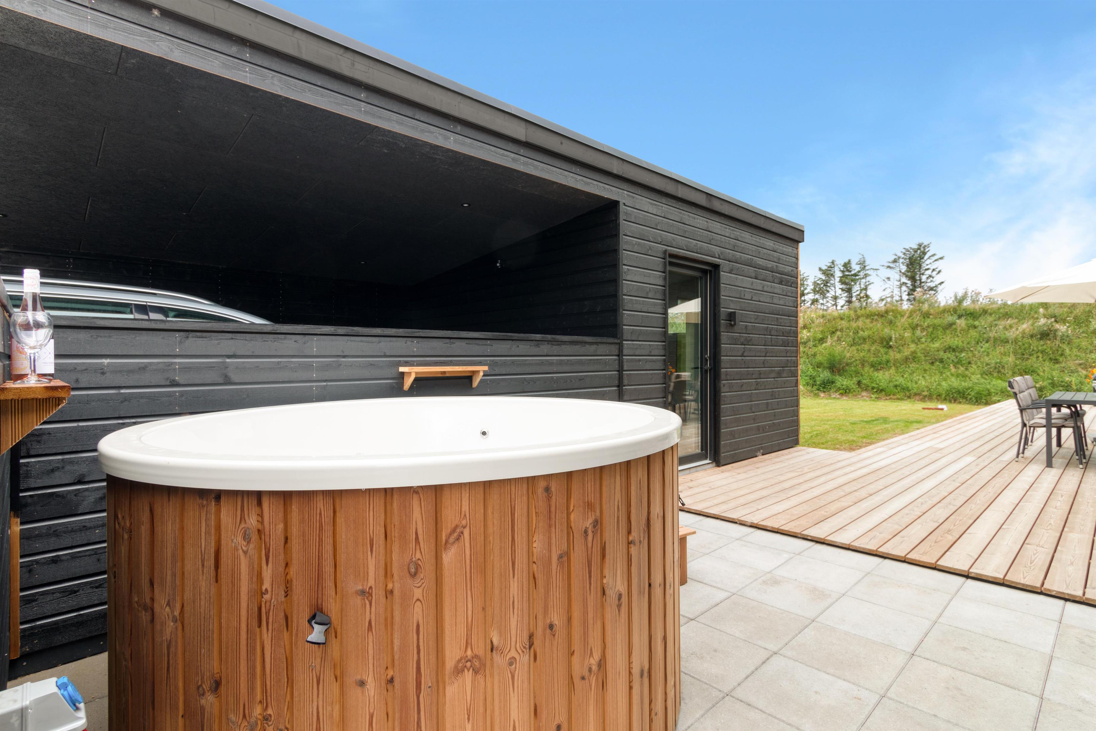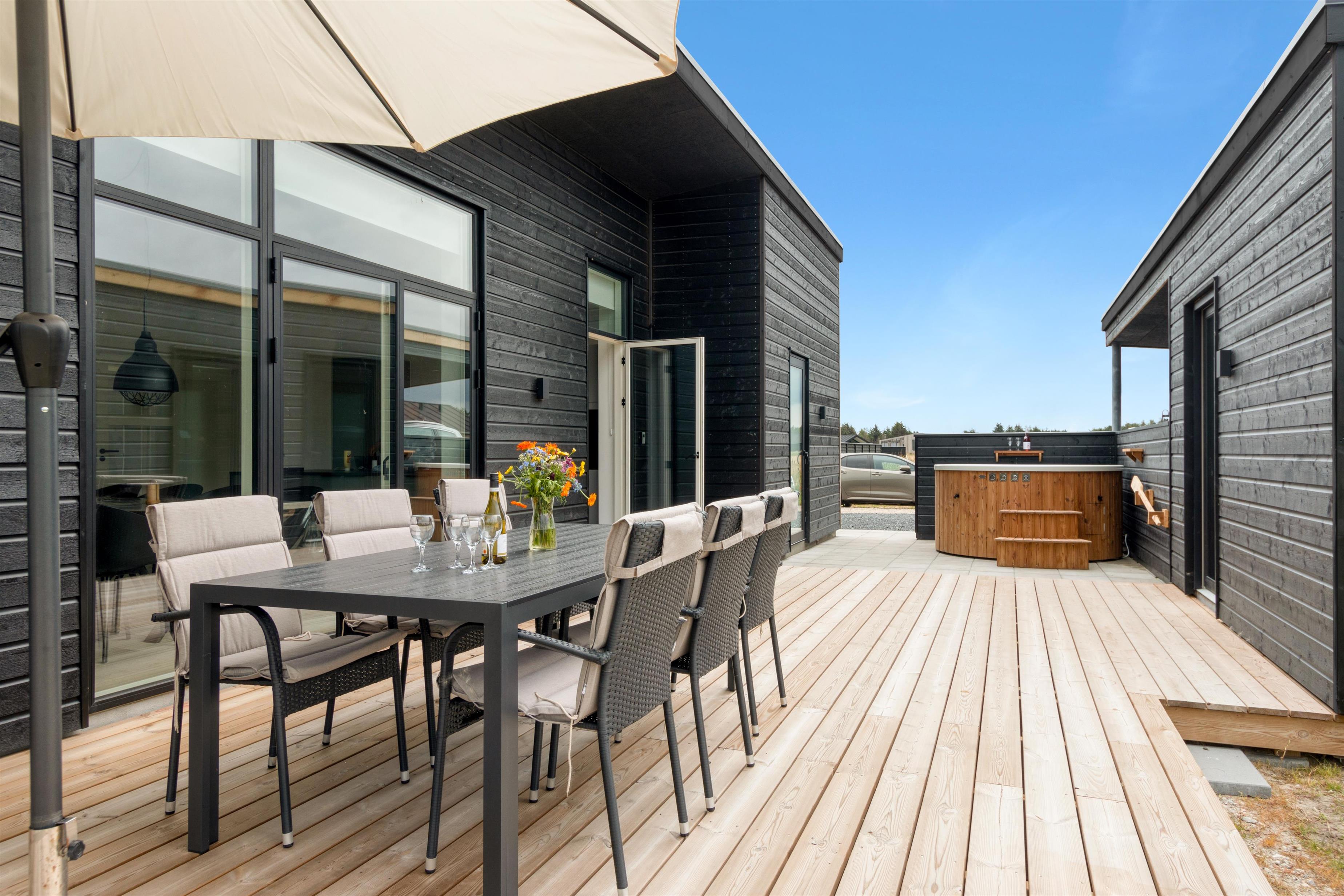 Moderne sommerhus i Løkken med stor terrasse, spa og tæt på strand og by.