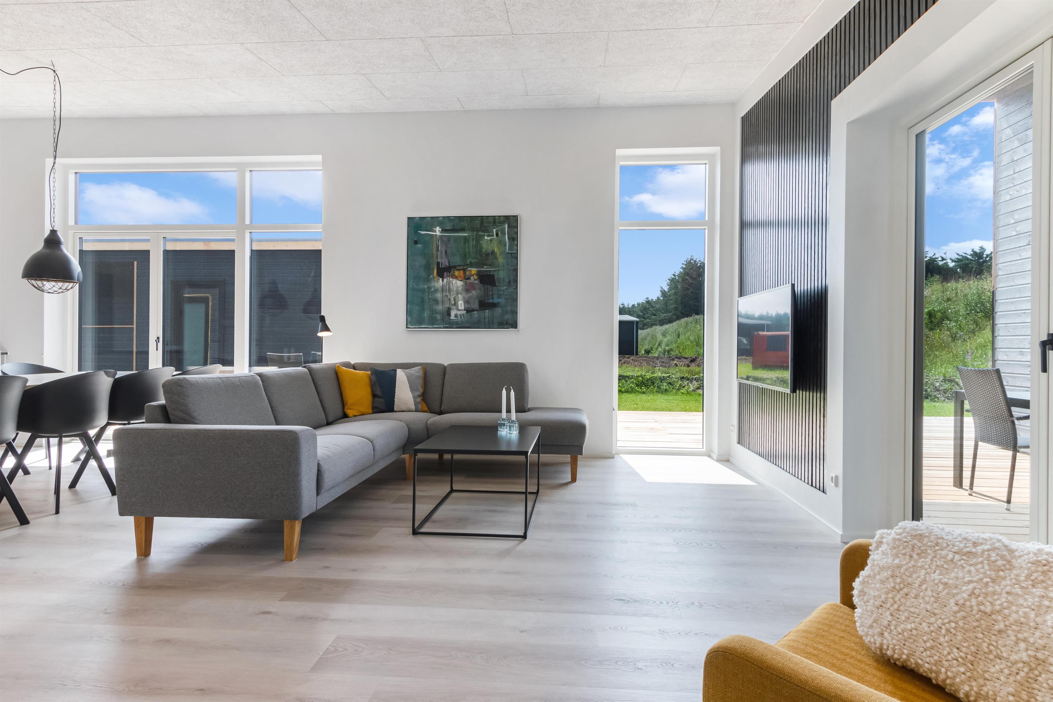 Sommerhuset har fire soverum med dobbeltsenge i hvert rum. Der er to badeværelser og et lyst og åbent køkken/alrum i forbindelse med stuen. Her er plads til 8 personer.