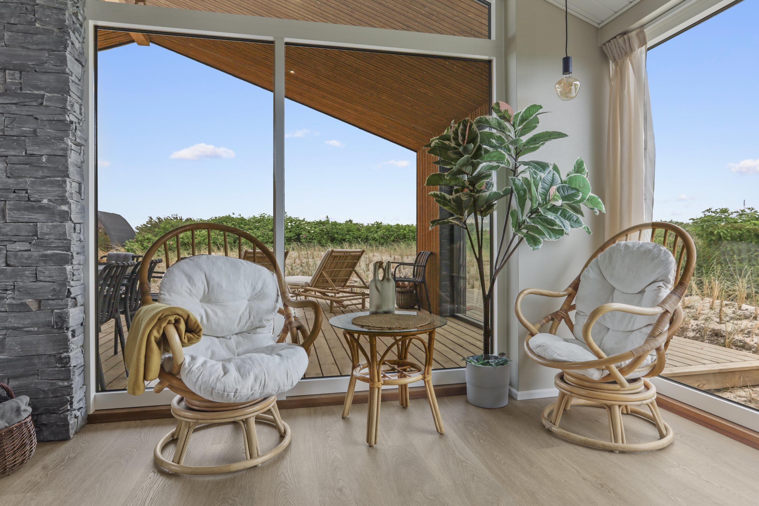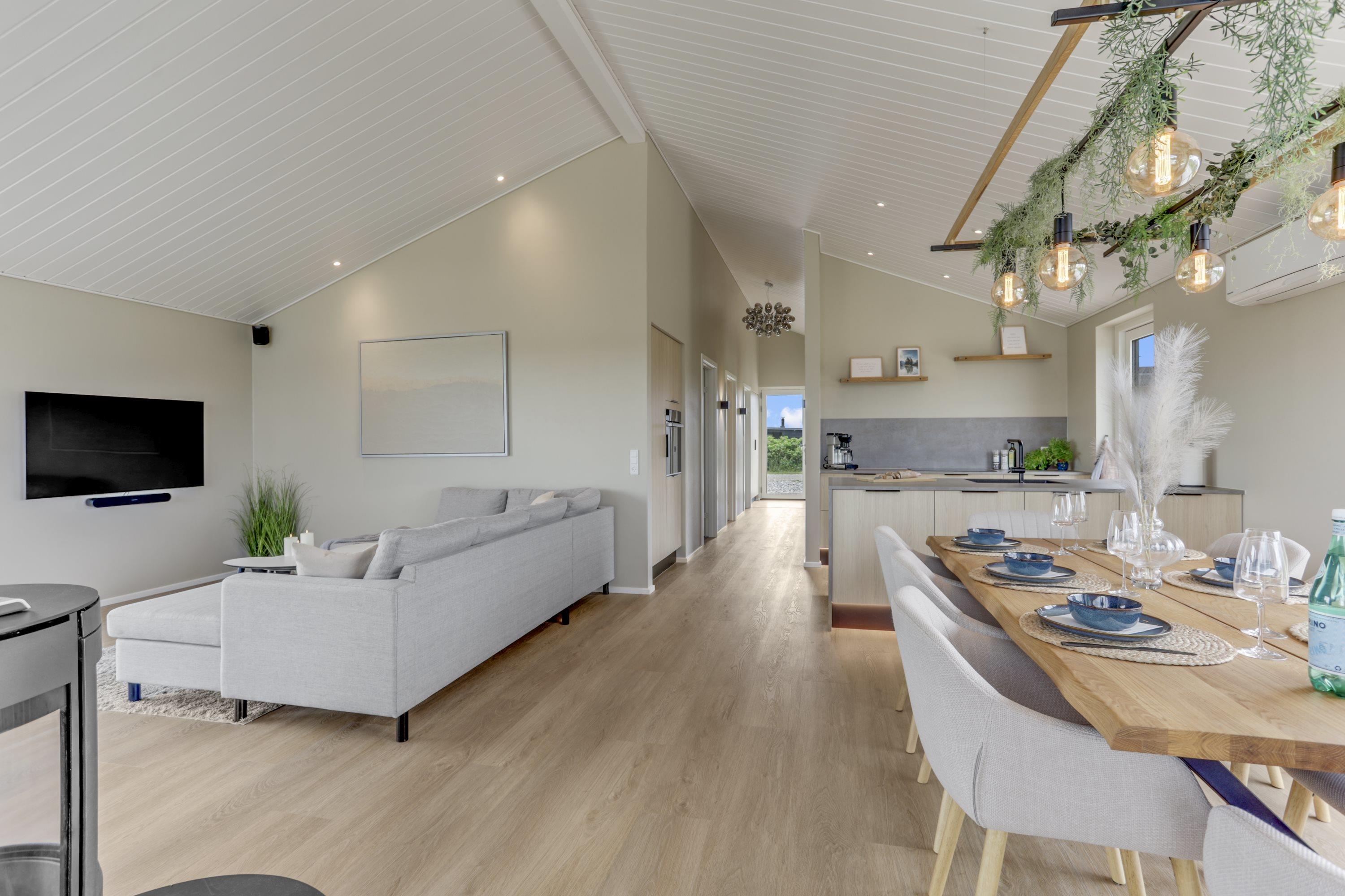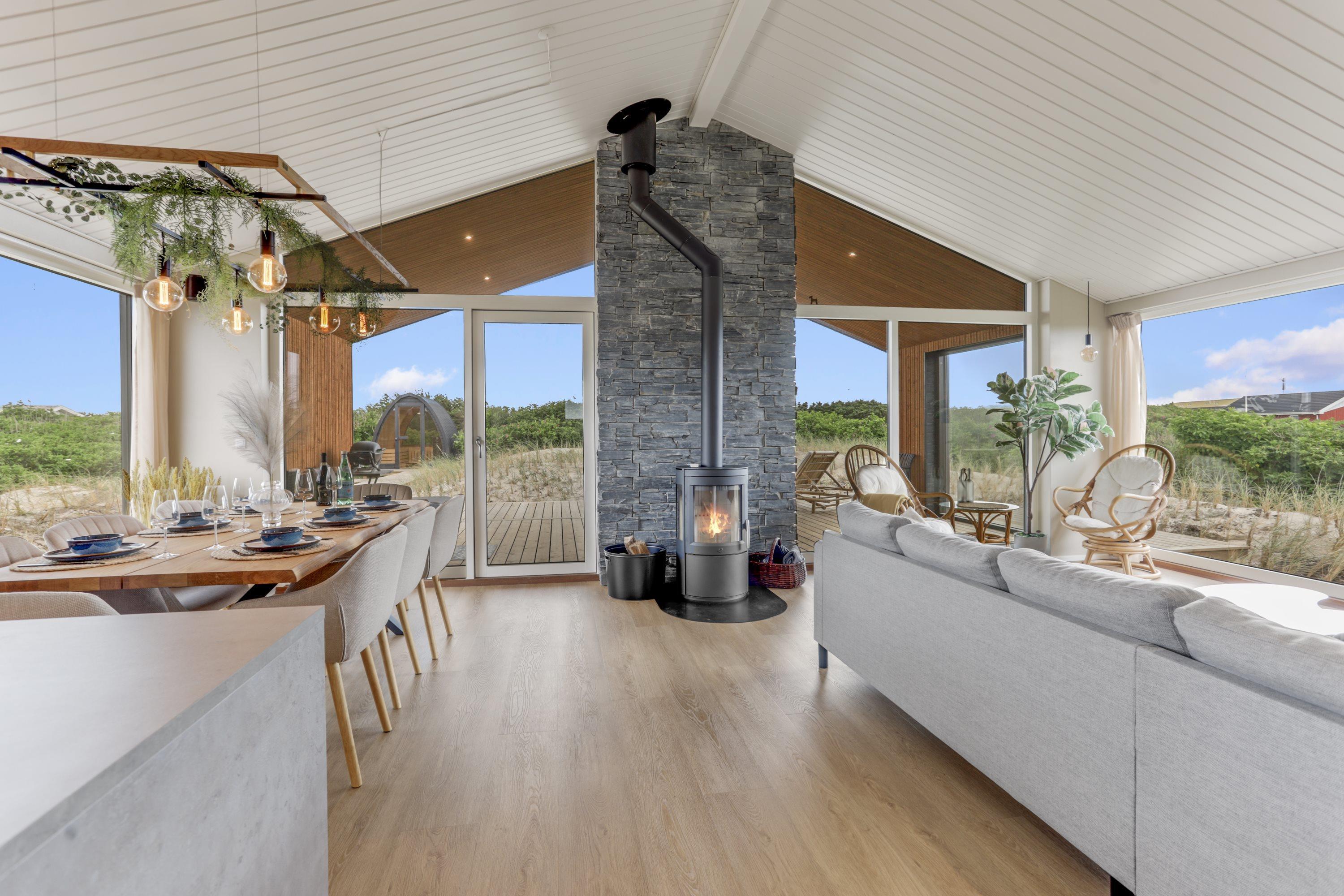Sommerhuset her på Tjørnevej er ganske enkelt imponerende! Med plads til 6 personer, kan I slænge jer på 106 vidunderlige kvadratmeter, hvor intet er overladt til tilfældighederne - ja, her er endda ladestander til elbilen. De 3 skønne soverum med tunge gardiner og rolige farver ligger i husets ene ende sammen med de 2 store badeværelser, mens husets anden ende rummer et stort og lyst køkken/alrum med højt til loftet og masser af vinduespartier ud mod de storslåede udearealer. Er vejret til det, er det oplagt at benytte de skønne terrasser - hvoraf de 28 kvm er overdækket - den dejlige solgård eller få en wellness-oplevelse i husets udendørs sauna, bruser og vildmarksspa. Er du mere til indendørs hygge, kan du slænge dig foran brændeovnen og nyde den smukke udsigt.