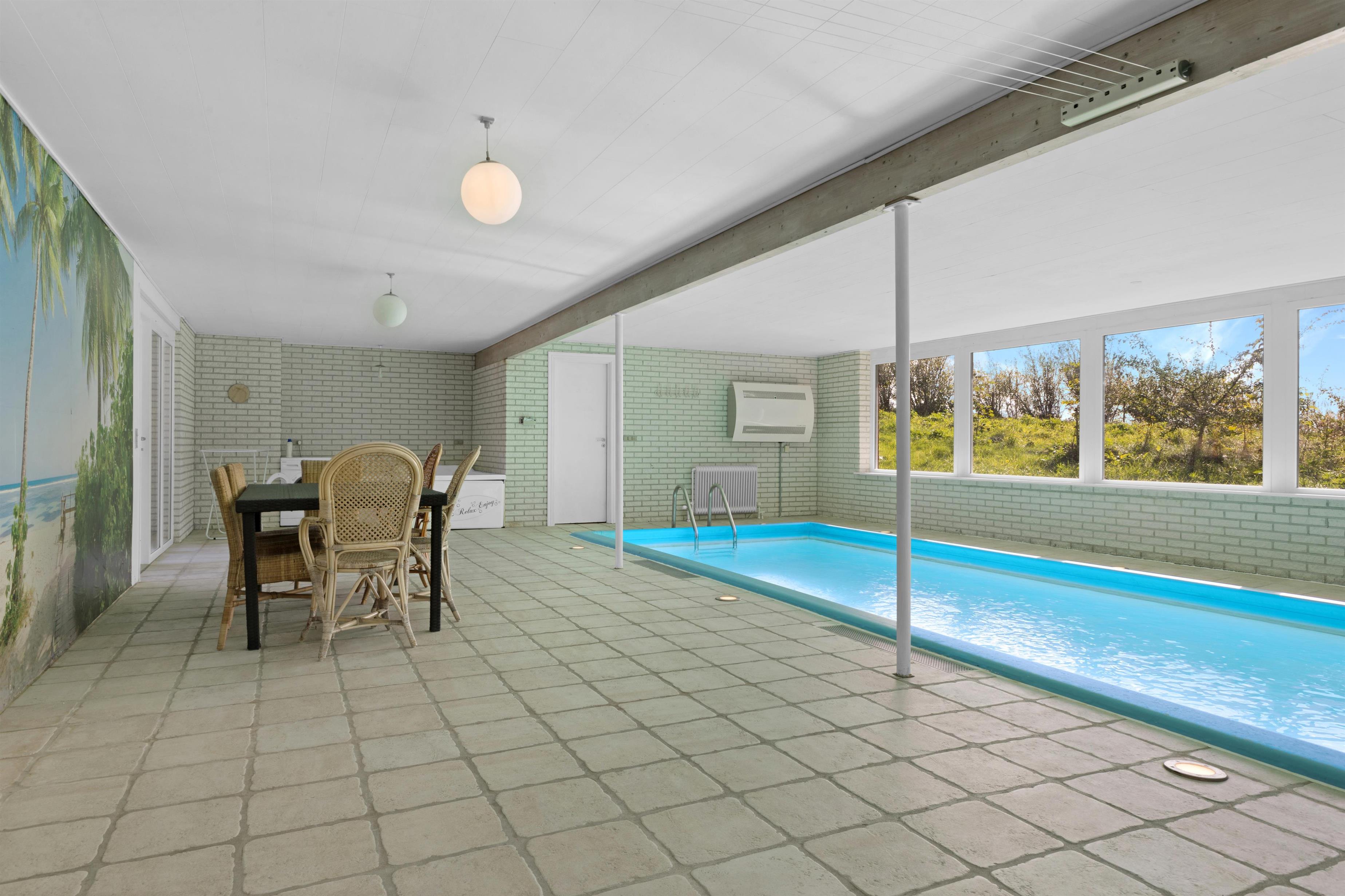Dette store sommerhus med pool, spa og sauna rummer plads til 12 personer, fordelt på husets to etager. Stueetagen udgør poolområde med spa, sauna og badeværelse, køkken, toilet og et stort fællesrum med plads til spisning og hygge samt soverum. På første sal findes soverum og badeværelse samt en udestue. Huset er ikke et moderne og minimalistisk hus, men et super hyggeligt hus, hvor den store pool vitterligt er husets kerne!
