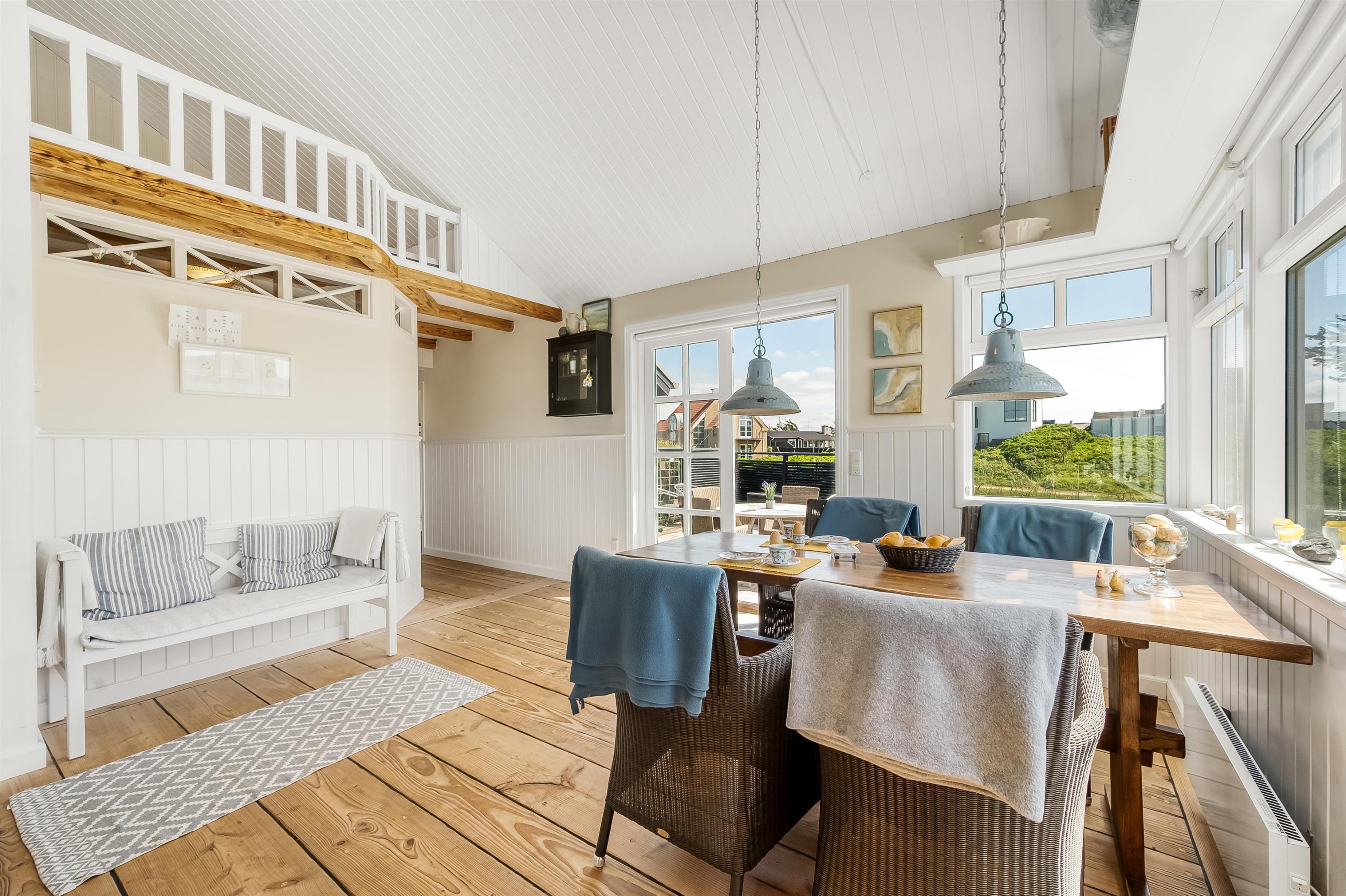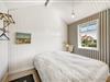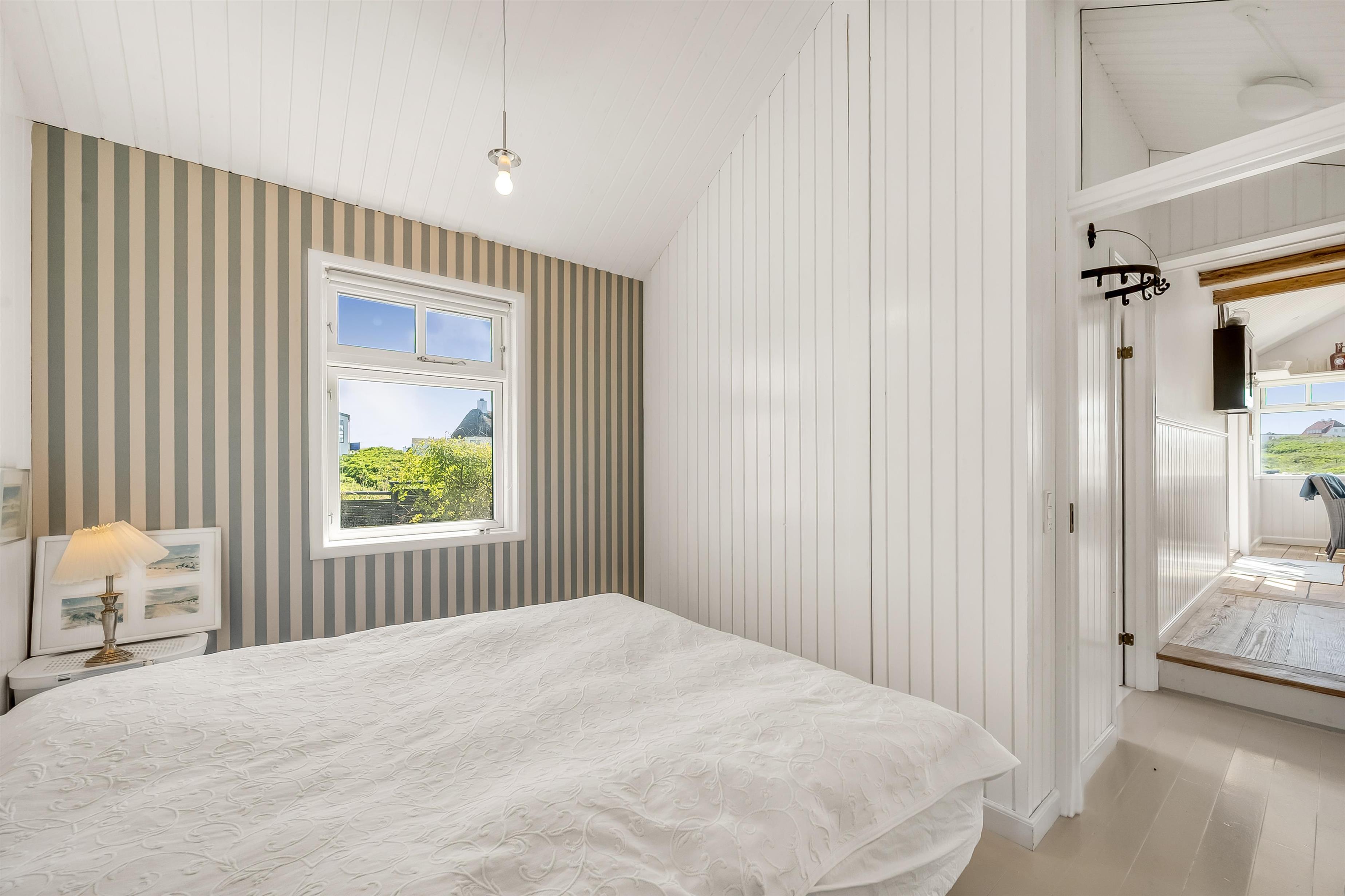 De to soveværelser og husets badeværelse ligger i forlængelse af spisestuen. Alle rum er dejlige og emmer af dansk sommerhusferie med en badehotelsstil, der er lys og indbydende.