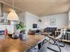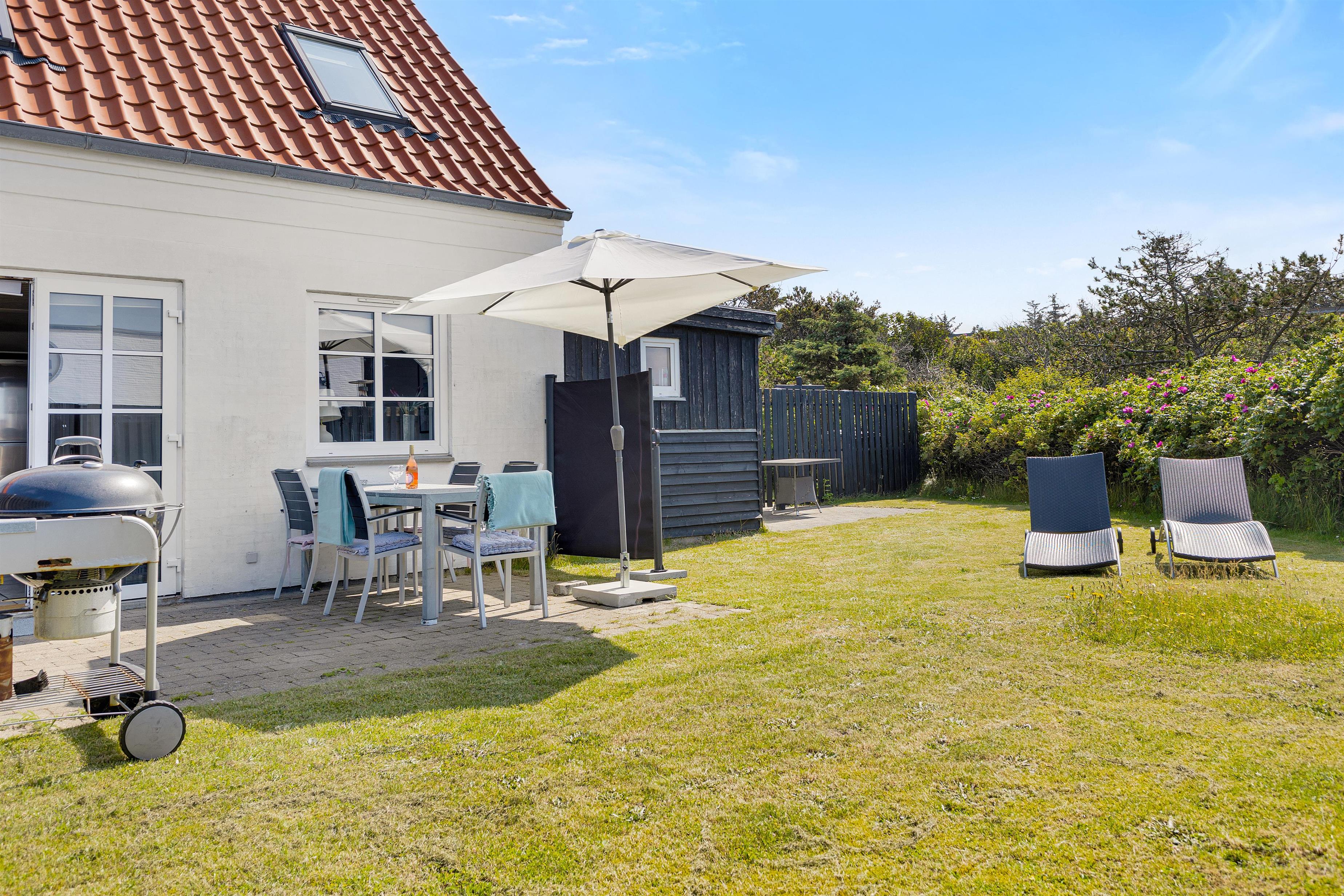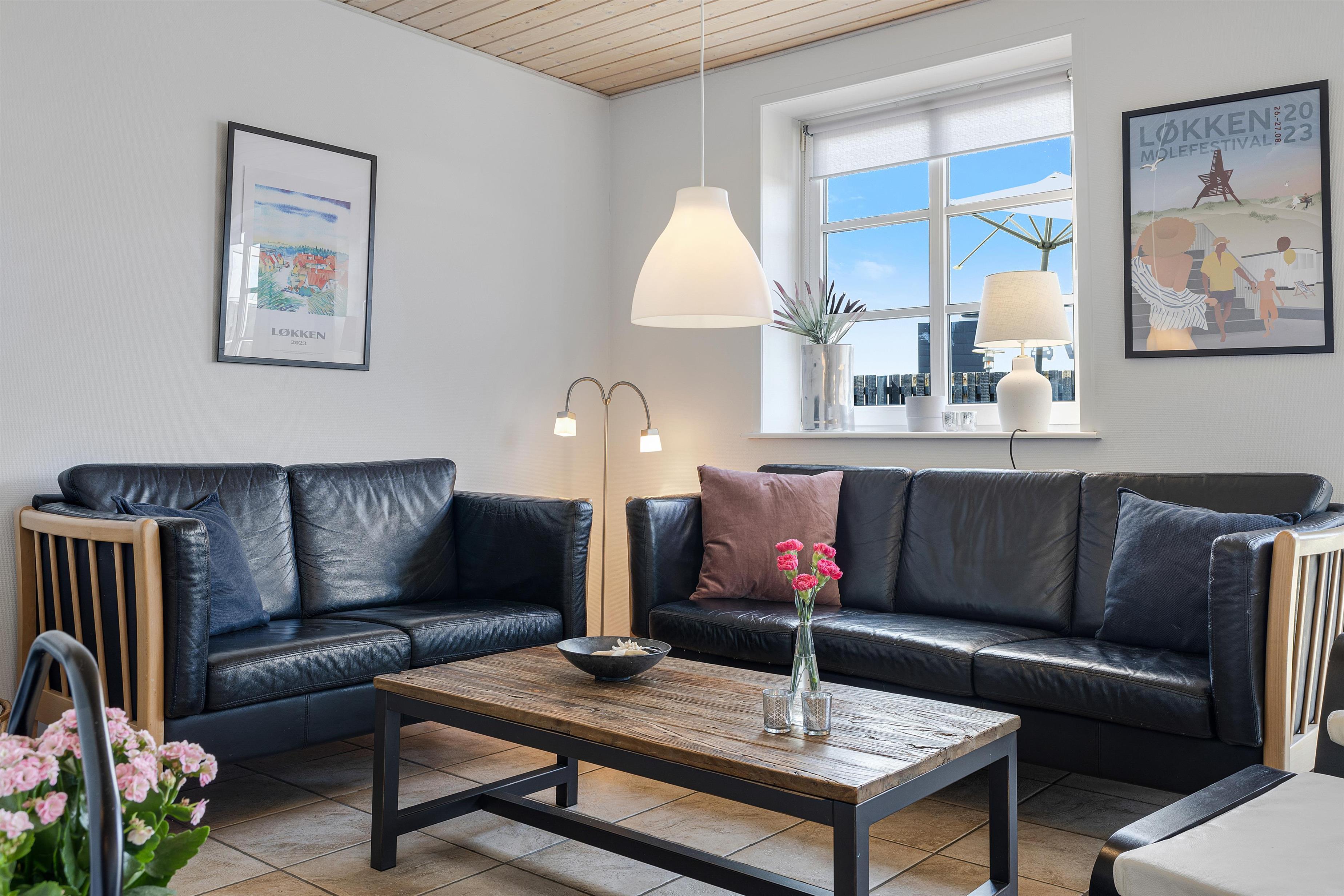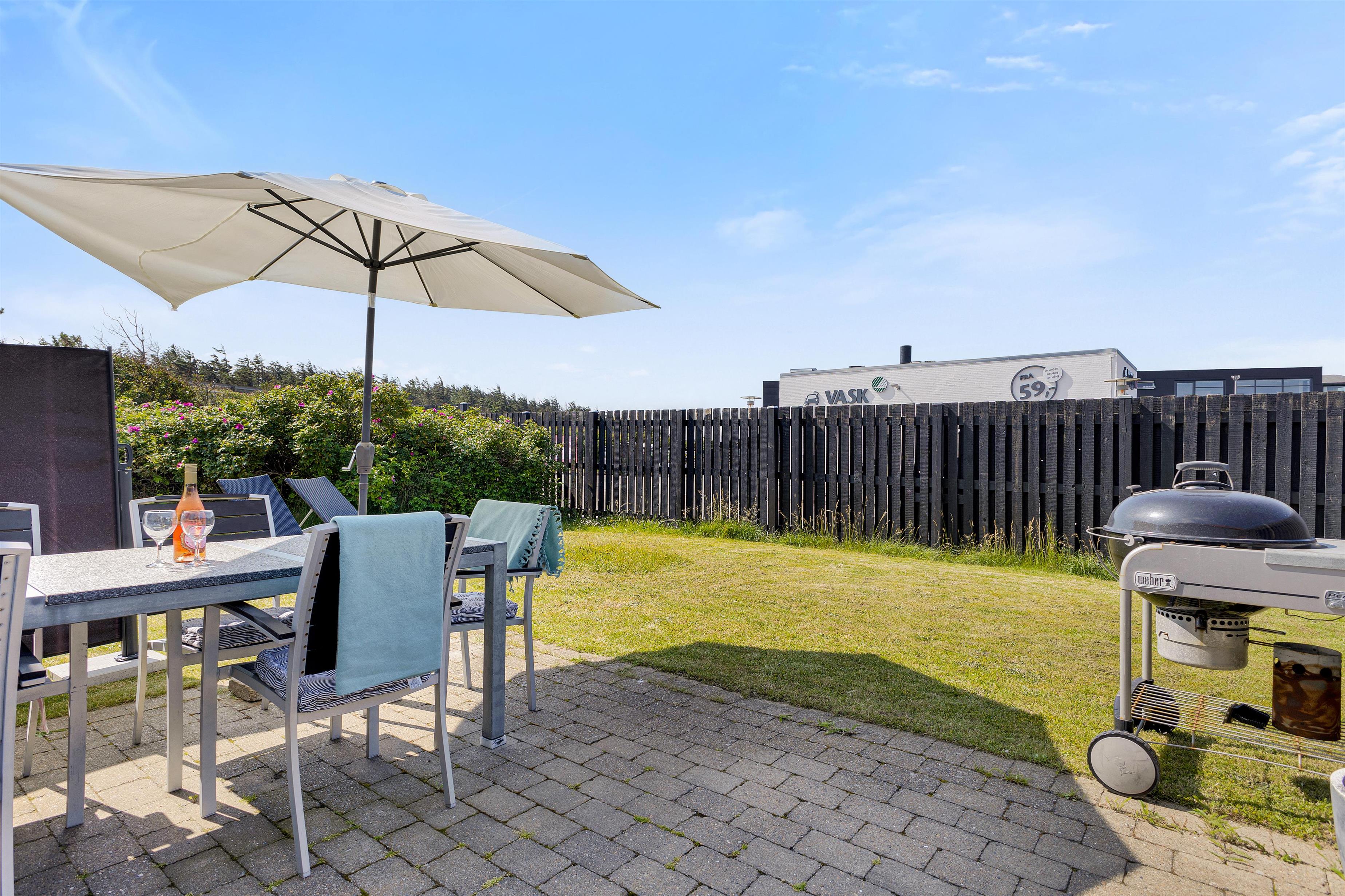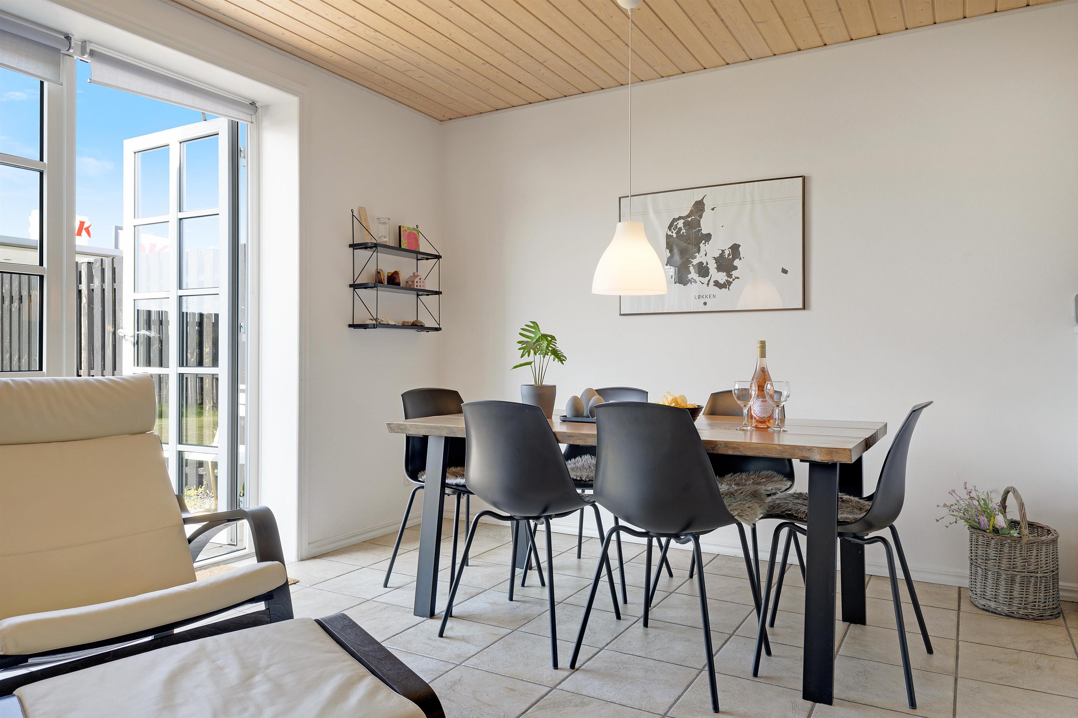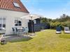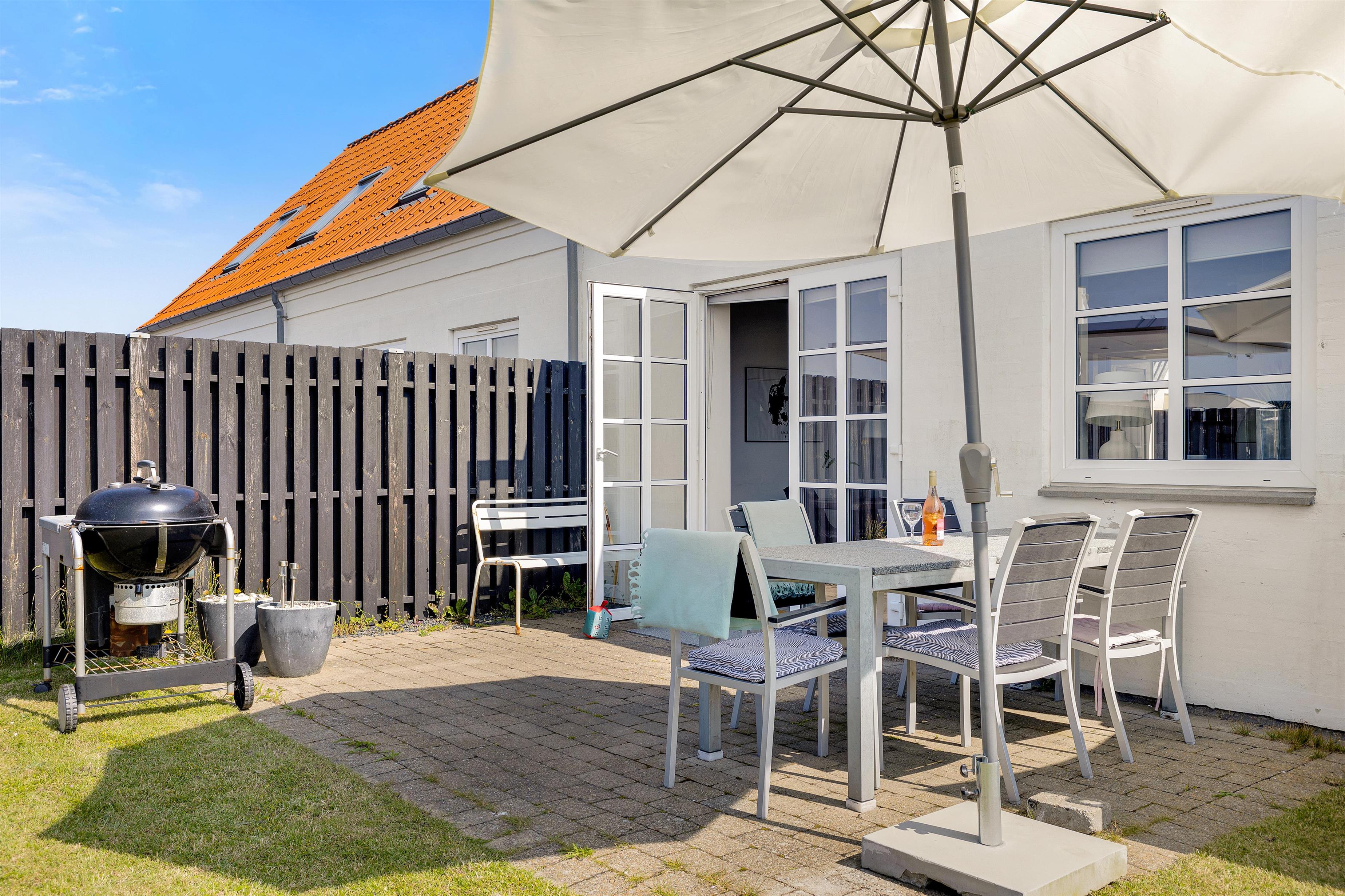 Fra det hyggelige og rummelige køkken/alrum har du udgang til husets have med spiseplads til 6 personer. Da huset er et enderækkehus, har du hele enden af bygningen til at finde dejlig læ, nærmest lige meget hvilken vej vinden blæser. Da det er tilladt at medbringe en mindre hund, er den afskærmede have helt optimal. Der er under 1 kilometer til Løkken Strand, endnu kortere vej til byens gågademiljø, og indkøbsmulighederne kan du se fra haven.