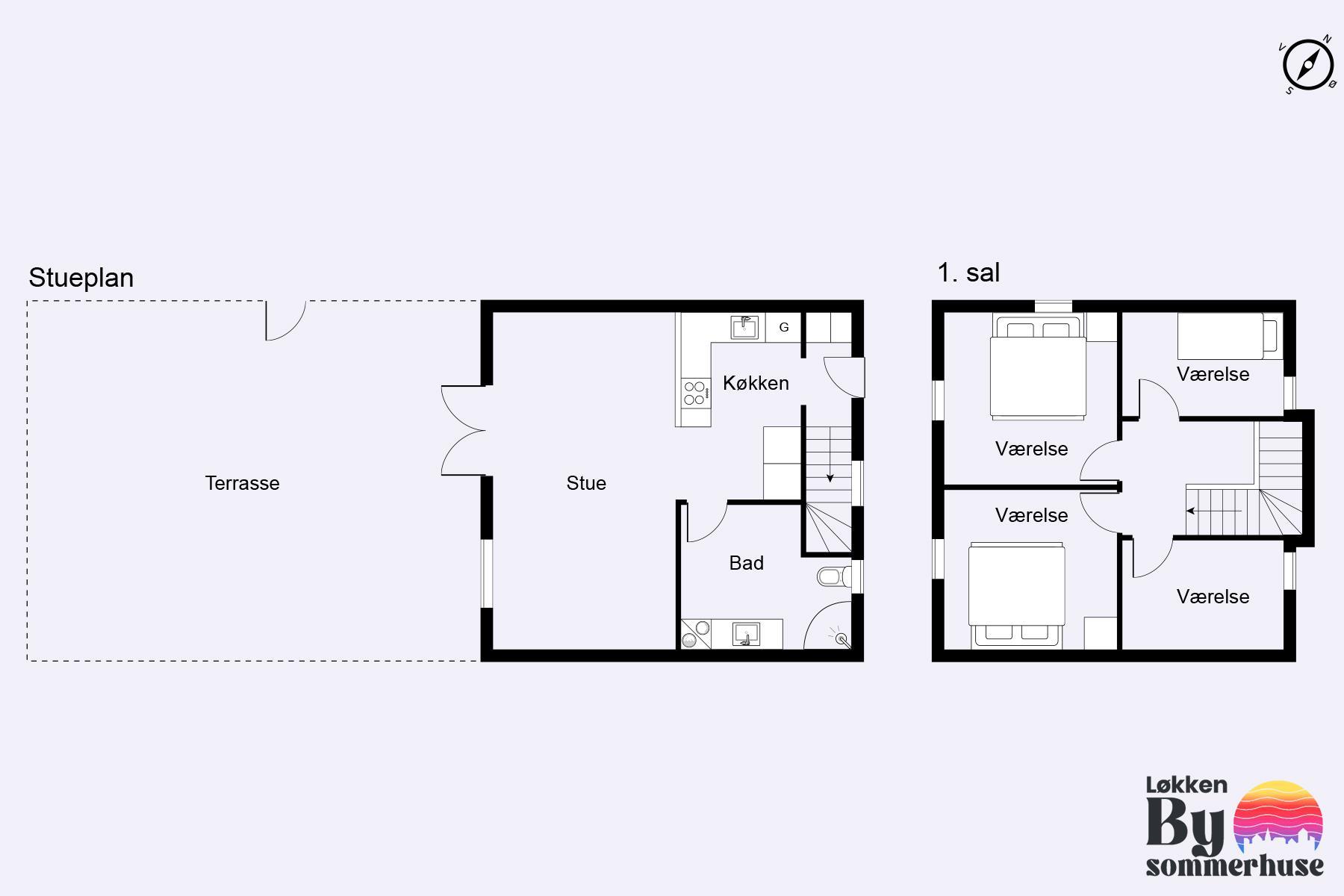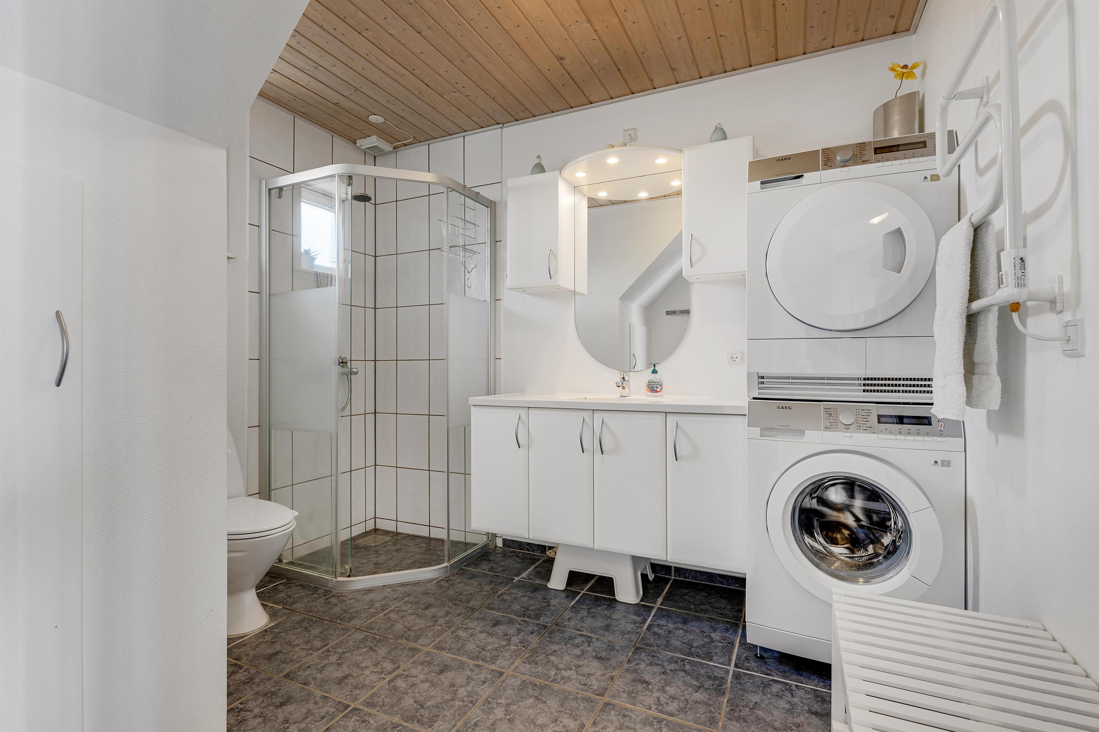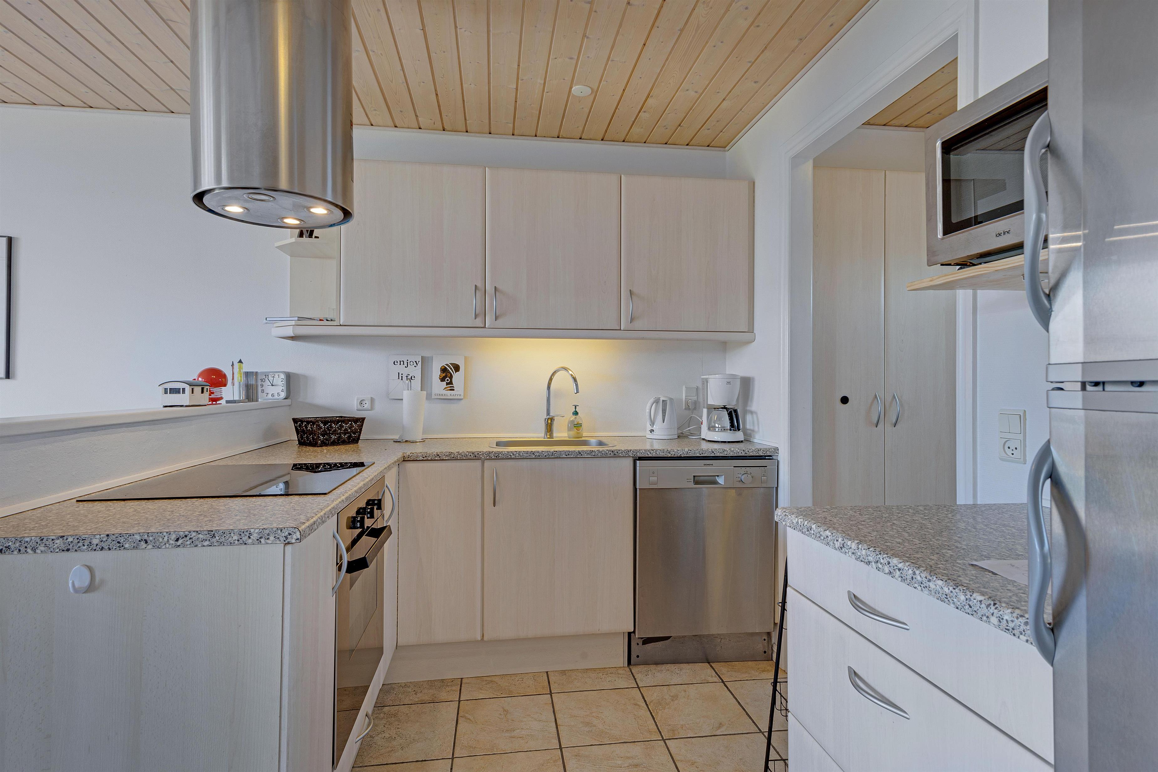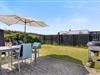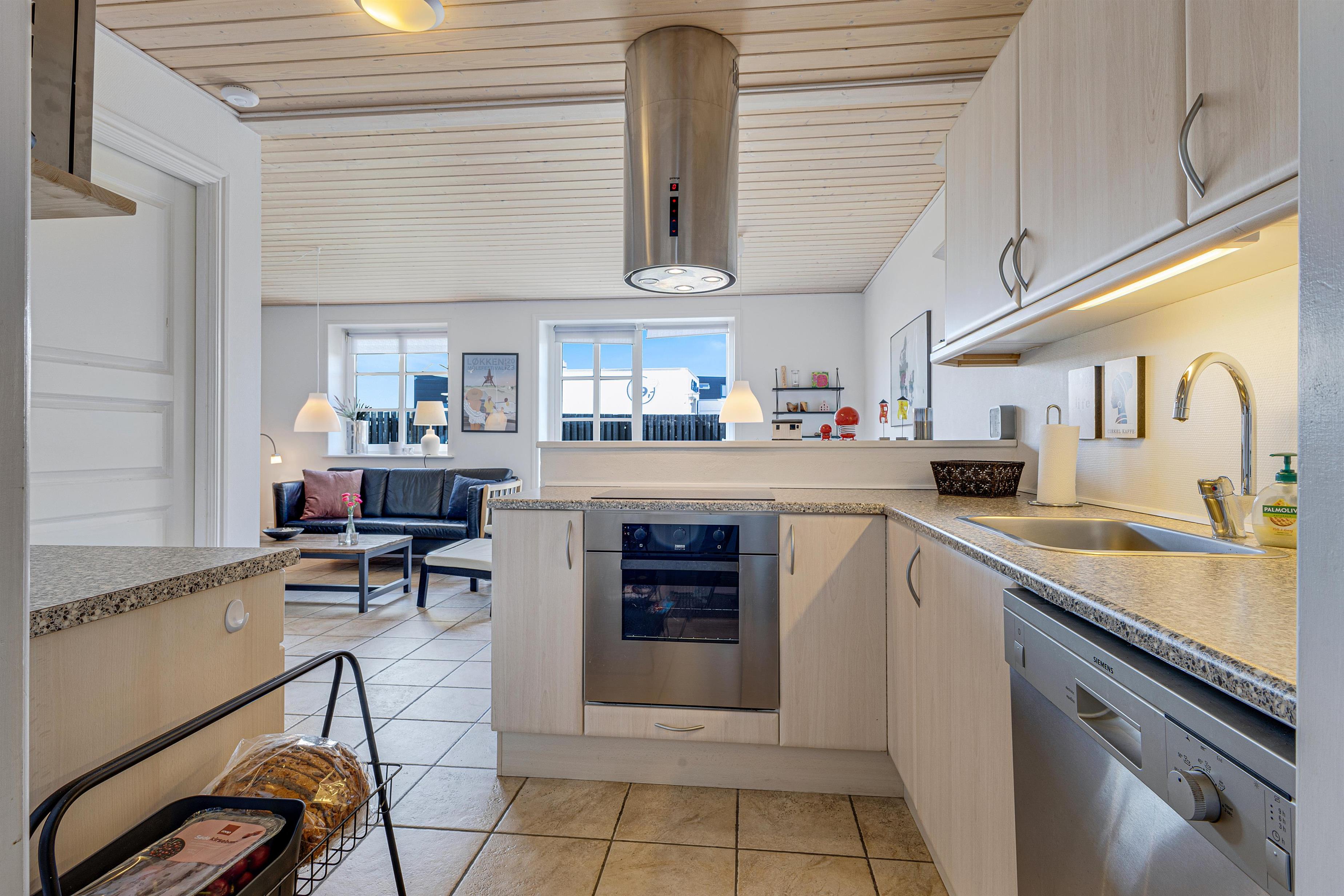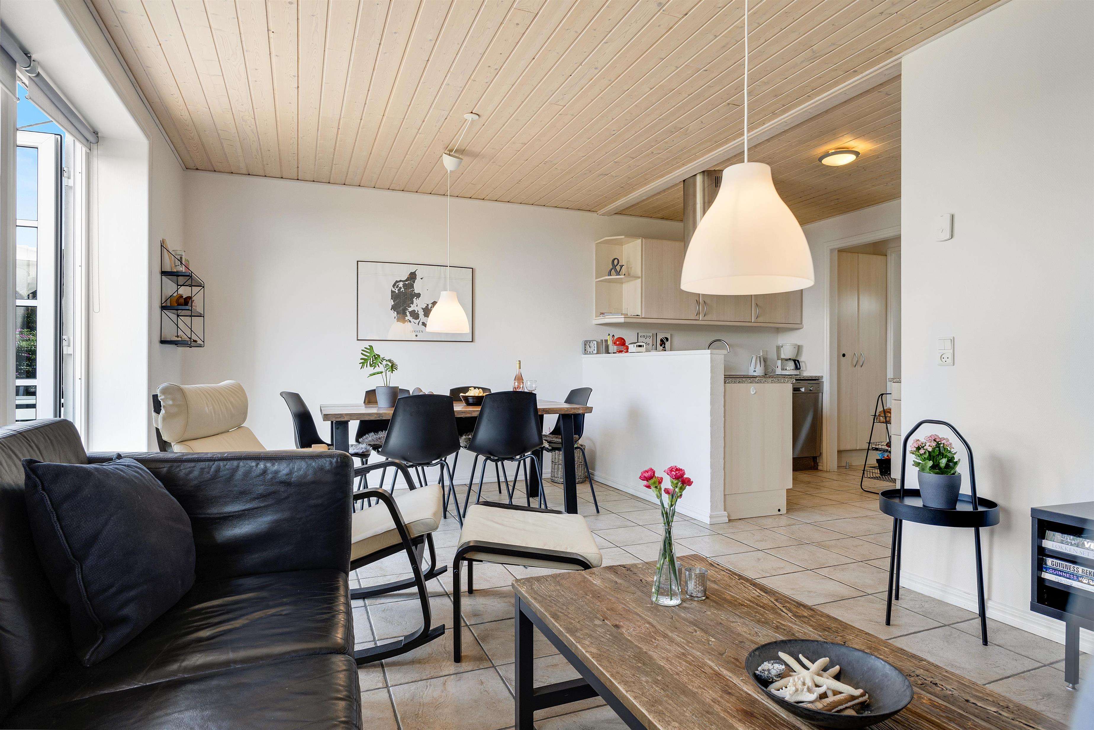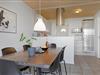 Fra det hyggelige og rummelige køkken/alrum har du udgang til husets have med spiseplads til 6 personer. Da huset er et enderækkehus, har du hele enden af bygningen til at finde dejlig læ, nærmest lige meget hvilken vej vinden blæser. Da det er tilladt at medbringe en mindre hund, er den afskærmede have helt optimal. Der er under 1 kilometer til Løkken Strand, endnu kortere vej til byens gågademiljø, og indkøbsmulighederne kan du se fra haven.