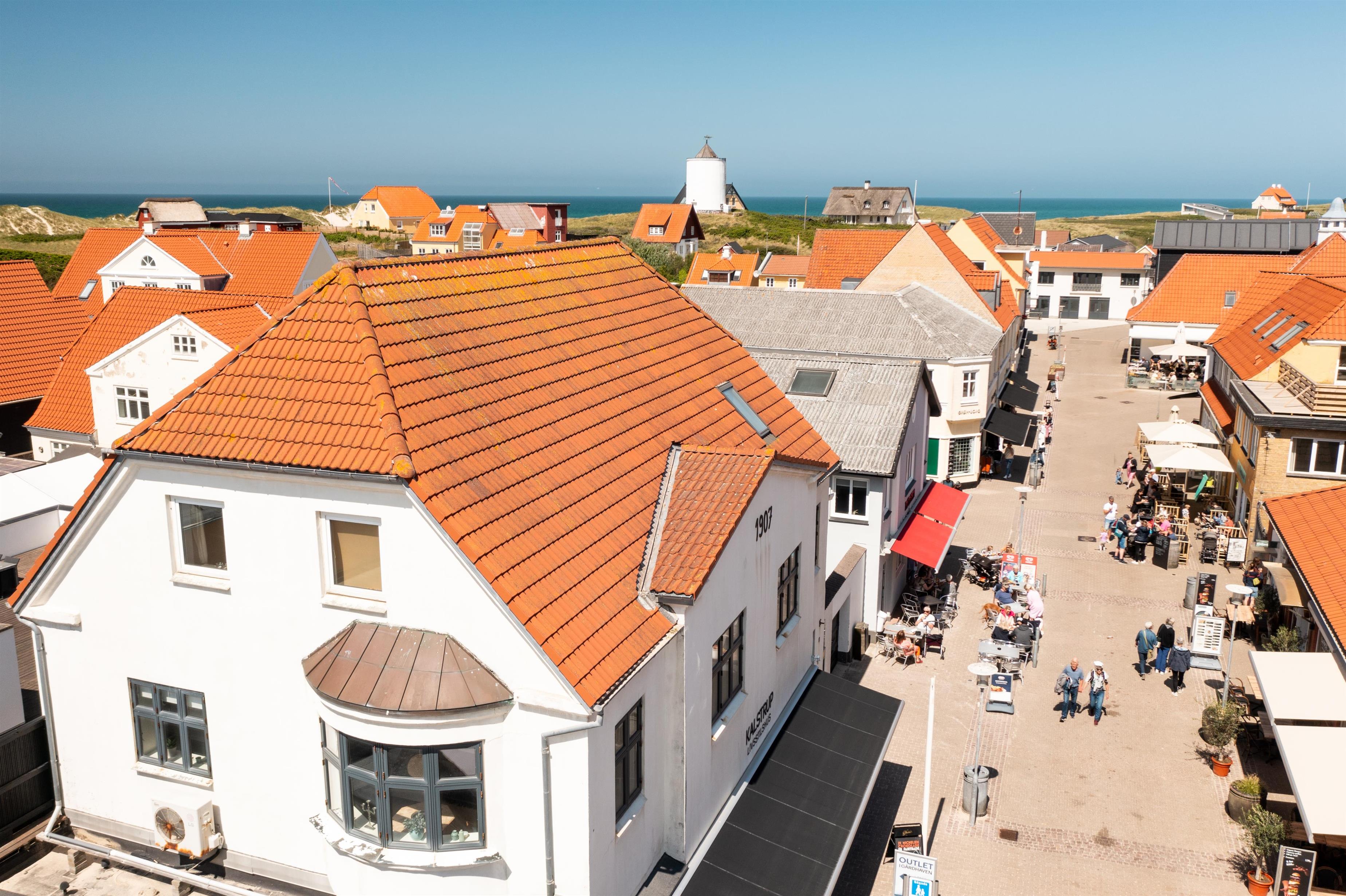 Lejligheden har en unik beliggenhed midt i gågaden i Løkken, oven på en af byens spændende butikker. Fra stuen kan du nyde udsigten over gågaden og bylivet, mens du samtidig har Vesterhavet lige om hjørnet. Adgangen til lejligheden sker via en indgang i gågaden, markeret med "By Sommerhuse". Herfra er der blot få skridt til Søndre Strandvej, der leder dig direkte ned til stranden og læmolen.