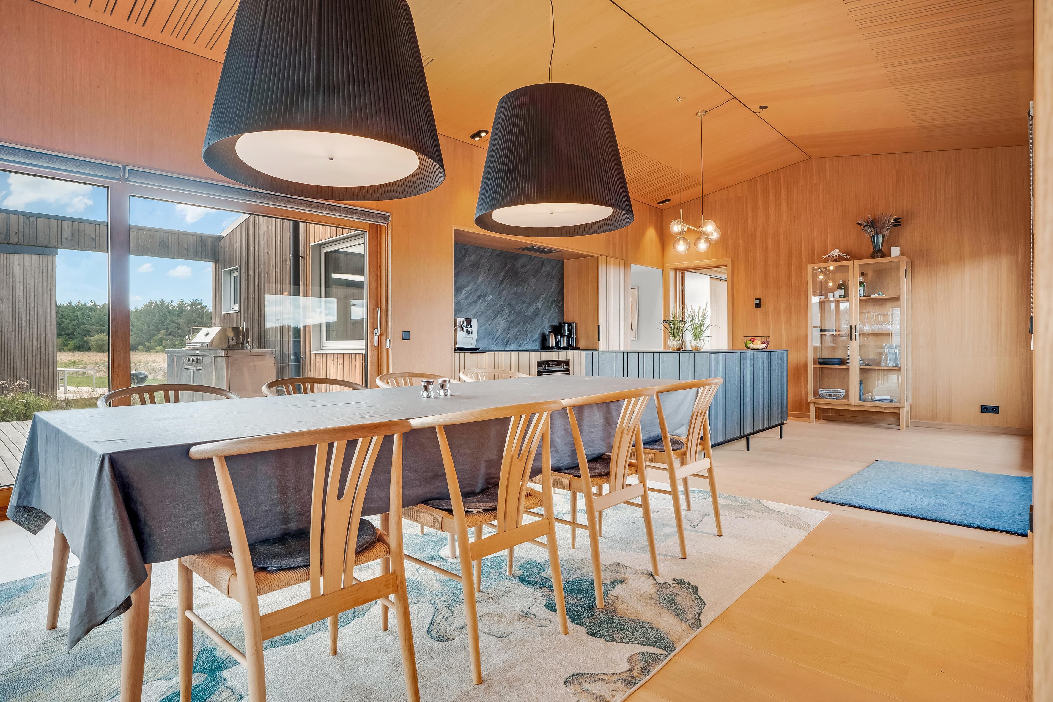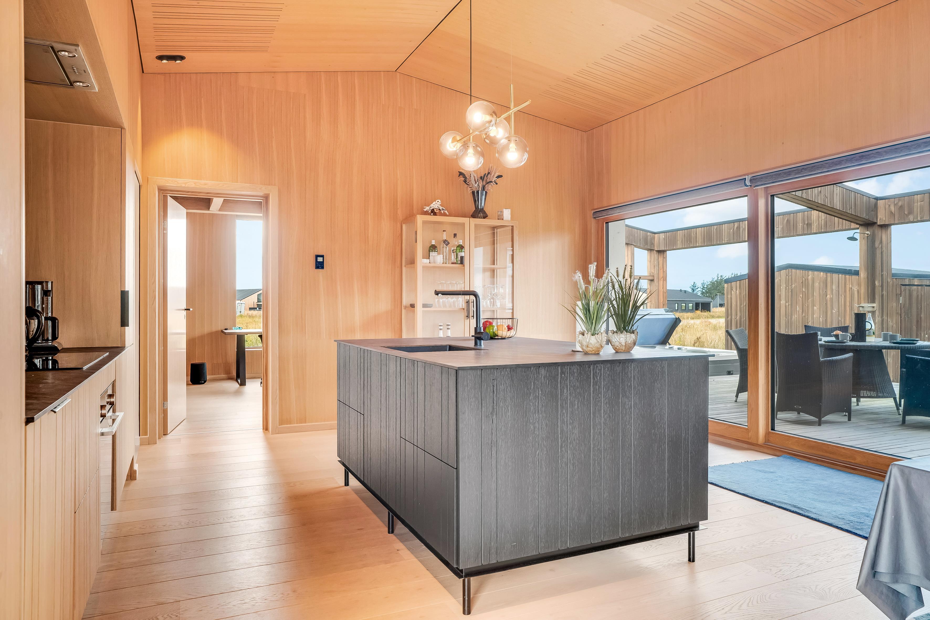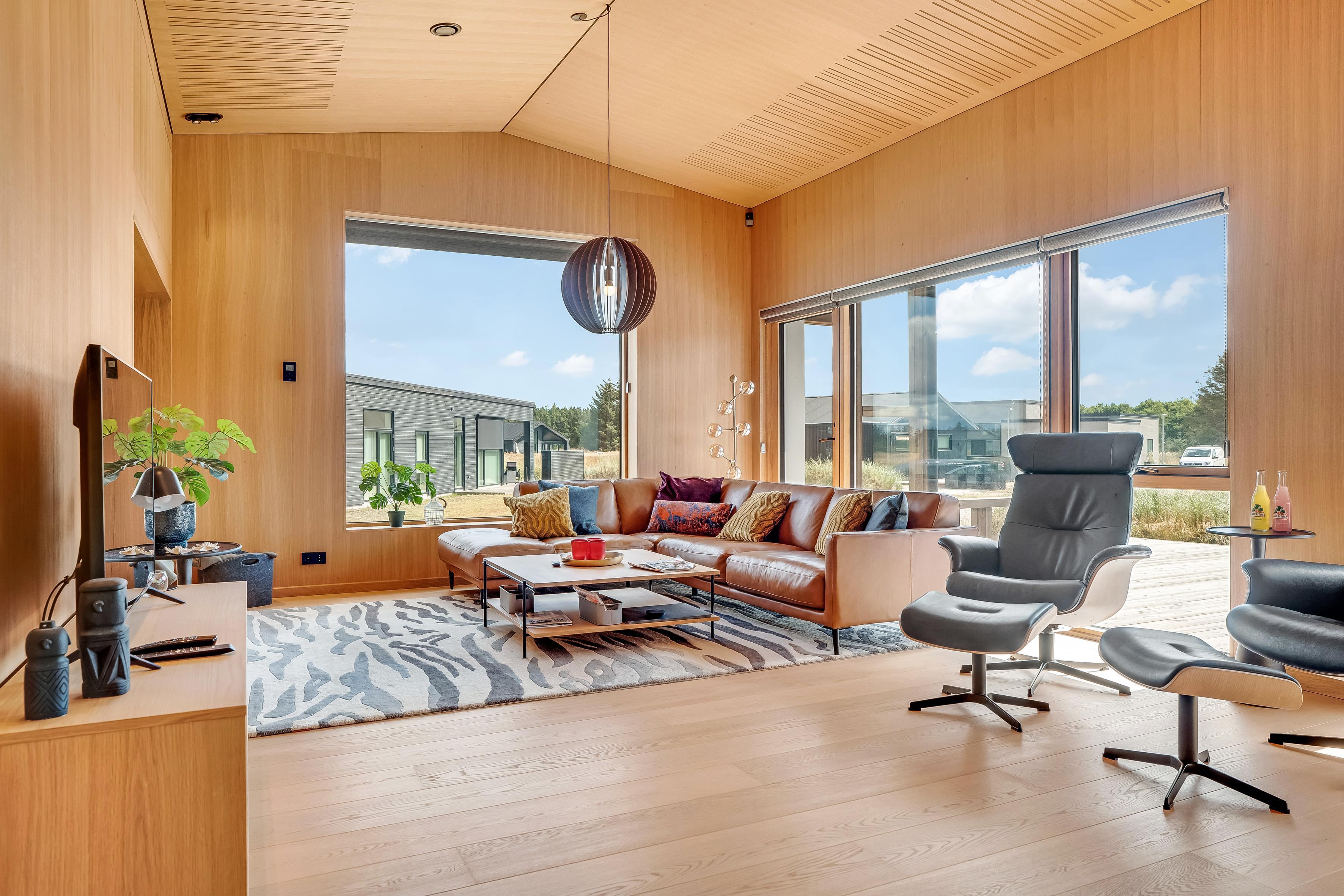 Sommerhuset rummer op til 7 gæster fordelt på 5 soveværelser med tre dobbeltsenge og to enkeltsenge. Hjertet af huset er det åbne køkken-alrum, som ligger i direkte forbindelse med stuen og byder på en lys, funktionel og velovervejet indretning i klassisk dansk design. De to badeværelser er både rummelige og elegant udstyret, og huset er placeret i et moderne nybyggerkvarter med både helårsboliger og ferieboliger side om side.
