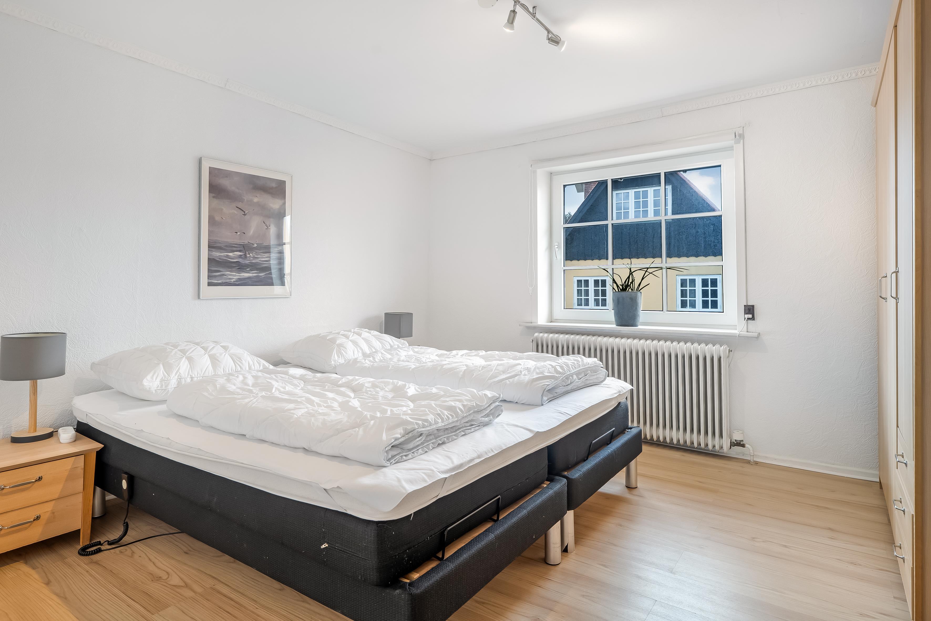 Huset er dejligt lyst med det store køkkenalrum og stue, hvorfra du kan tilgå den skønne gårdhave og den hyggelige udestue, hvor du kan være helt privat trods husets centrale placering midt i byen. Her er hele fire soverum og fordelt på to etager er sengefordelingen som følger: