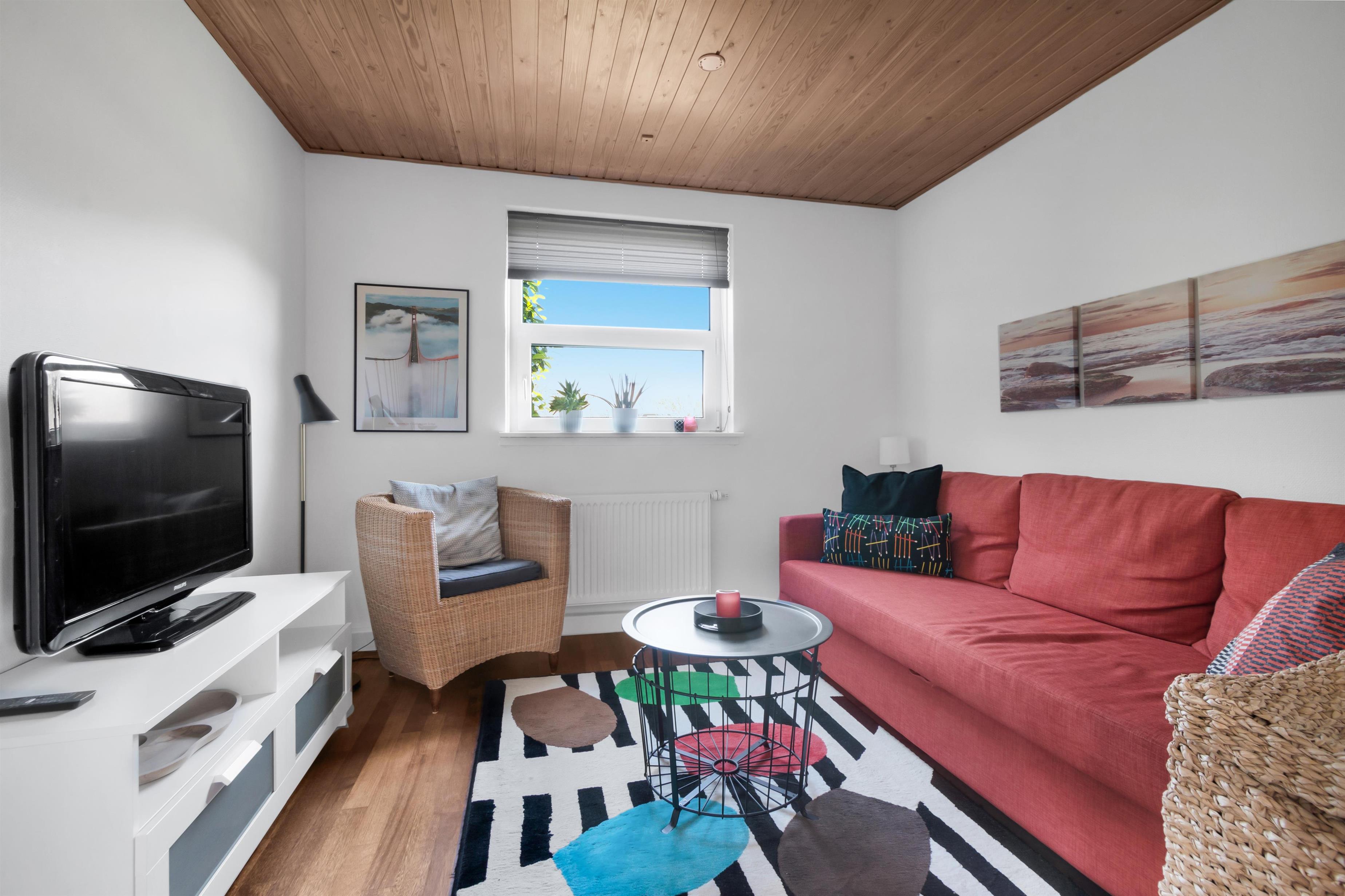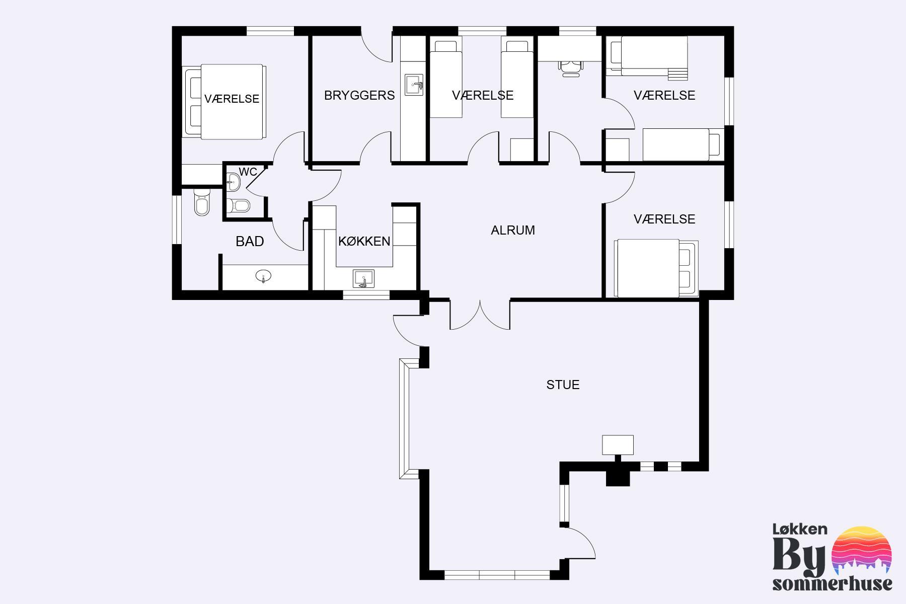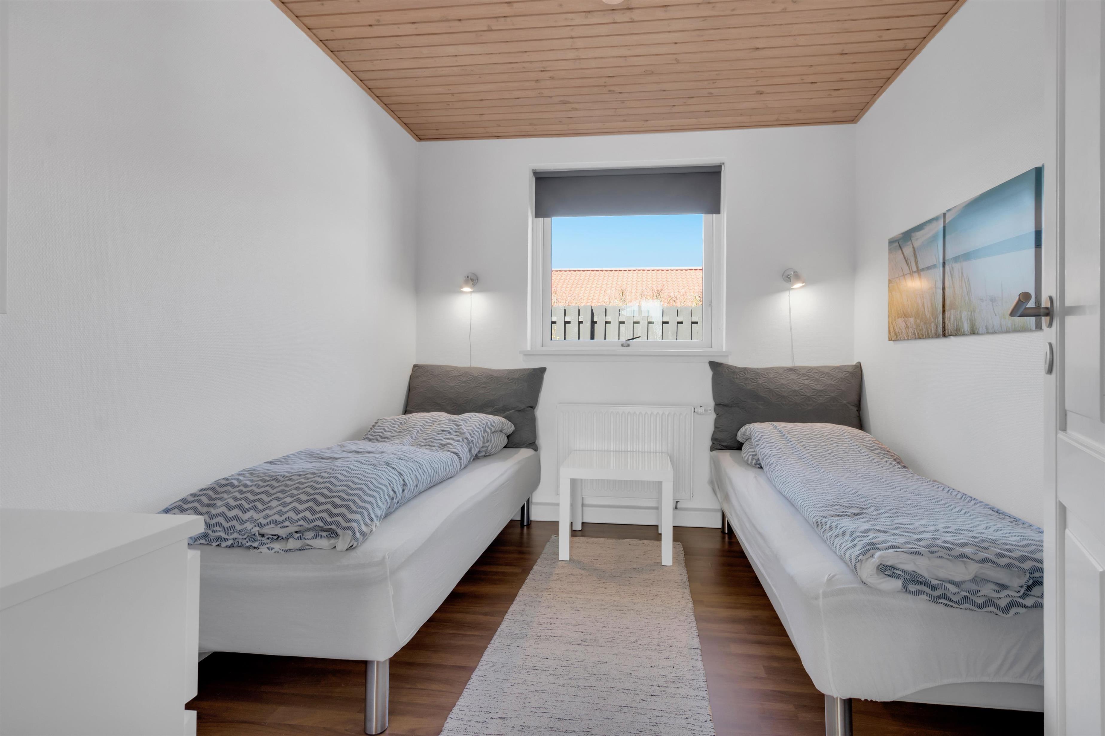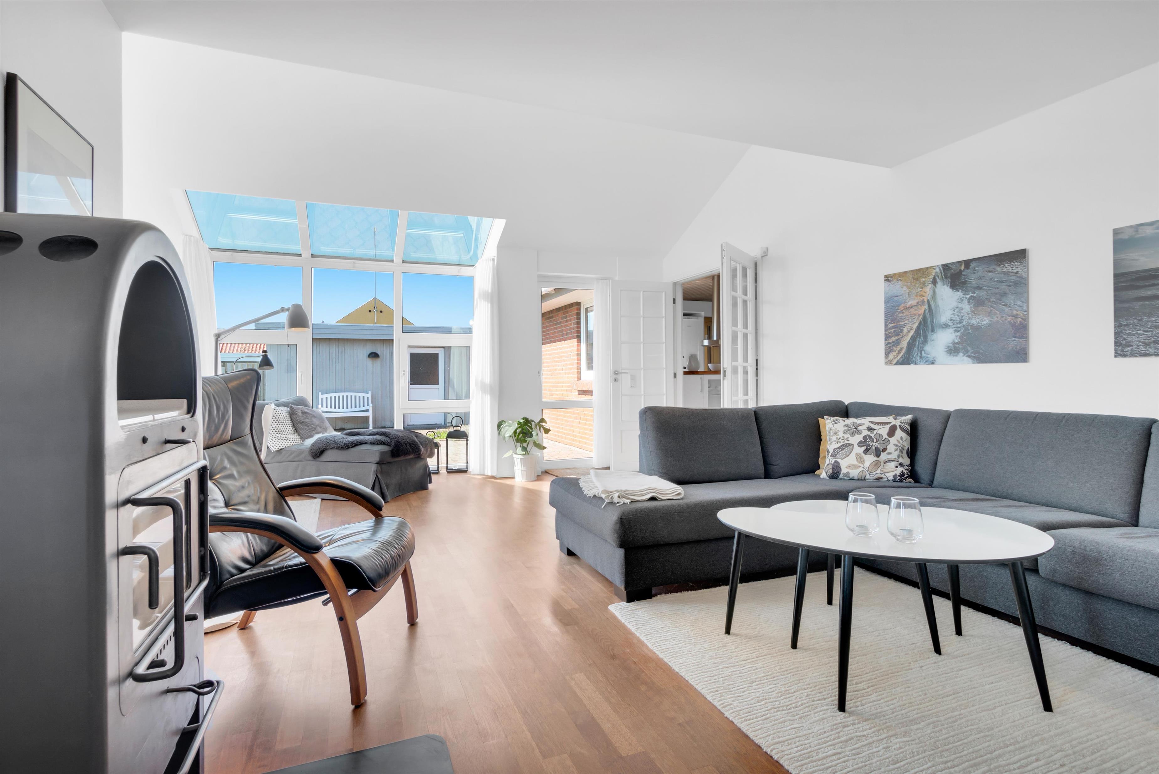 Ud over at boligen kan rumme hele 9 personer, må husets hjerte siges at være det utroligt skønne opholdsrum med store vinduespartier og et fantastisk lysindfald. Her er en chaiselong at slænge sig i, et stort spisebord samt en rigtig flydersofa foran brændeovnen. Til den ene side er der dobbeltdøre fra opholdsrummet og ud til køkkenet, hvor der ligeledes er ekstra spiseplads, og til den anden side er der udgang til den dejlige, afskærmede have. Der er fire soverum og sovepladserne er fordelt på køjesenge, enkeltsenge, dobbeltseng og sovesofa - og dertil en barneseng. Køkkenet er dejligt åbent og der er fjernvarme i huset, hvilket er en billig varmekilde. Der er et enkelt badeværelse med toilet, et ekstra toilet og et skønt bryggers.