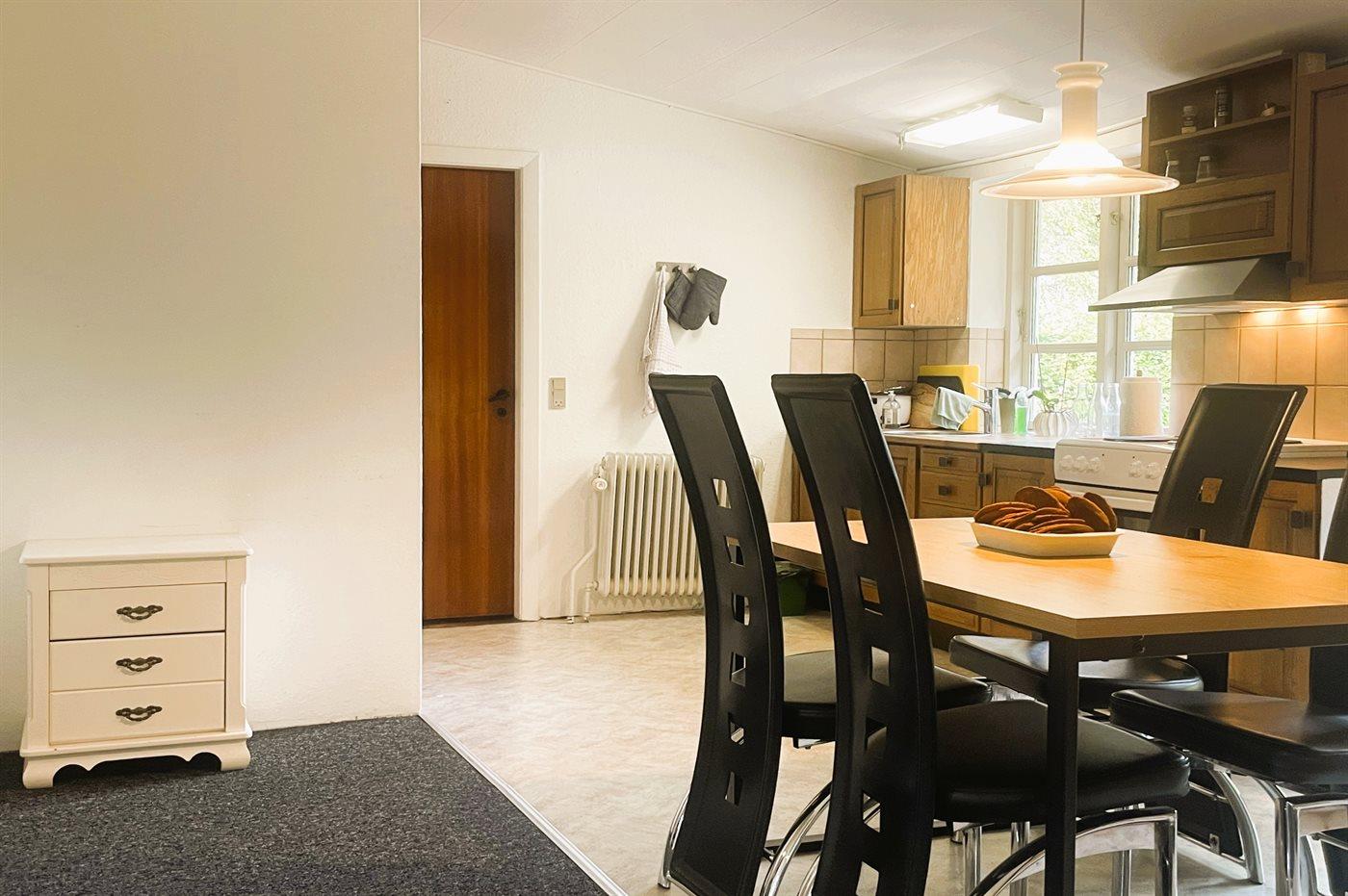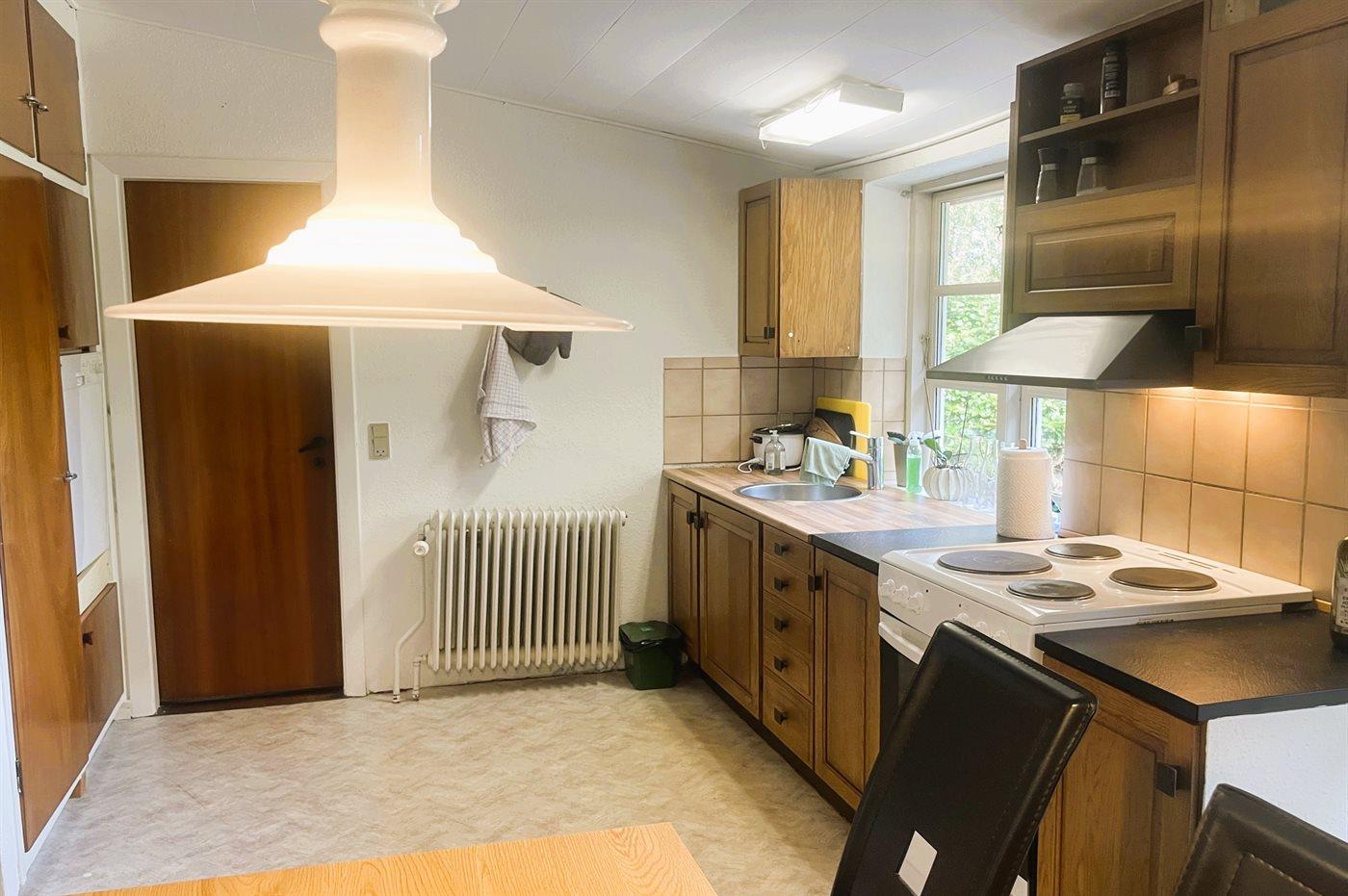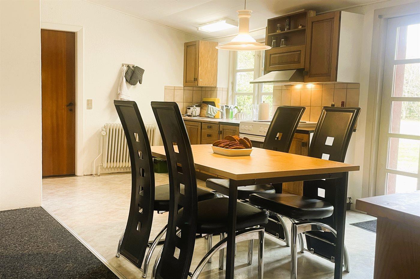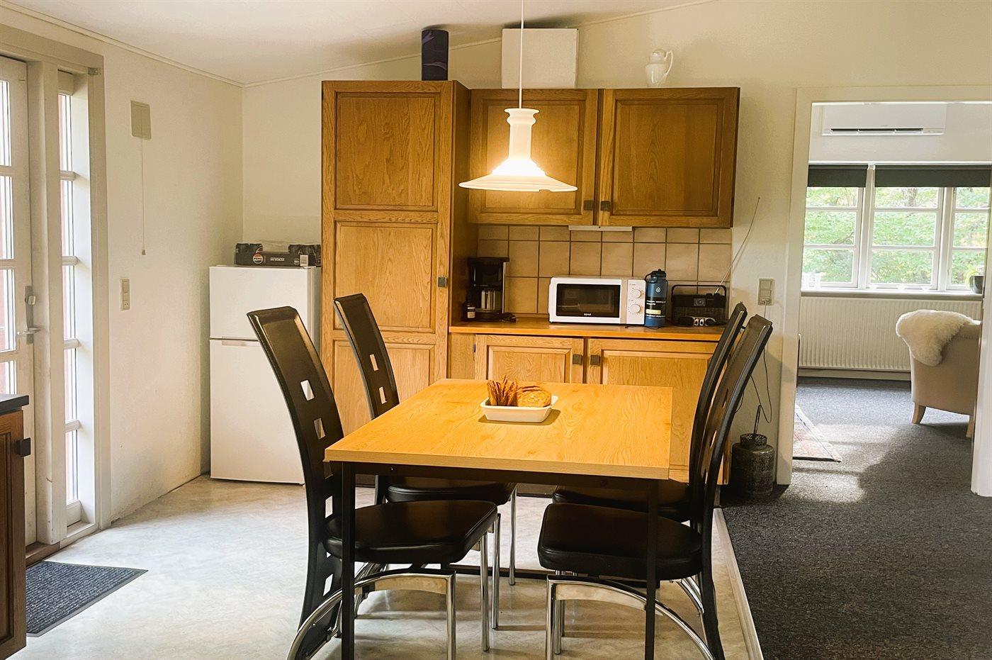 Køkkenet er udstyret med 1 køleskab. Der er 4 elkogeplader, varmluftovn, mikrobølgeovn samt opvaskemaskine.