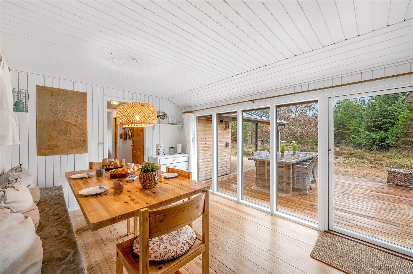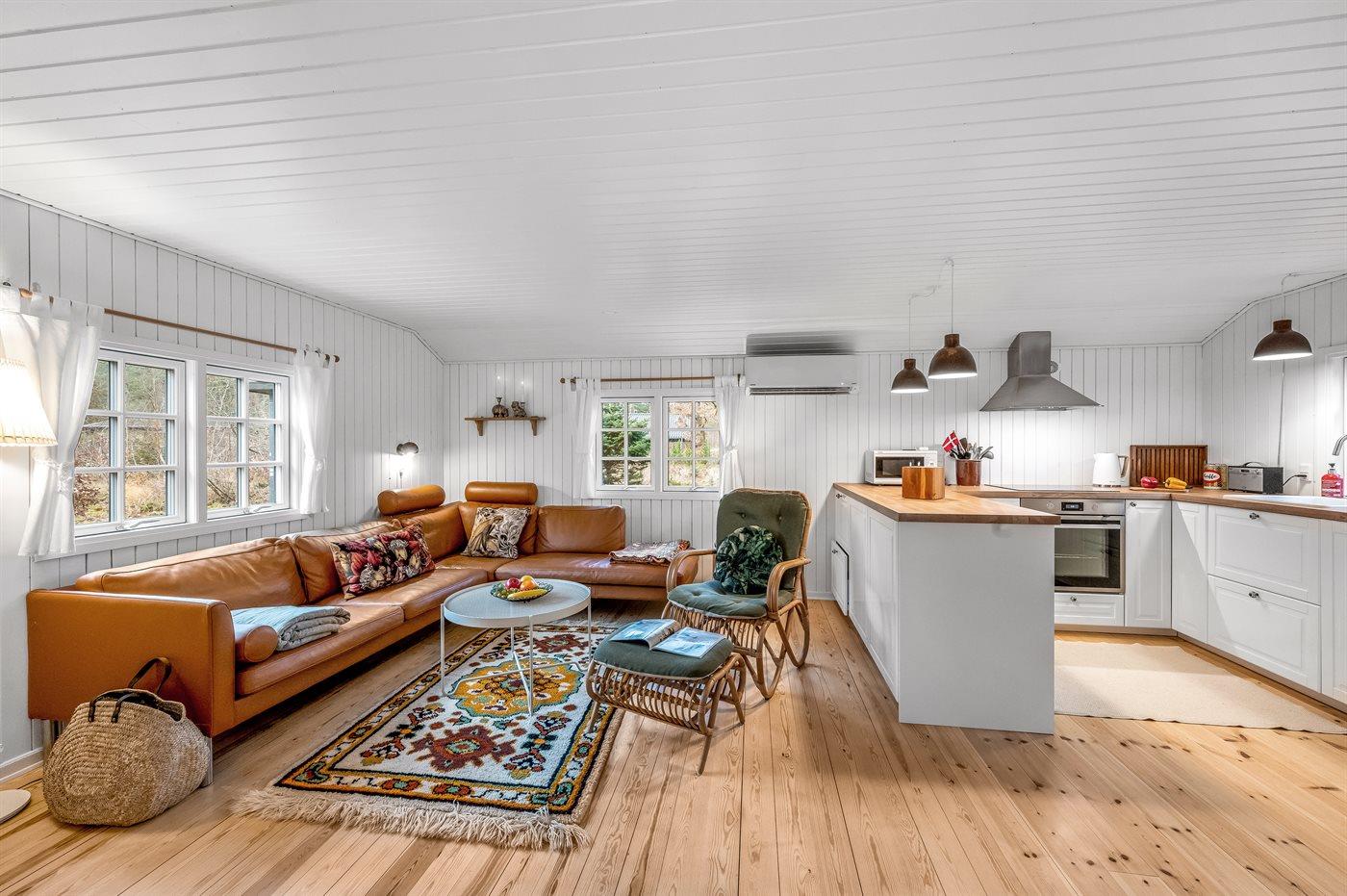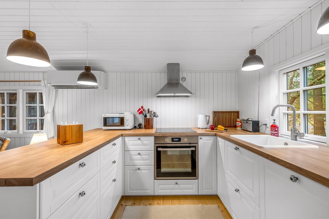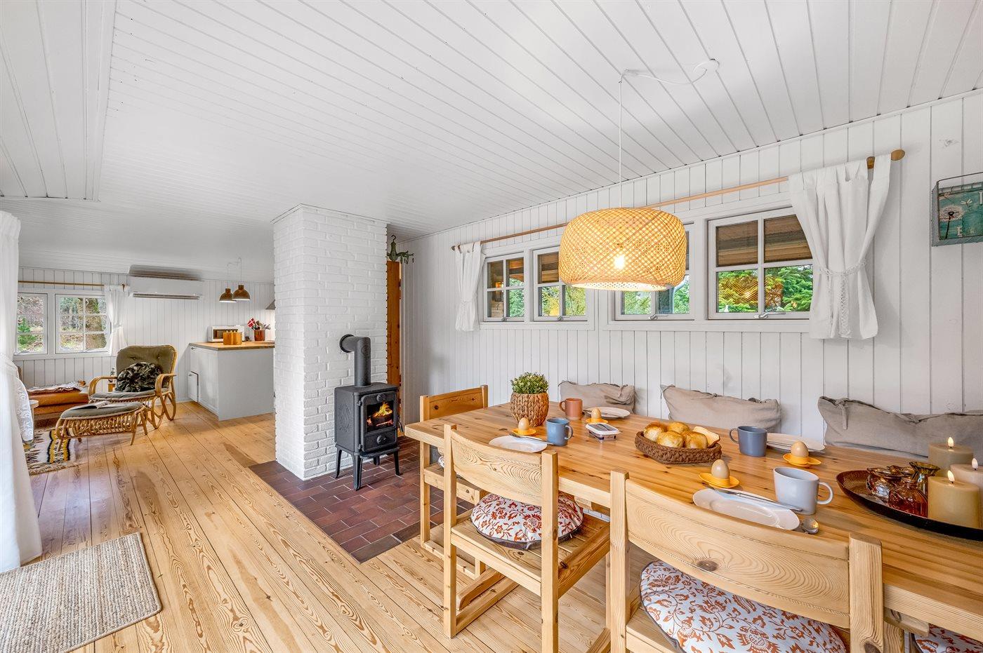 Indenfor er sommerhuset smukt og stilfuldt indrettet med en afslappende sommerhusvibe. Sommerhusets køkken er velindrettet, og her er der plads til, at flere kan hjælpes ad og hygge sig sammen om madlavningen. Fra køkkenet er der åbent til sommerhusets hyggelige stue med den store sofa, hvor I kan slappe af med en god bog eller se en film. I spiseafdelingen kan I tænde op i brændeovnen, og nyde de store gulv til loft vinduer, der giver fornemmelsen af at sidde midt ude i naturen.