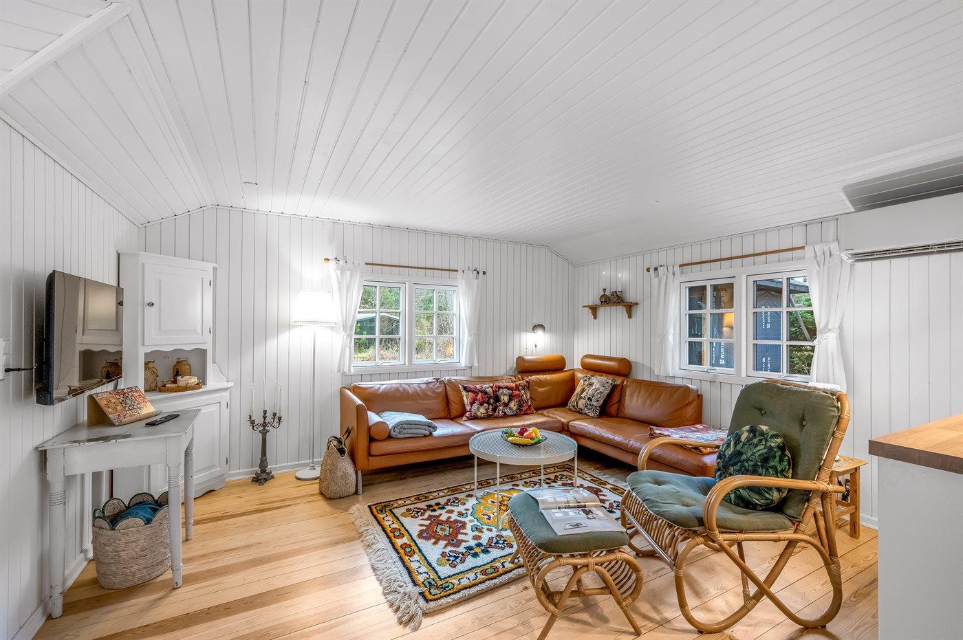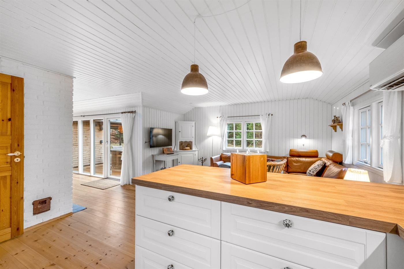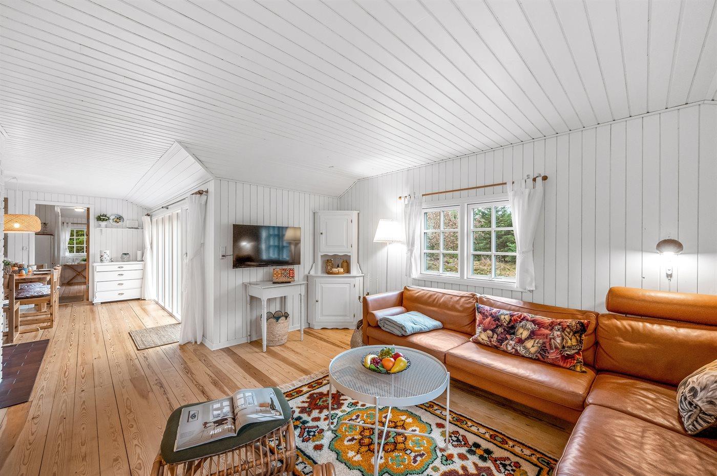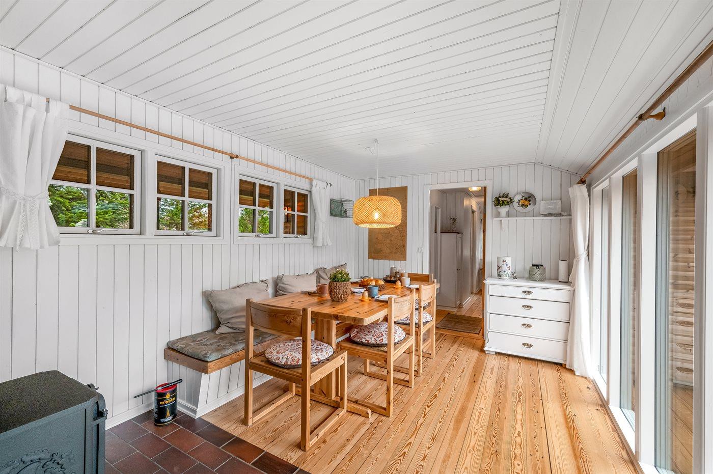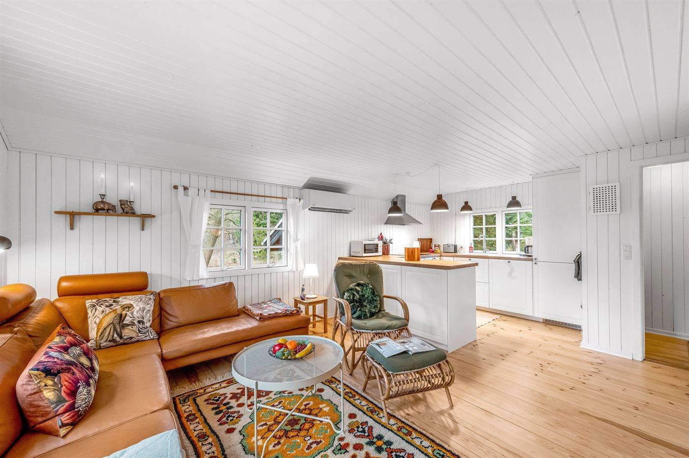 Indenfor er sommerhuset smukt og stilfuldt indrettet med en afslappende sommerhusvibe. Sommerhusets køkken er velindrettet, og her er der plads til, at flere kan hjælpes ad og hygge sig sammen om madlavningen. Fra køkkenet er der åbent til sommerhusets hyggelige stue med den store sofa, hvor I kan slappe af med en god bog eller se en film. I spiseafdelingen kan I tænde op i brændeovnen, og nyde de store gulv til loft vinduer, der giver fornemmelsen af at sidde midt ude i naturen.
