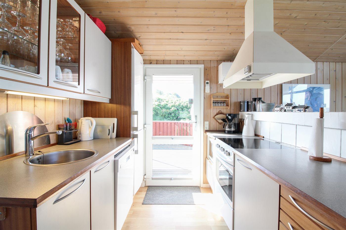 Køkkenet er udstyret med 1 køleskab. Der er 4 keramiske kogeplader, bageovn, varmluftovn, mikrobølgeovn samt opvaskemaskine.