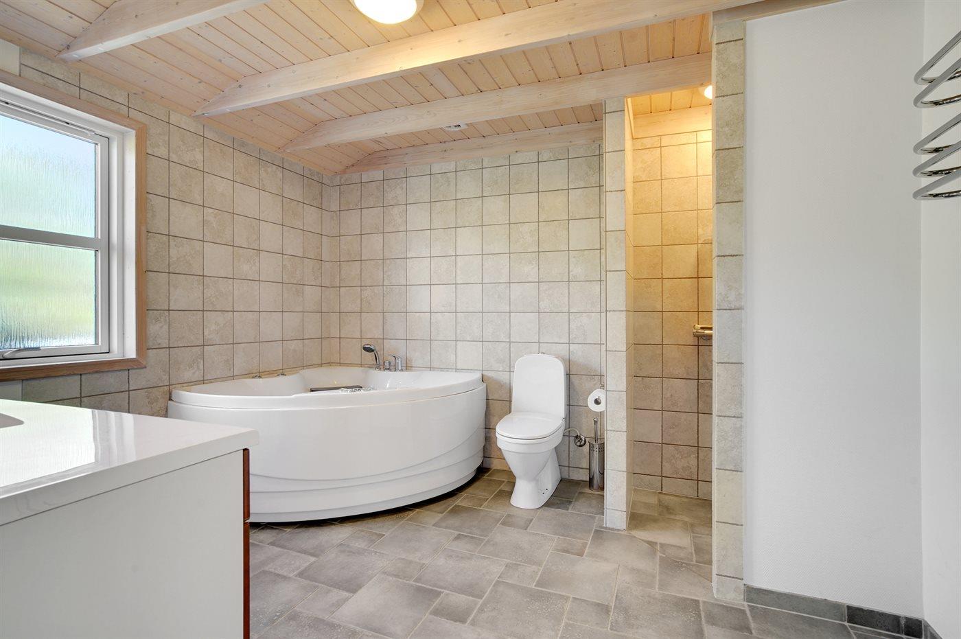 Ferieboligen byder også på 2 moderne badeværelser med brusenicher og gulvvarme, hvilket giver jer den ultimative komfort. Afslapning er sikret i den indendørs spa, hvor I kan nyde hinandens selskab.
