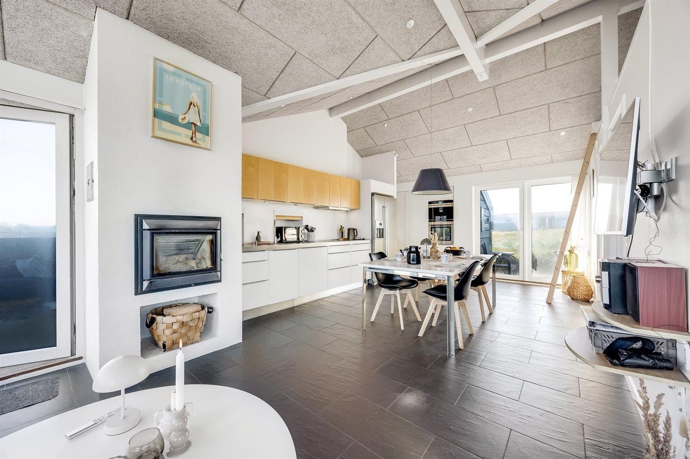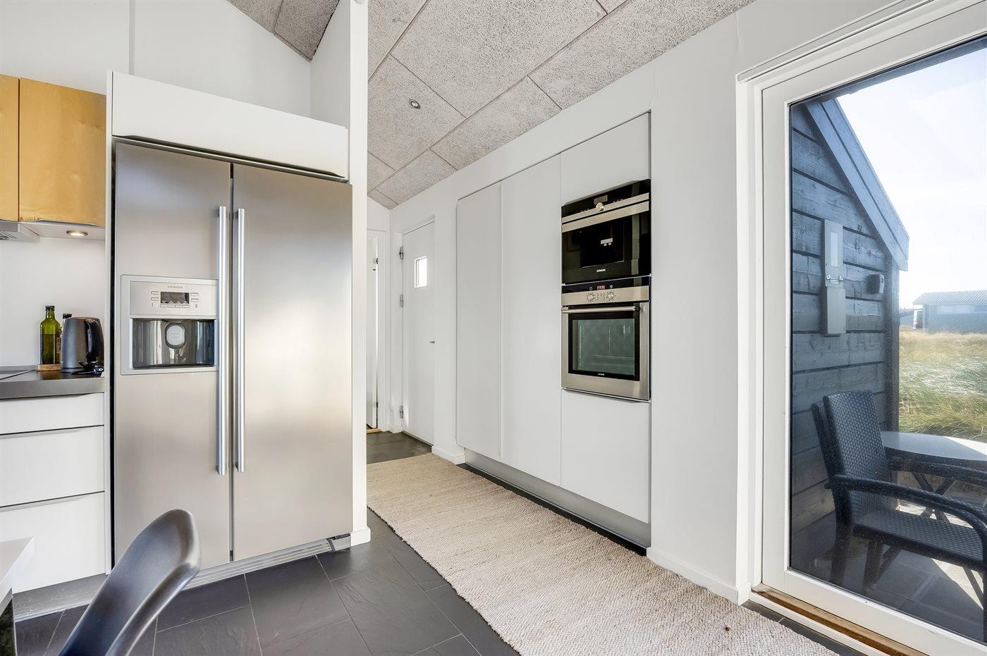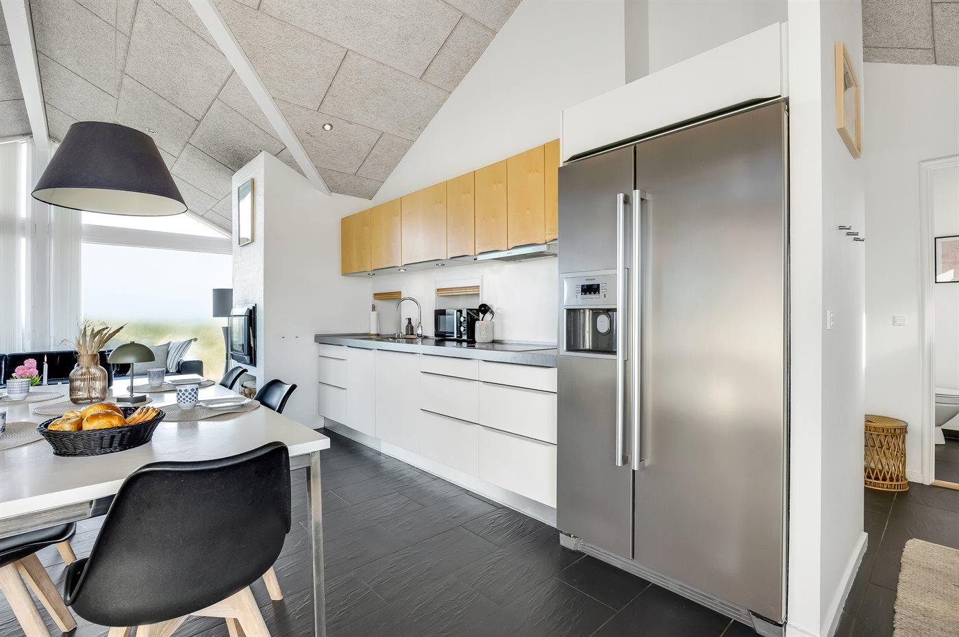 Køkkenet er udstyret med 1 amerikansk køleskab. Der er 4 keramiske kogeplader, varmluftovn, mikrobølgeovn samt opvaskemaskine. Der findes desuden en espressomaskine. Der er gulvvarme i køkkenet.