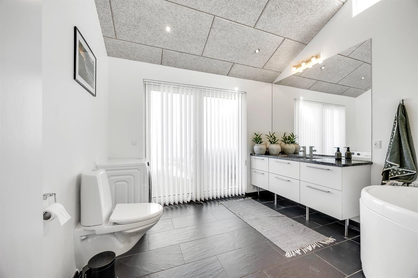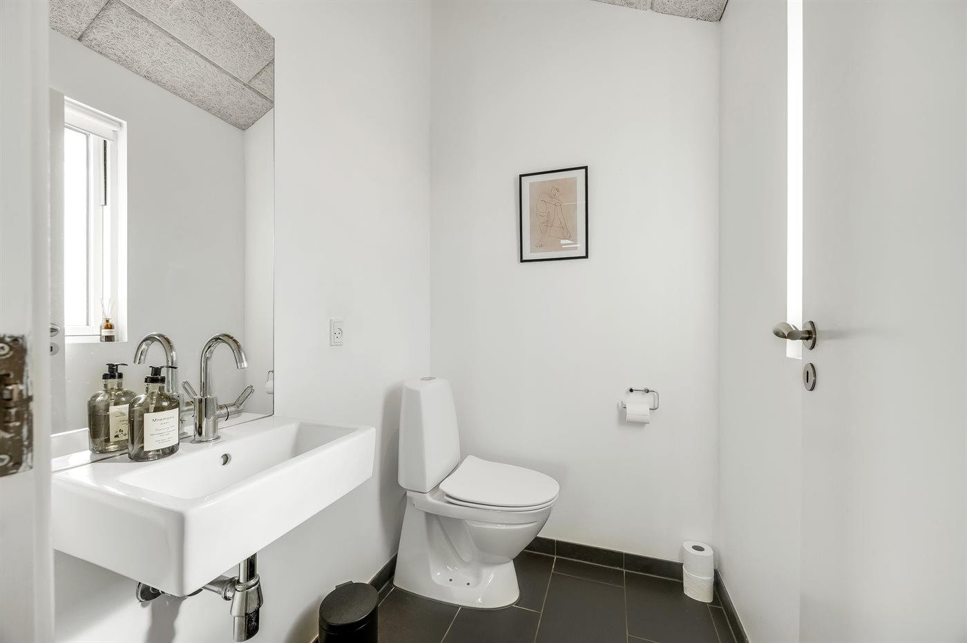 Der er 1 badeværelse og 2 toiletter, heraf 1 gæstetoilet Der er gulvvarme på gæstetoilettet.