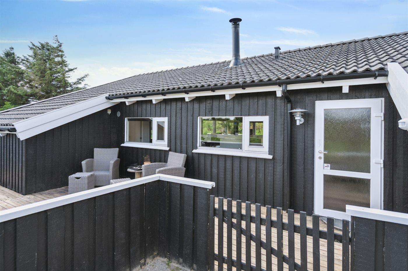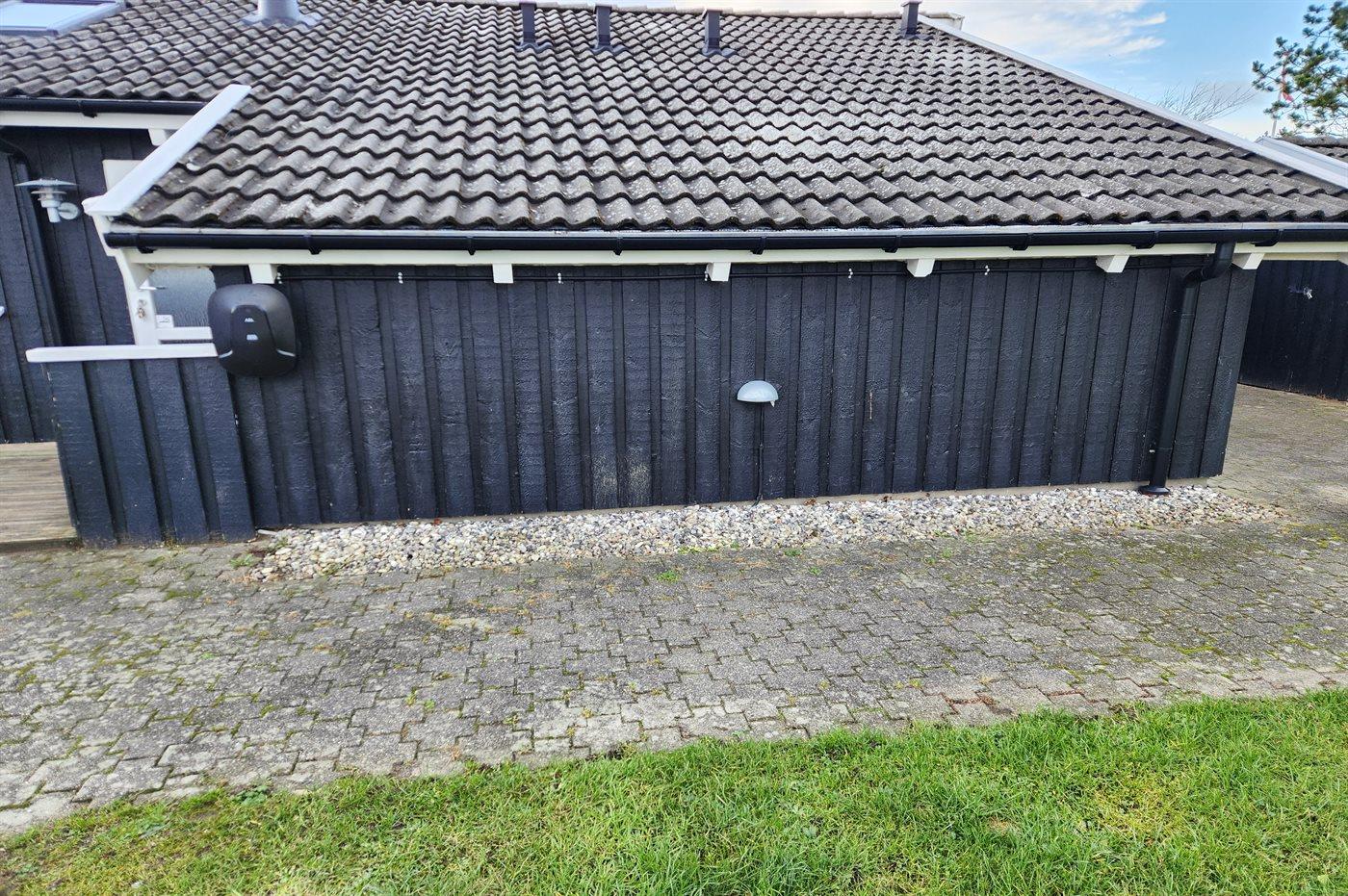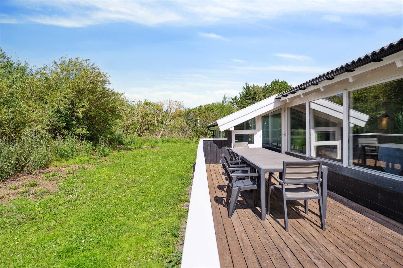 Ferieboligen er beliggende på en 1900 m² stor naturgrund. Der er 940 m til havet. Nærmeste forretning er beliggende i en afstand af 500 m. Til ferieboligen hører 65 m² lukket terrasse. Gynge. Der er installeret stik til opladning af elbil. Med 11 kW ladeeffekt. Parkering ved ferieboligen.