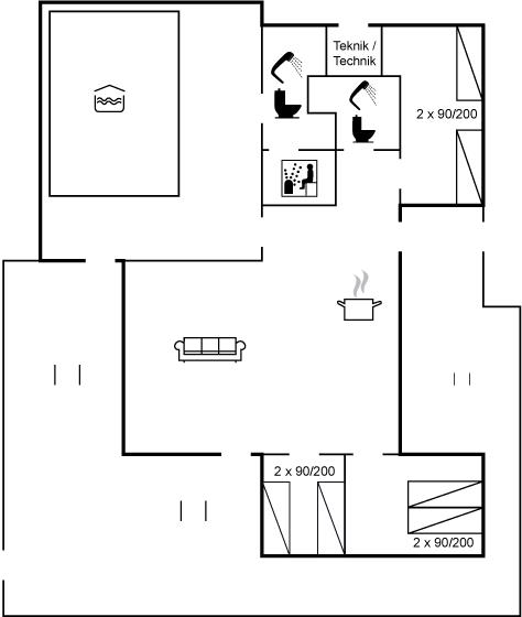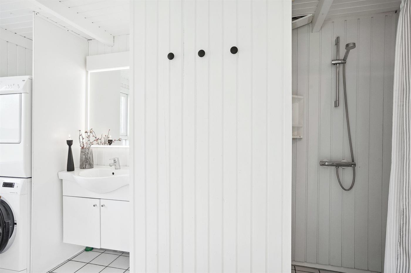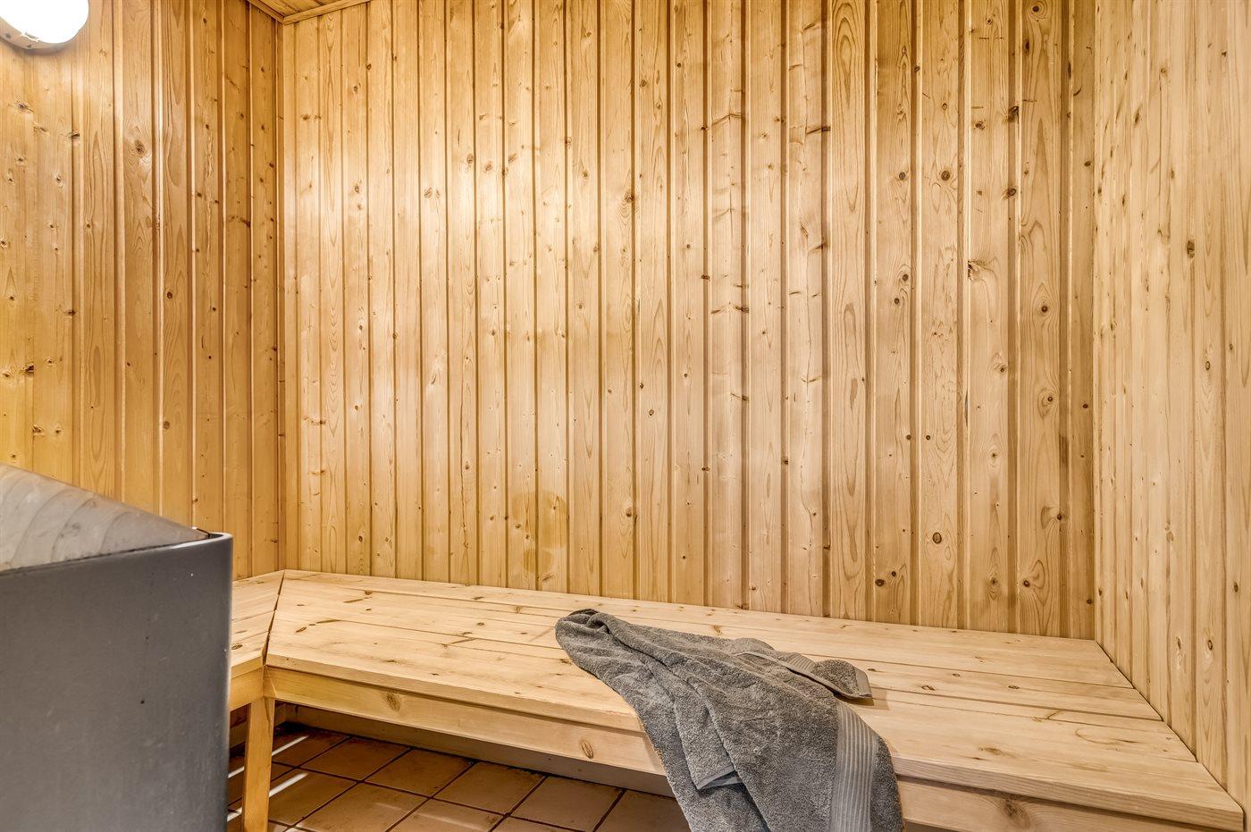 Der er 2 badeværelser med bruseniche og 2 toiletter. Der er gulvvarme på 1 badeværelse. I saunaen er der mulighed for afslapning.