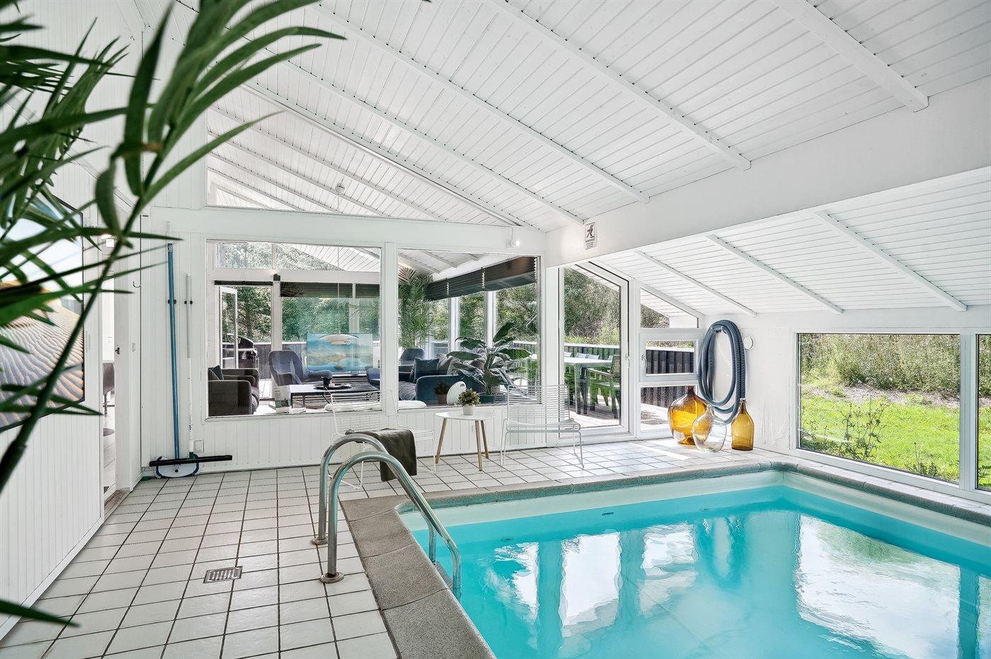 I den indendørs swimmingpool er der mulighed for leg og hyggeligt samvær. Swimmingpoolen måler op til 3,5 m i bredden, 5 m i længden og den er op til 1,5 m dyb. Vandet er mellem 24 og 28° C varmt. Der er gulvvarme i swimmingpoolområdet.