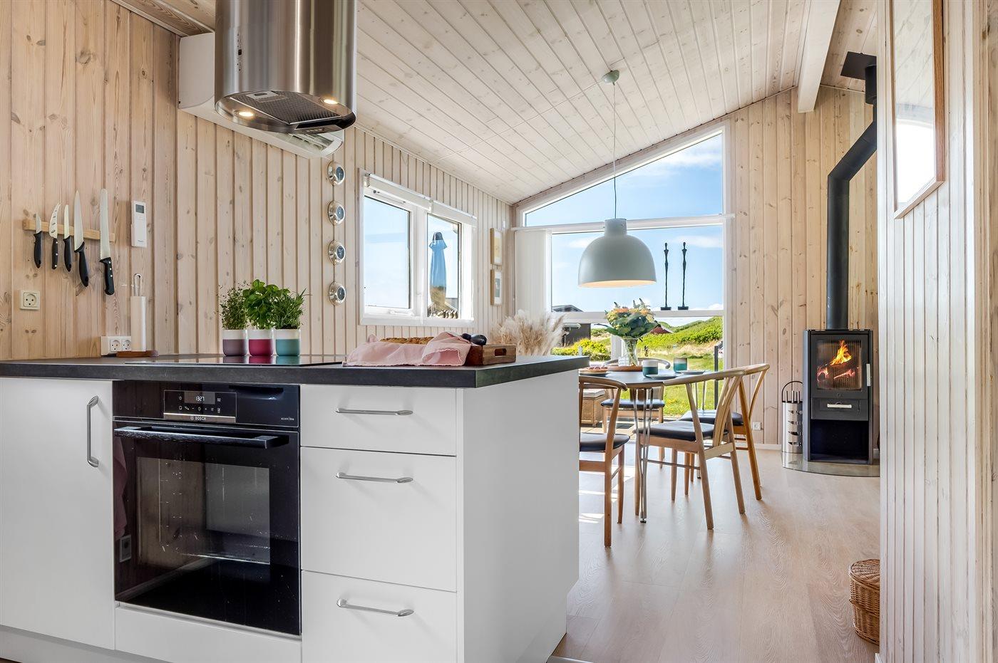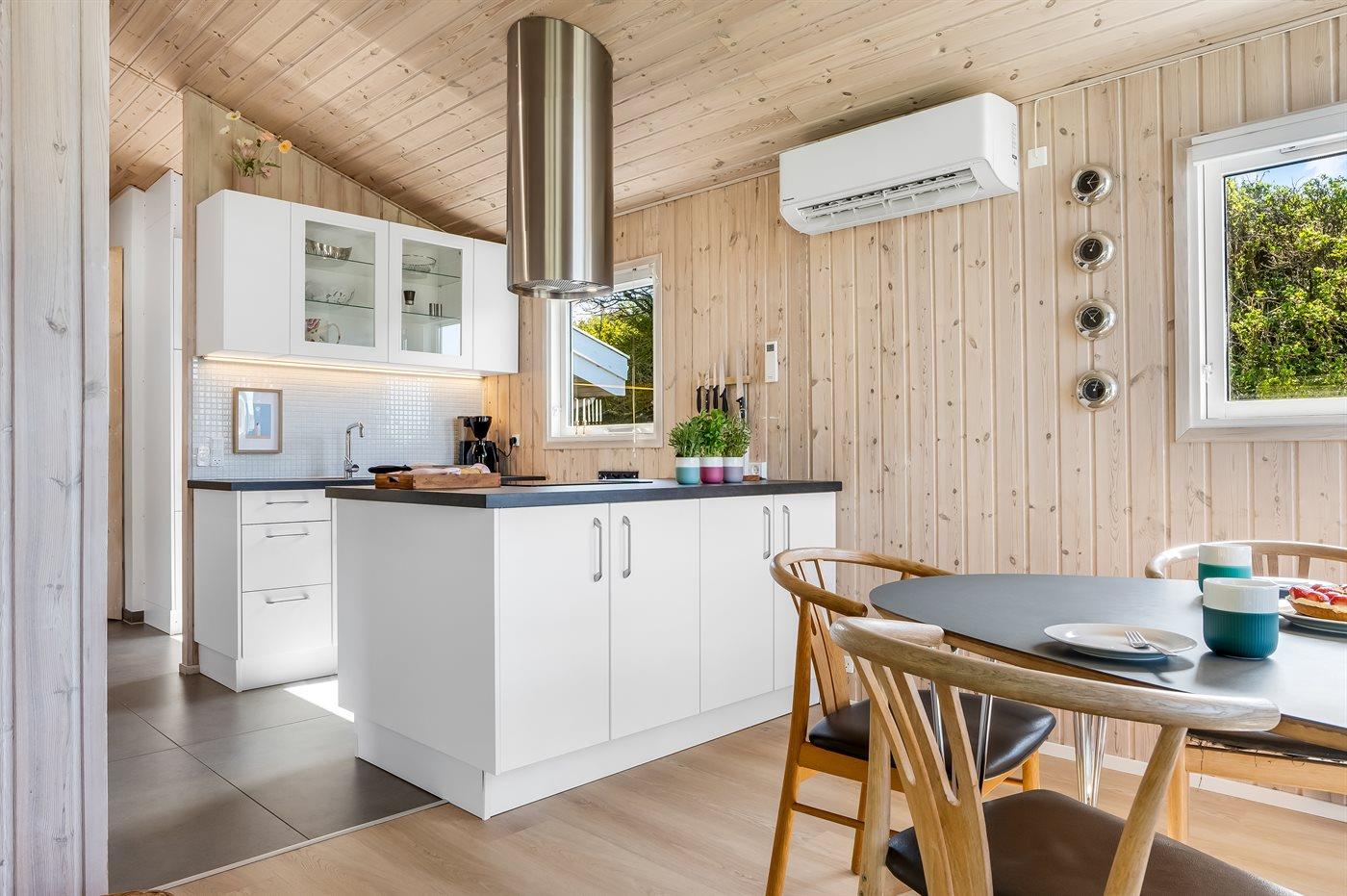 Køkkenet er udstyret med 1 køleskab. Der er 4 keramiske kogeplader, varmluftovn samt opvaskemaskine.