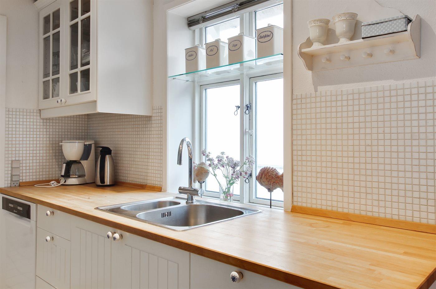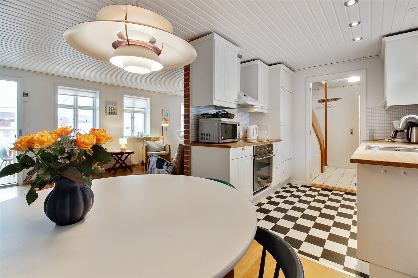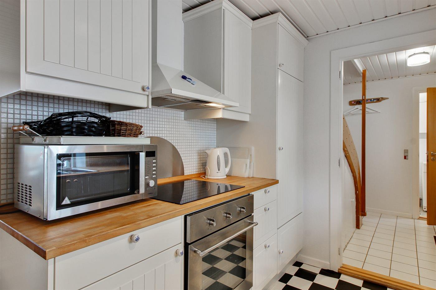 Køkkenet er udstyret med 1 køleskab. Der er 4 induktionskogeplader, varmluftovn, mikrobølgeovn samt opvaskemaskine.