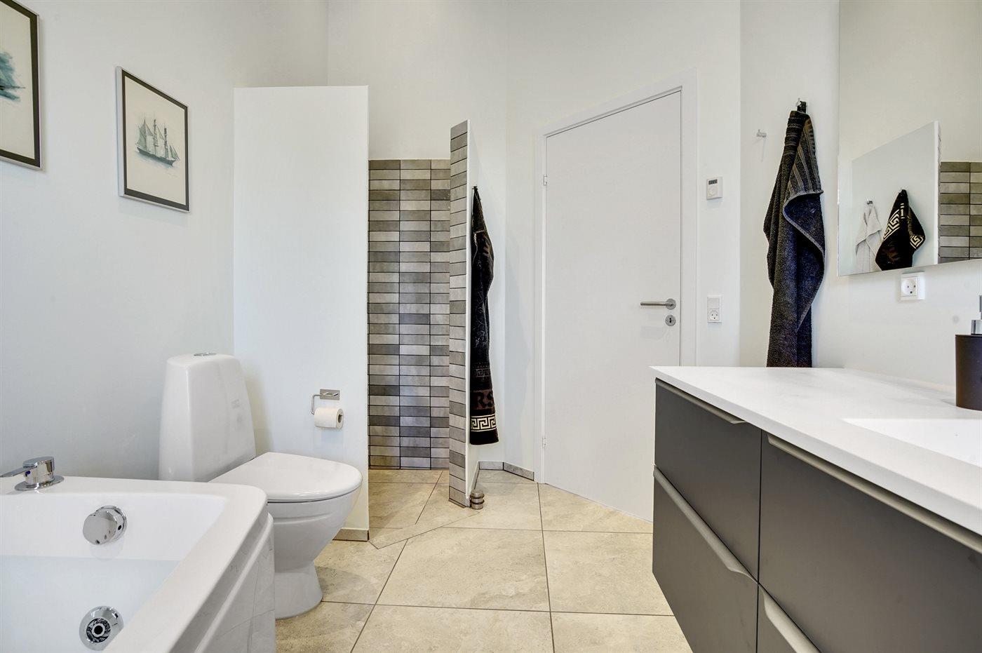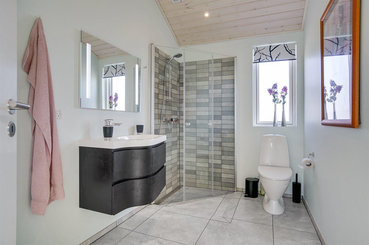 Der er 2 badeværelser med bruseniche og 2 toiletter. Der er gulvvarme på 2 badeværelser.