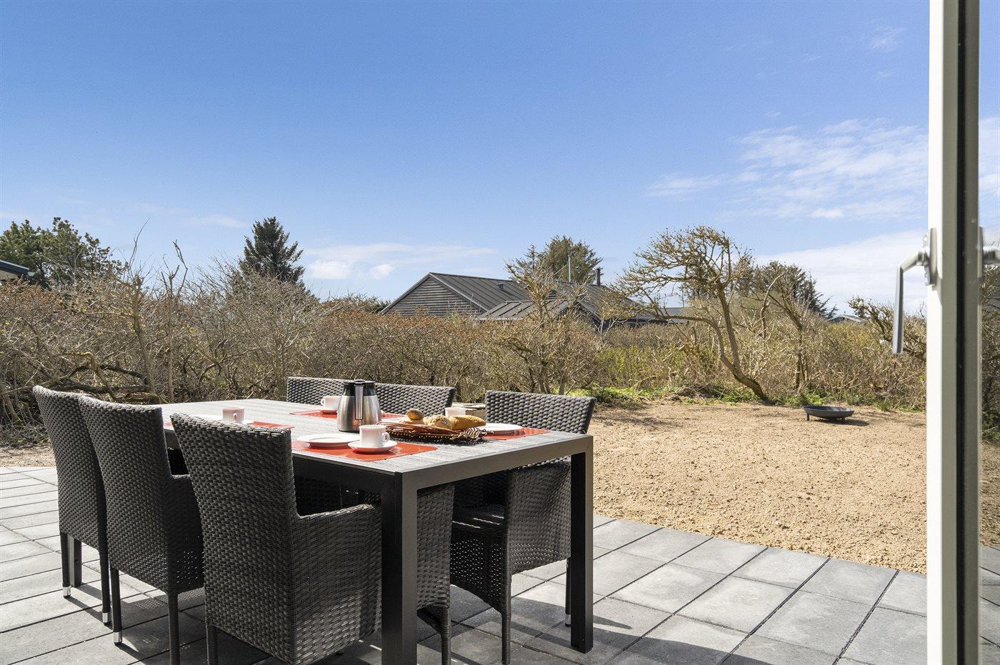 Ferieboligen er beliggende på en 1212 m² stor naturgrund. Der er 500 m til havet. Nærmeste forretning er beliggende i en afstand af 900 m. Til ferieboligen hører 80 m² terrasseareal. Desuden er der 7 m² overdækket terrasse. Der er redskabsrum. Sandkasse. Bålsted. Der er carport til rådighed. Der er installeret stik til opladning af elbil. Parkering ved ferieboligen.