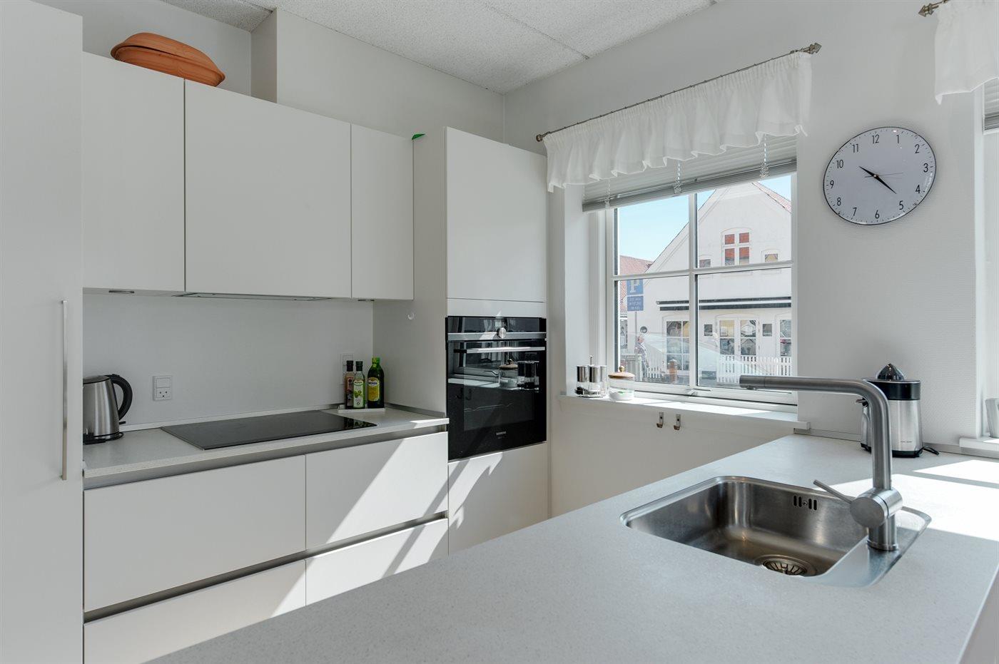 Køkkenet er udstyret med 1 køleskab. Der er 4 induktionskogeplader, varmluftovn samt opvaskemaskine.