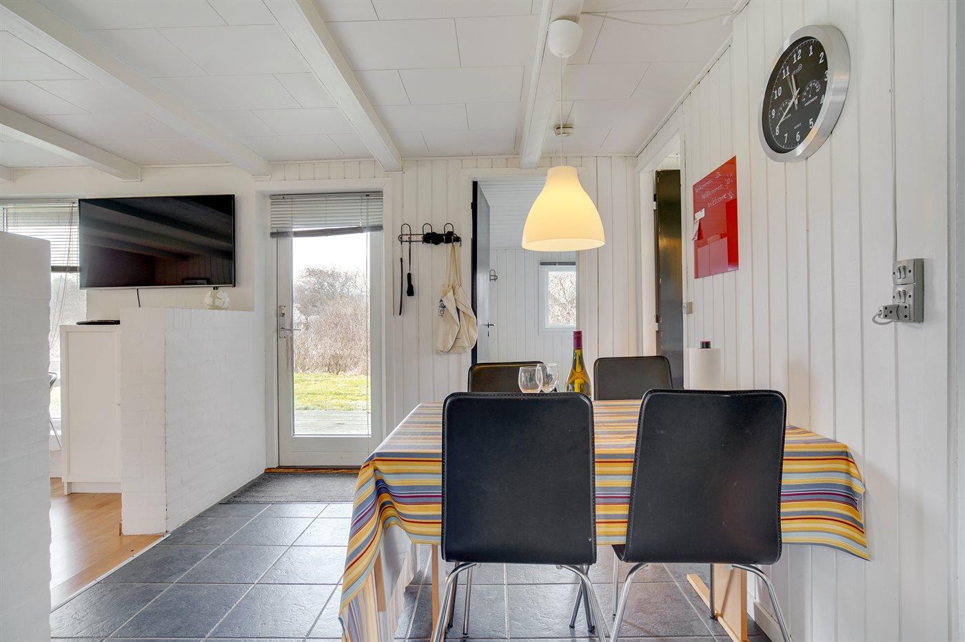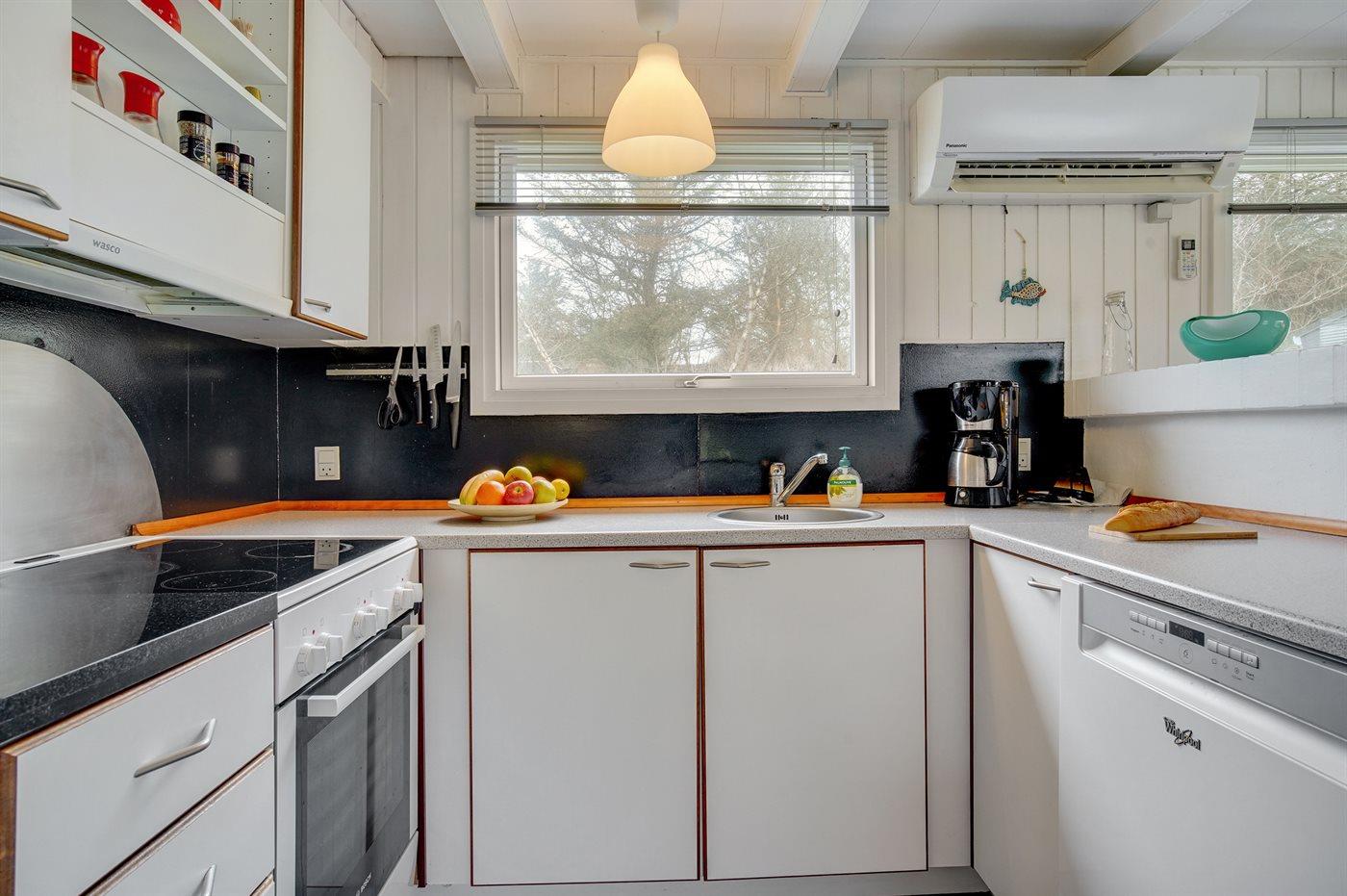 Køkkenet er udstyret med 1 køleskab. Der er 4 keramiske kogeplader, varmluftovn samt opvaskemaskine.