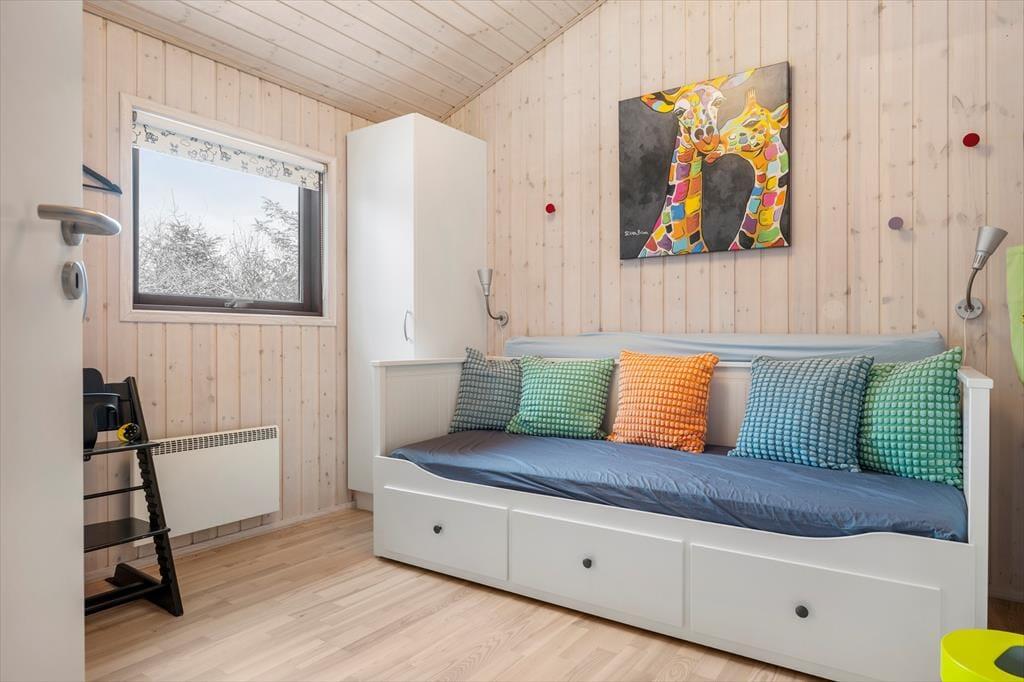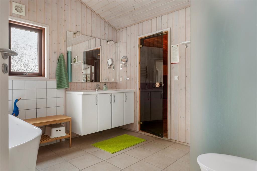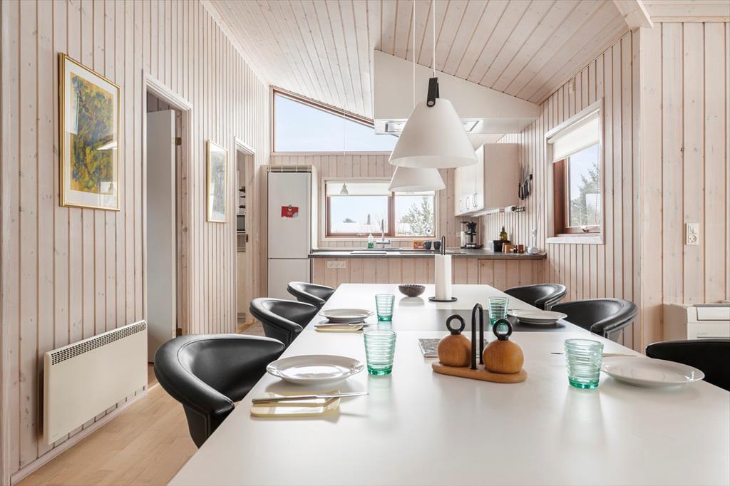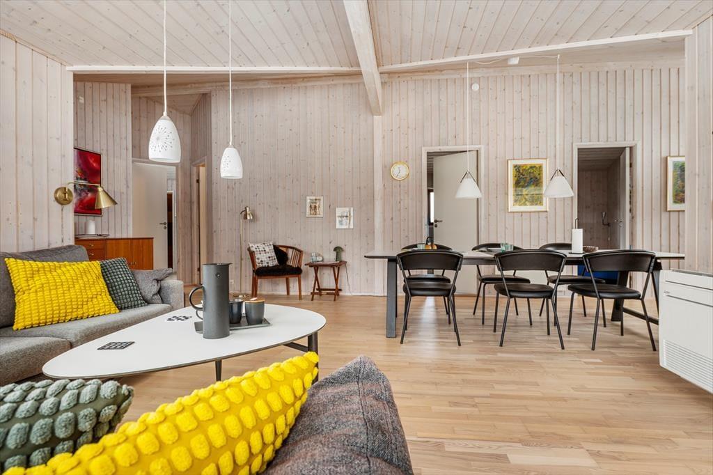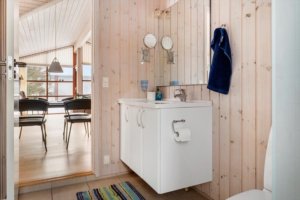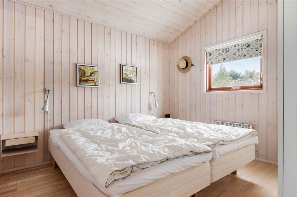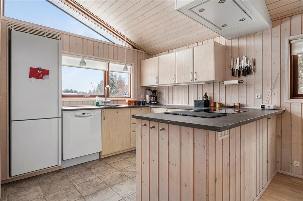 Sommerhuset er meget rummeligt og er indrettet med moderne og lyse møbler. Fra entreen går man ind i køkkenet som ligger i åben forbindelse med den store stue. Der er 3 gode soveværelser alle med skabsplads. Huset indeholder 2 badeværelser, det ene med spabad og sauna. Stuens store panoramavinduer giver et dejligt lysindfald og fra stuen er der skøn udsigt til den store grund.