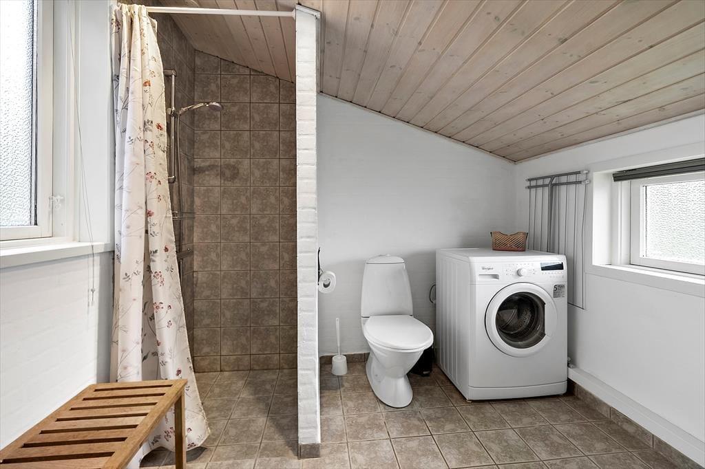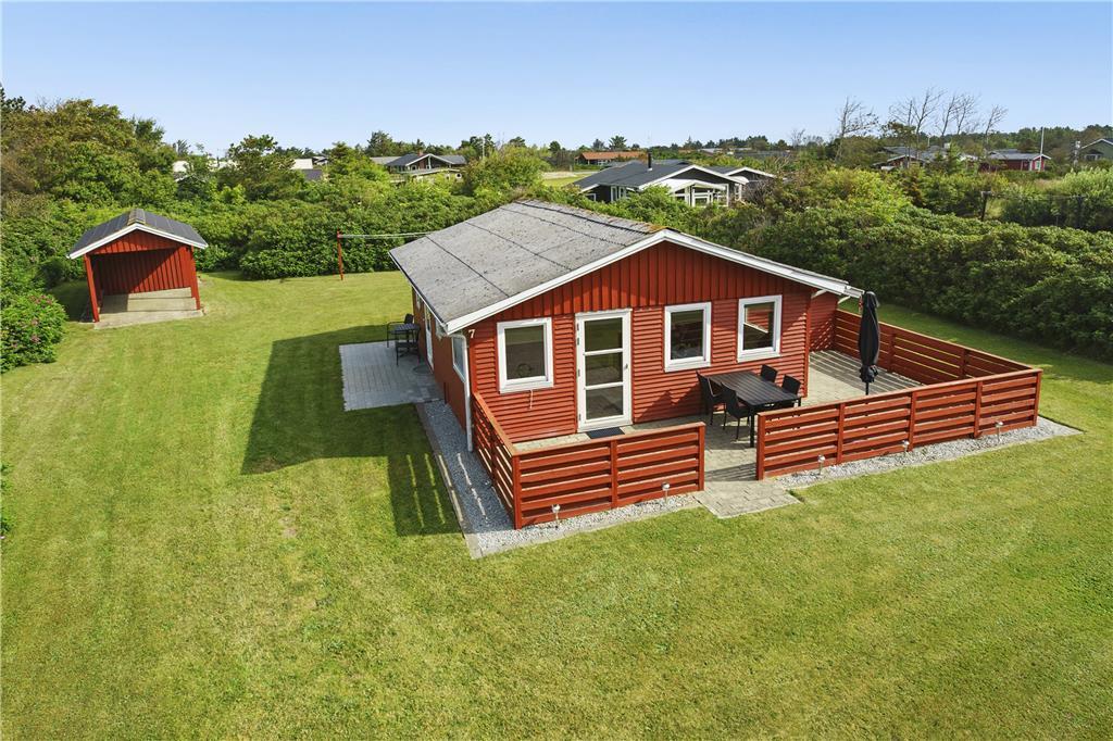 Fra sommerhuset har I direkte adgang til to terrasser: Den mindste ligger mod vest lige ved entréen, mens den anden ligger i naturlig forlængelse af stuen i sydøstlig retning. Der er med andre ord flere opholdspladser at vælge imellem alt efter solens placering på himlen og behovet for skygge. Rundt om huset og terrasserne breder en stor, grøn græsplæne sig, så der er masser af plads til leg og boldspil.