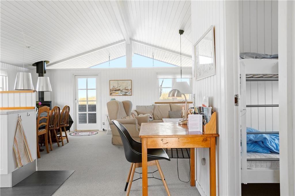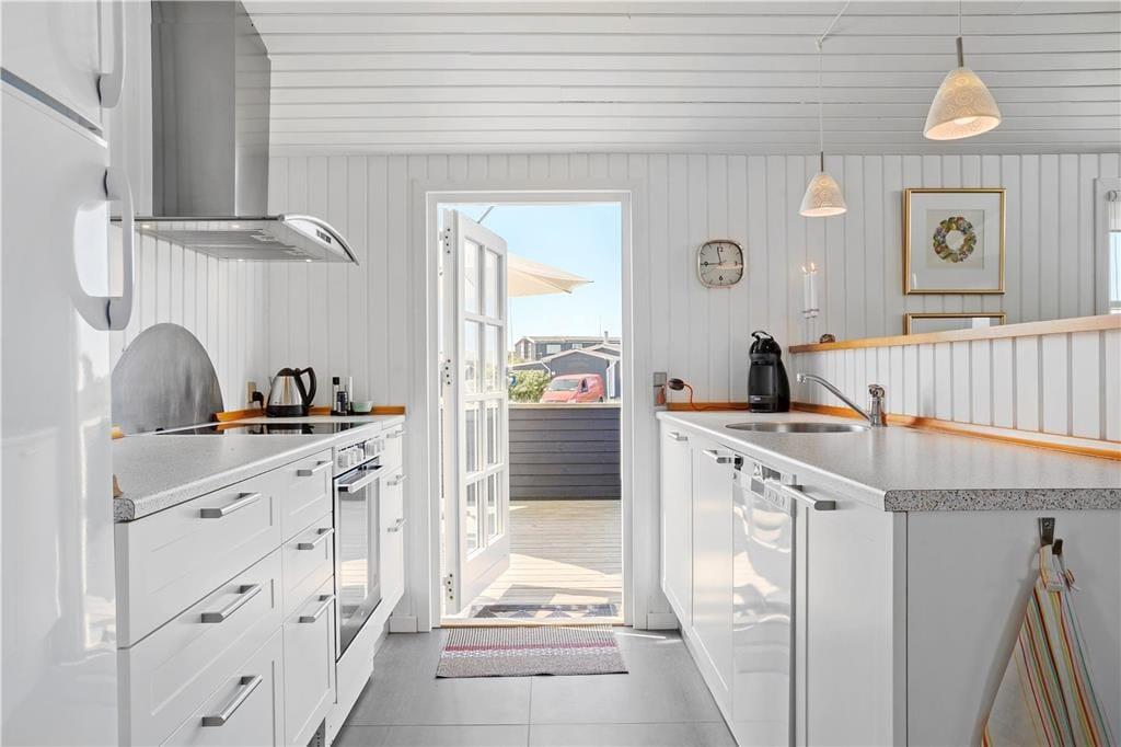 Sommerhuset er lyst og smagfuldt indrettet med skønne og komfortable møbler. Køkkenet ligger i åben forbindelse til stuen, hvorfra den flotte havudsigt kan nydes. Sommerhuset har et lyst og funktionelt badeværelse og to soveværelser med gode senge. Fra den hyggelige stue, er der udgang til den overdækkede terrasse.