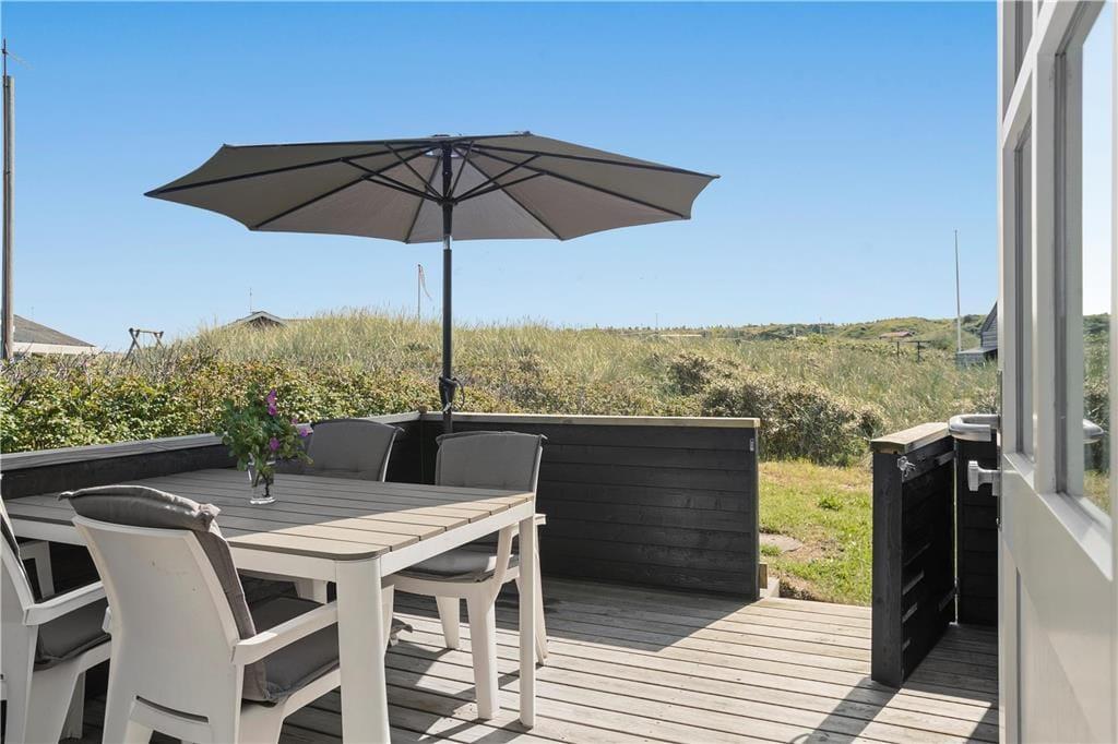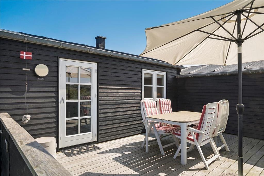 Sommerhuset ligger på en naturgrund med lav bevoksning. Huset er omgivet af tre lukkede terrasser, hvoraf den overdækkede har udgang fra stuen. Her kan man sidde og nyde den fantastiske solnedgang.