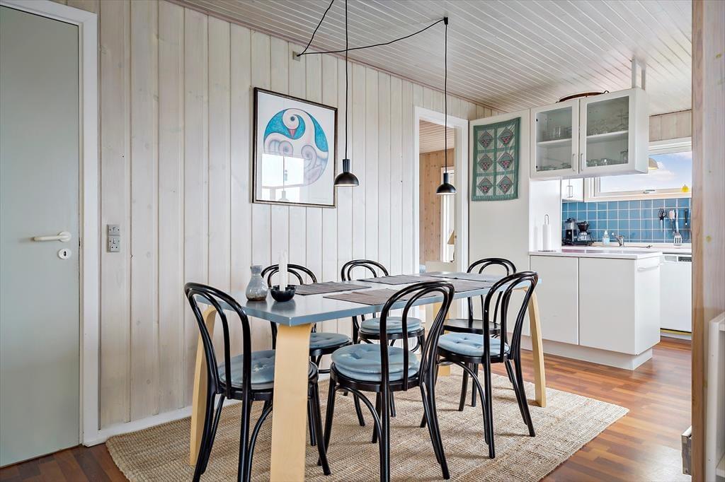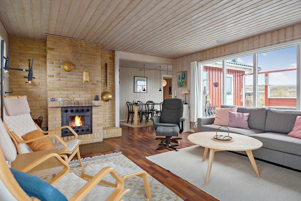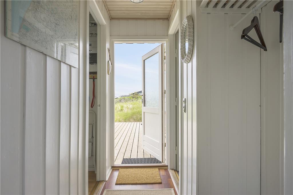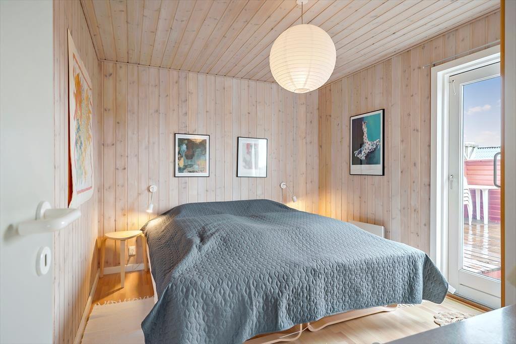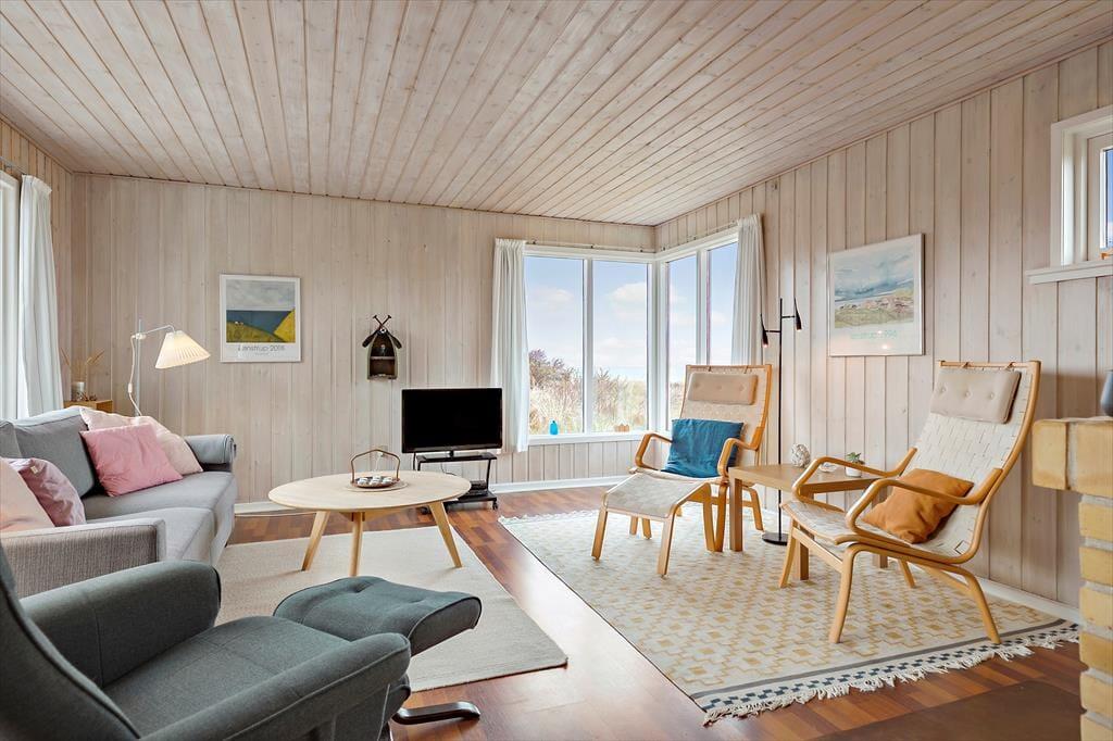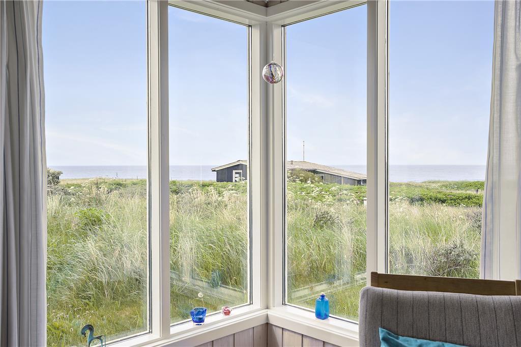Sommerhuset er lyst og indbydende indrettet med smarte og komfortable møbler. Her er store vinduer som giver et fint lysindfald og skøn udsigt til havet. En brændeovn er med til at give både varme og hygge. Køkkenet ligger i åben forbindelse til stuen. Sommerhuset har tre værelser, to med dobbeltsenge og et med to enkeltsenge. Det ene værelse har adgang via terrassen. Badeværelset et pænt og lyst og har vaskemaskine.