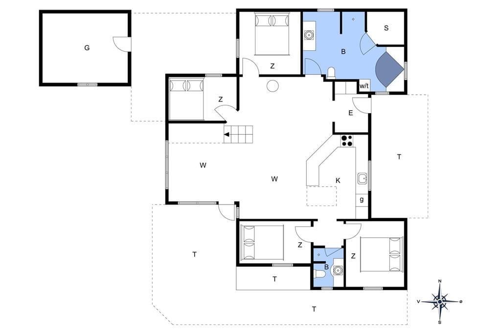 117 m2 får I at brede jer på inden døre i det lyst indrettede hus, der er opført i 2005. Alle rum fremstår pæne og velholdte, og som en praktisk detalje er planløsningen god. Fire soveværelser og to badeværelser er nemlig placeret ligeligt i begge ender af huset – hvilket for eksempel er rart, hvis I er to familier, der vil holde ferie sammen. Centralt i ferieboligen ligger opholdsrummet, hvor køkkenet er integreret med stuen. Her er en god loftshøjde og en behagelig atmosfære, og de store vinduespartier sørger for et godt lysindfald og giver udsigt til den grønne have.