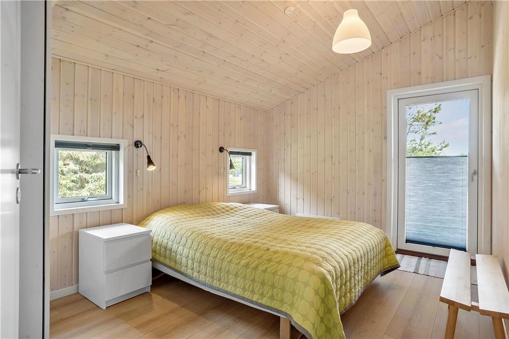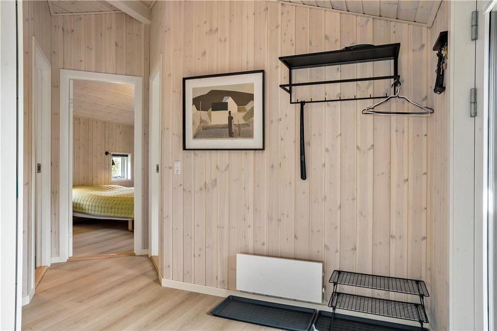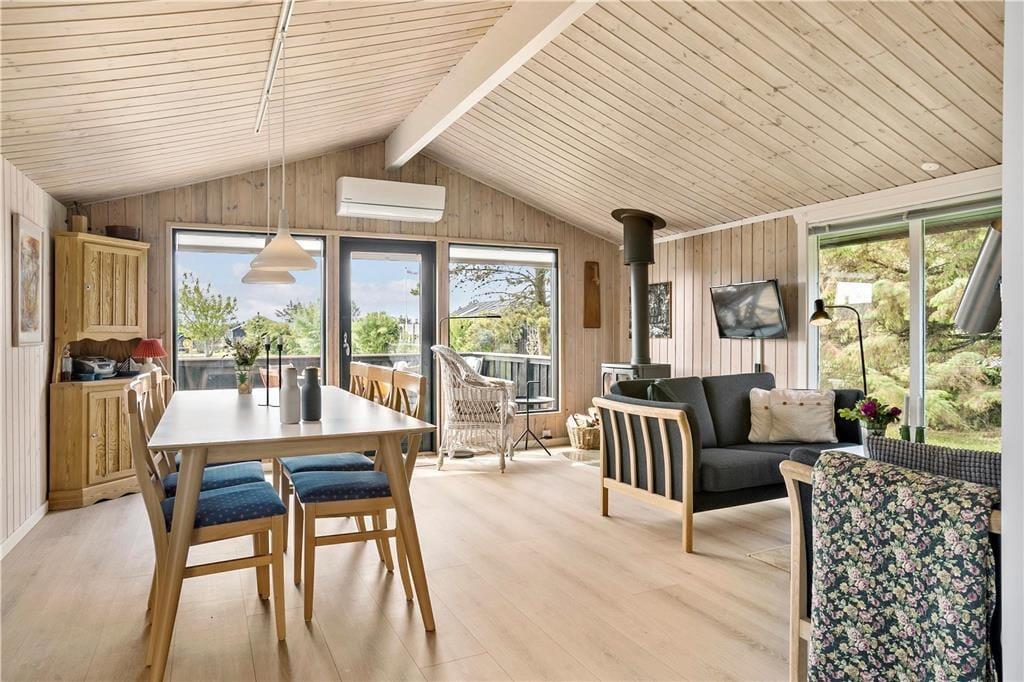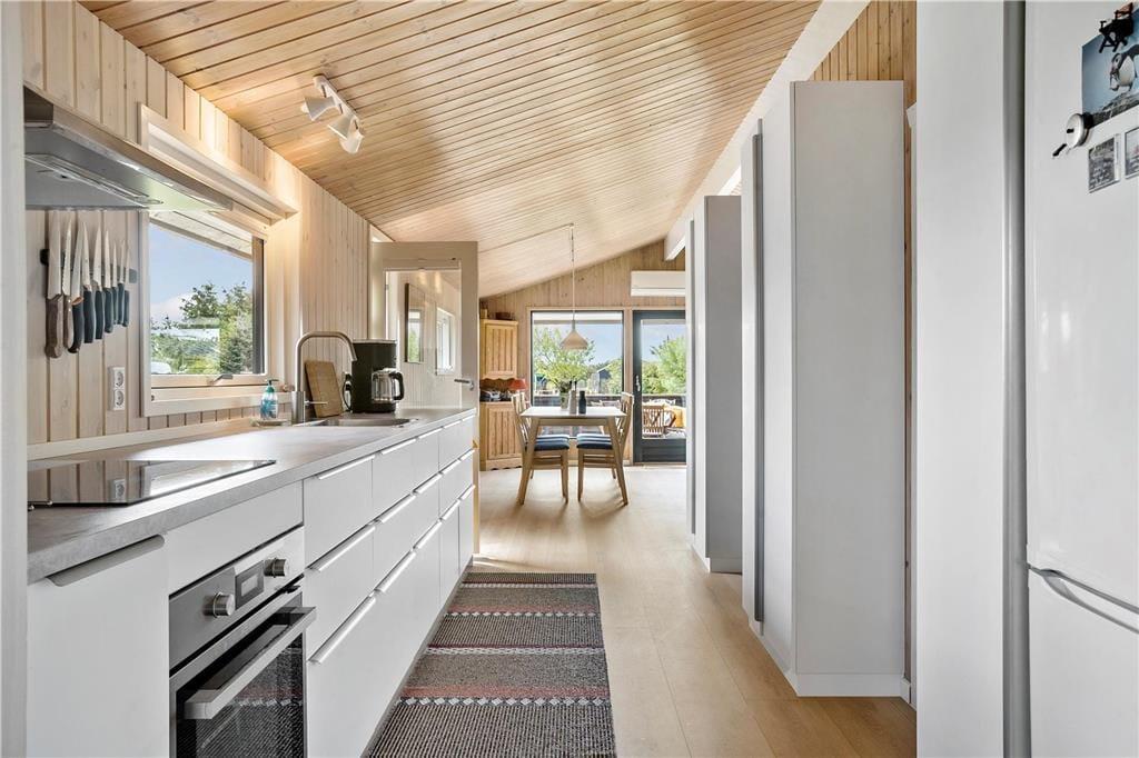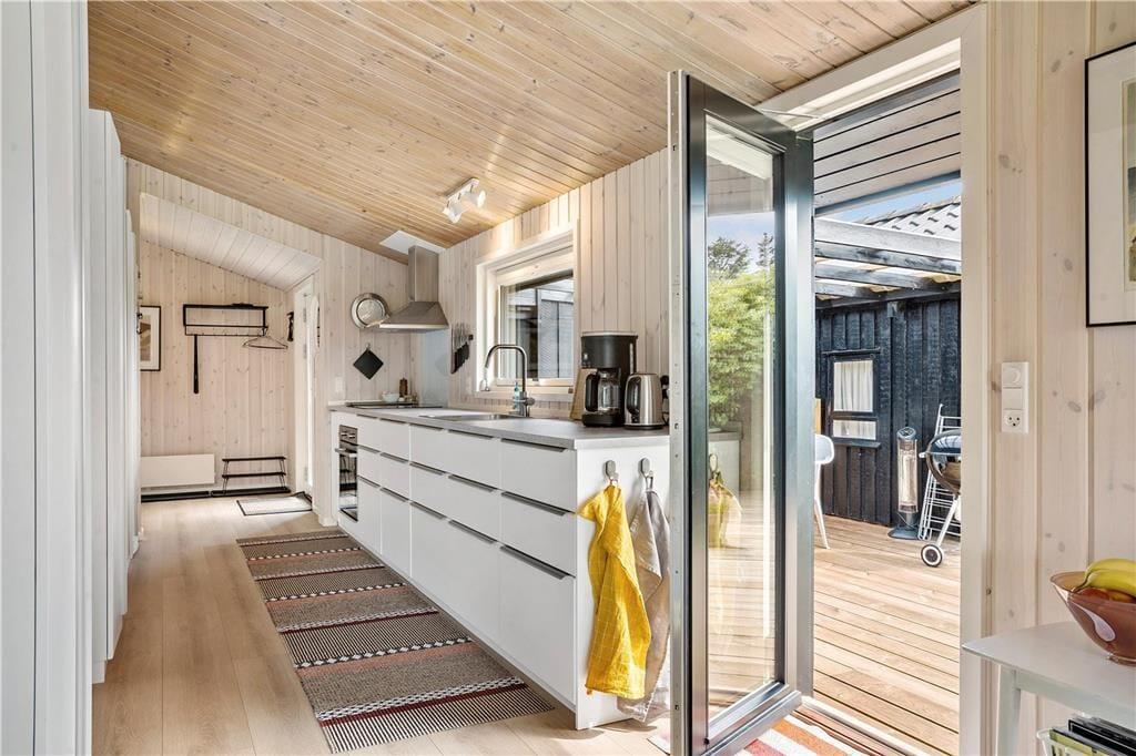 Det klassiske træsommerhus er oprindeligt opført i 1977, men er blevet grundigt moderniseret i 2019. Blandt andet er husets nye køkkenafdeling særdeles flot og funktionelt indrettet, så det er et skønt sted at kokkerere, og takket være den åbne forbindelse ind til stuen kan I sågar tage del i feriehyggen, mens I forbereder aftensmaden. Stuen er indrettet på hyggelig vis med brændeovn og pæne møbler, og vinduerne sørger for et godt lysindfald fra tre verdenshjørner. Som en del af opdateringen blev huset også udvidet med en tilbygning, så planløsningen i dag byder på tre gode soveværelser og et lækkert badeværelse. Det ene soveværelse er udstyret med to enkeltsenge, mens de to største soveværelser er indrettet med dobbeltseng og havedør til en overdækket terrasse.