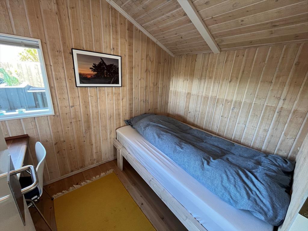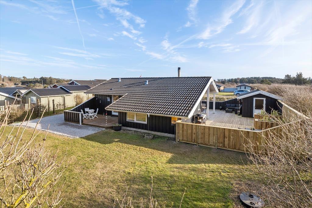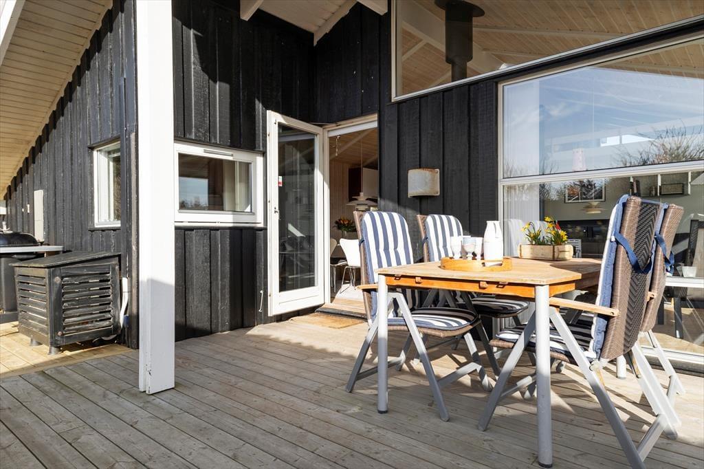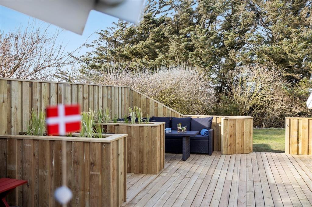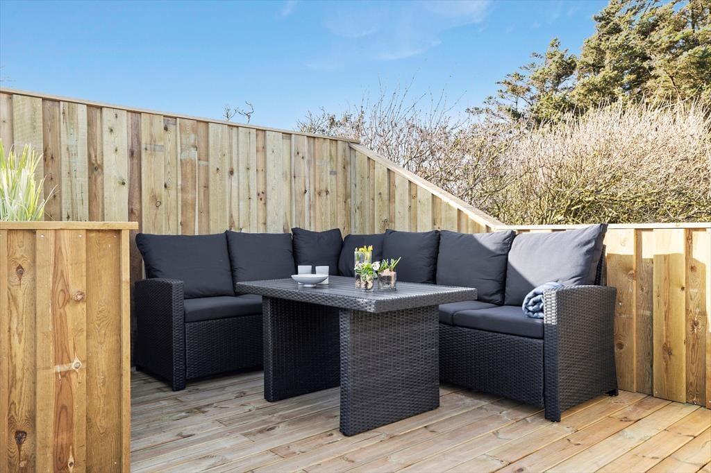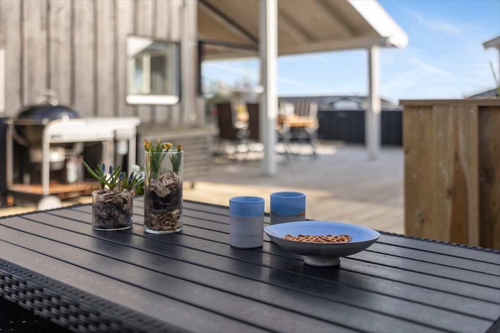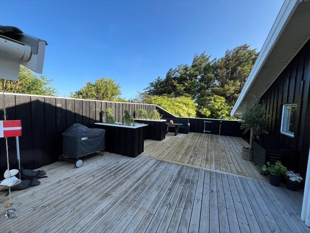 Terrassen er husets uundgåelige samlingspunkt, og den store, lukkede træterrasse er som skabt til udeliv fra morgen til aften. Her er mange hyggelige hjørner at slå sig ned i – om du foretrækker morgensolen i en lækrog med dagens første kop kaffe eller vil læne dig tilbage i skyggen med en god bog, mens sommerbrisen rører i de omkringstående buske. Med både havemøbler og grill indbyder terrassen til lange, uformelle feriedage med fælles måltider, spil og grin under åben himmel. Og fordi terrassen er lukket, kan både børn og hunde trygt tumle omkring, mens de voksne finder ro og fordybelse. Huset ligger for enden af en blind vej på en fredelig plet med grønne omgivelser, hvor man let fornemmer naturens nærvær – duften af blomster, fuglekvidder og lyden af vinden i trætoppene skaber en særlig ro, som langsomt sænker sig over skuldrene, i takt med at feriepulsen tager over.