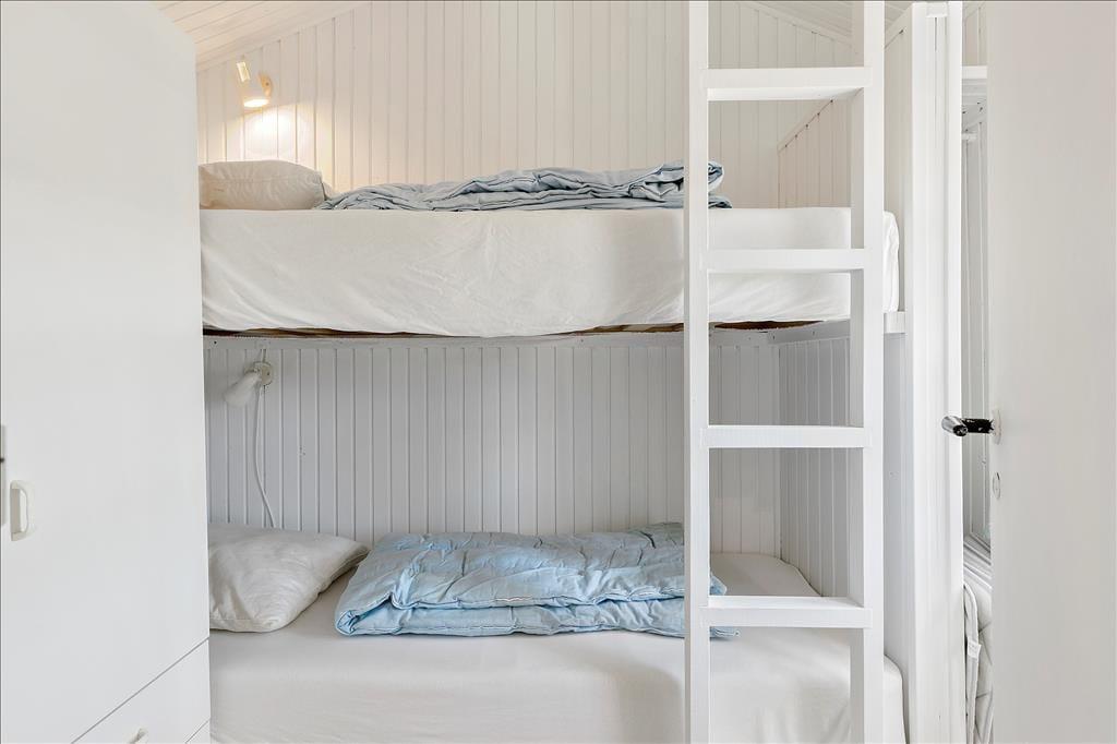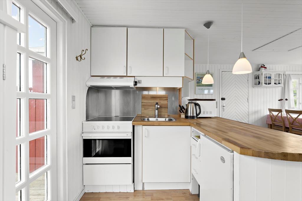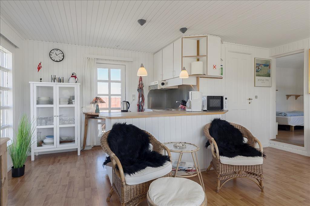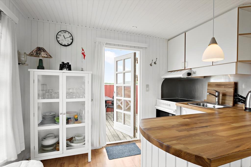 Sommerhuset har ligget i Harerendens smukke kystlandskab siden 1964, og det står stadig på klassisk vis med rød træfacade og hvide sprossevinduer. Inden døre er charmen også intakt, samtidig med at den enkle og funktionelle indretning er blevet opdateret med bekvemmeligheder som varmepumpe med køl og fladskærms-TV. Med 45 m2 er huset ikke et af de største på markedet, men hvem har brug for mere plads, når ferien handler om at slappe af med gode bøger, lækre måltider og hyggeligt samvær? Det hele kan foregå i stuen, hvor I også kan kokkerere i det åbne køkken – og det er for øvrigt her, at havudsigten kan nydes. Et lille badeværelse hører med til planløsningen foruden to soveværelser, der ligger i forlængelse af hinanden