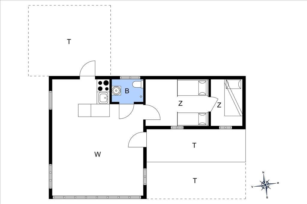 Lille og hyggeligt træsommerhus 65 meter fra stranden