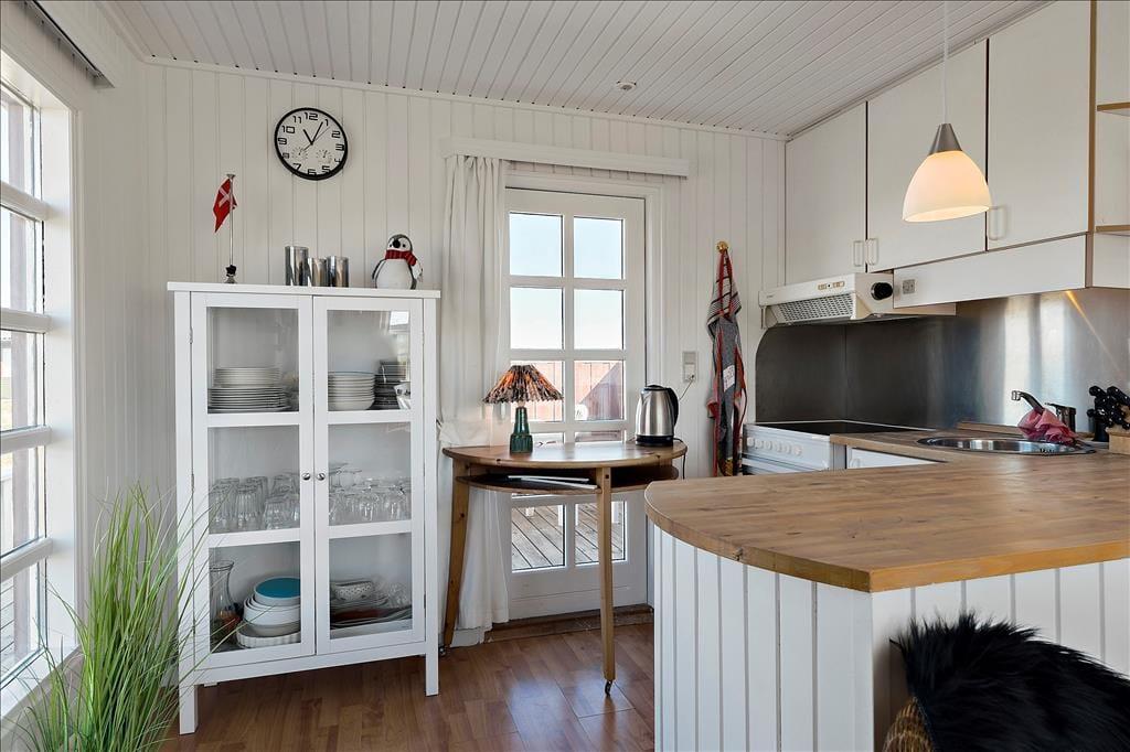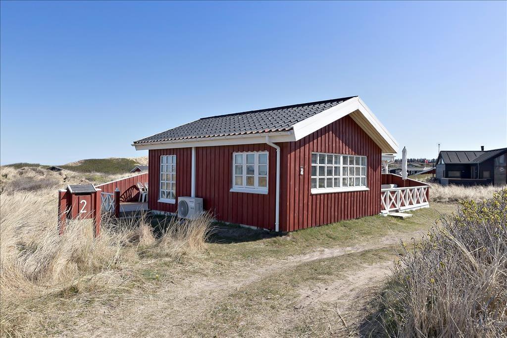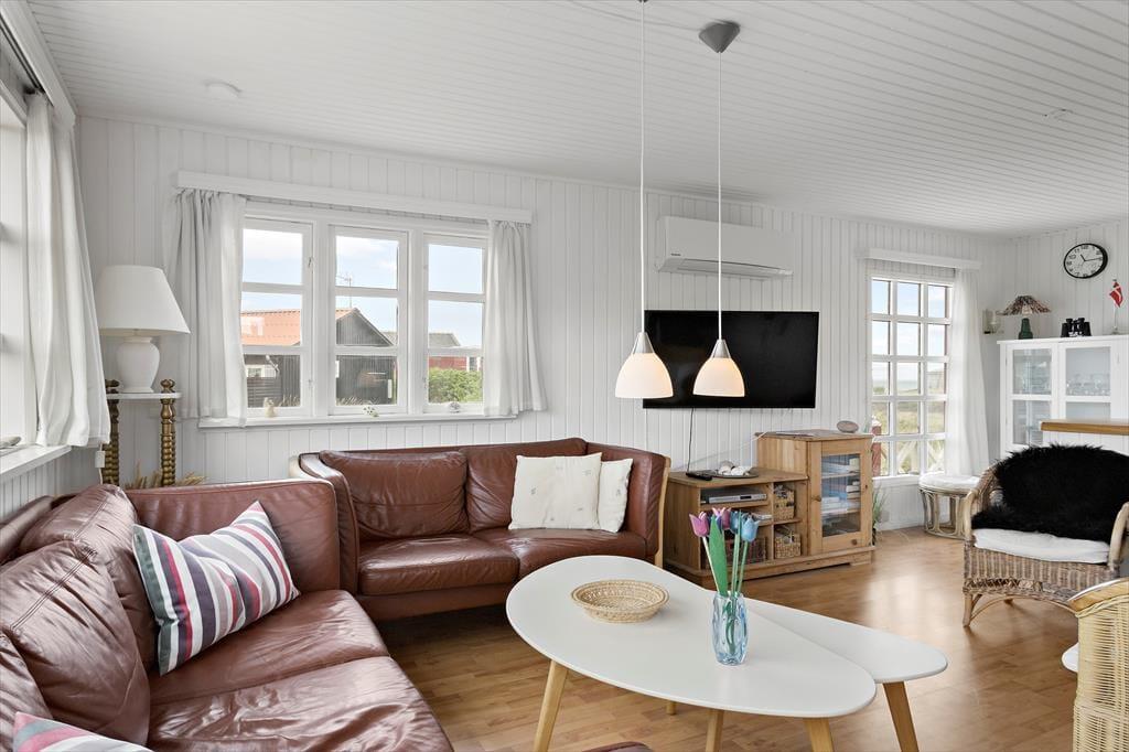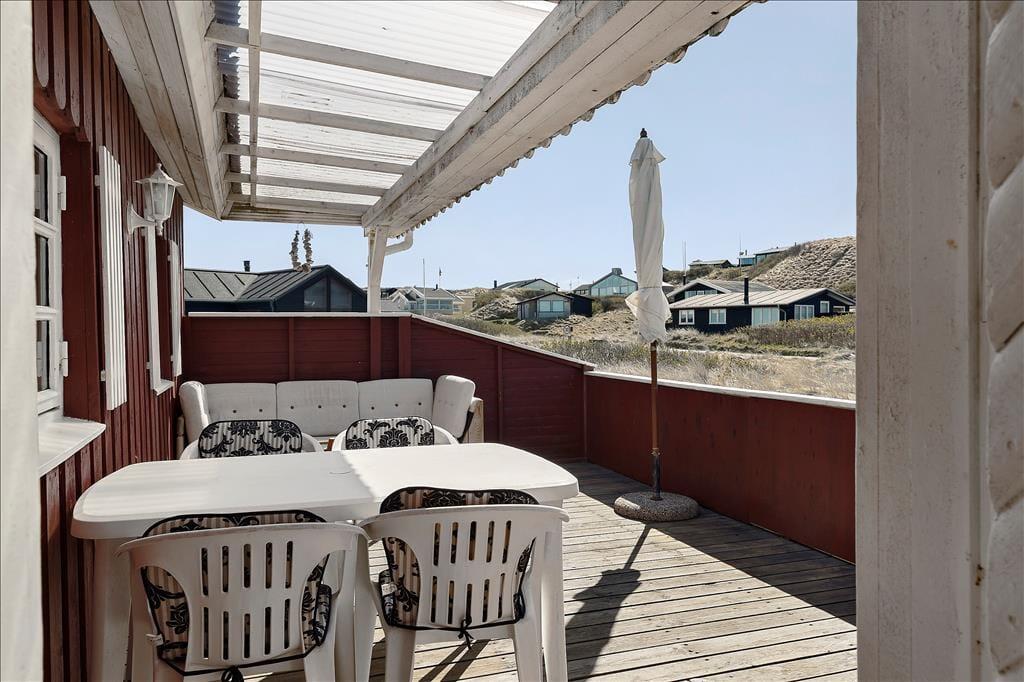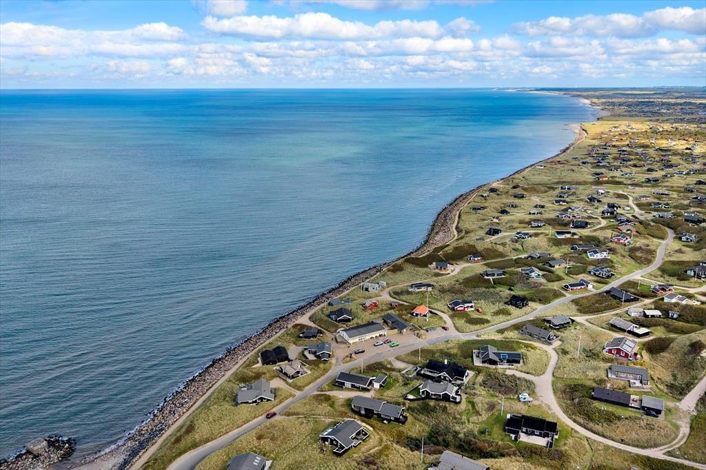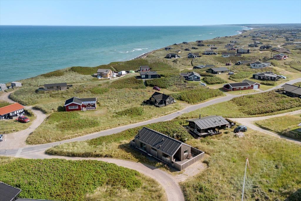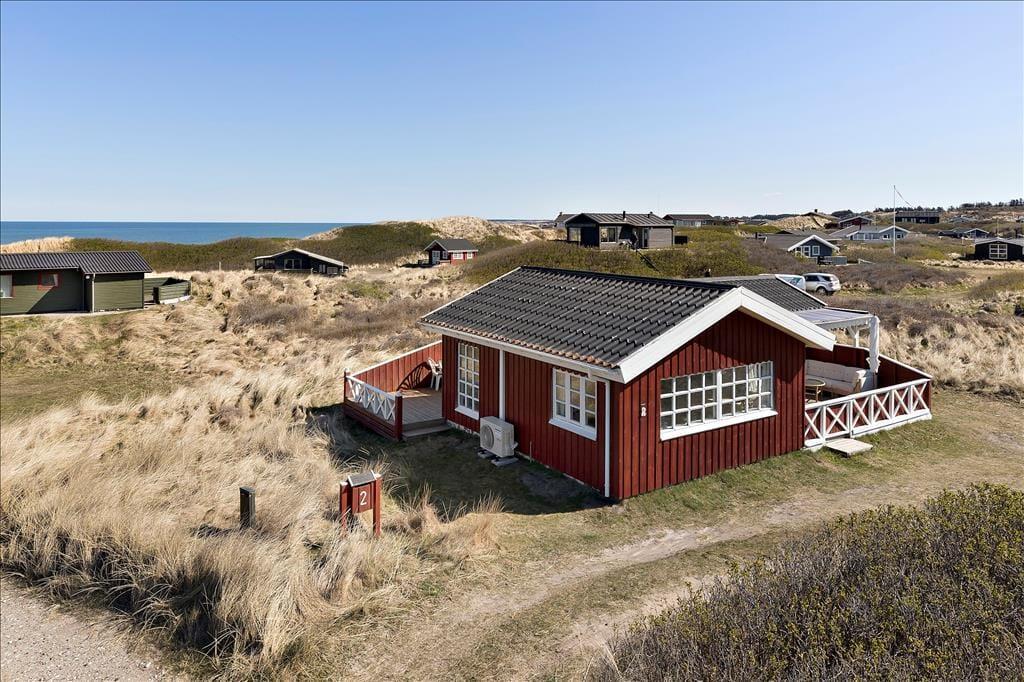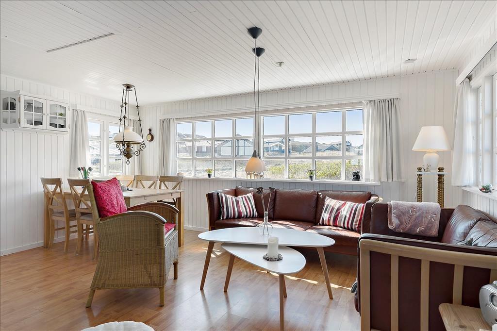 Hvis I drømmer om at holde ferie ved vandet, har I kig på det helt rette hus: 65 meter er alt, hvad I skal tilbagelægge for at komme fra sommerhuset til stranden, og selv når I opholder jer inden døre, har I udsigt til Vesterhavet.
