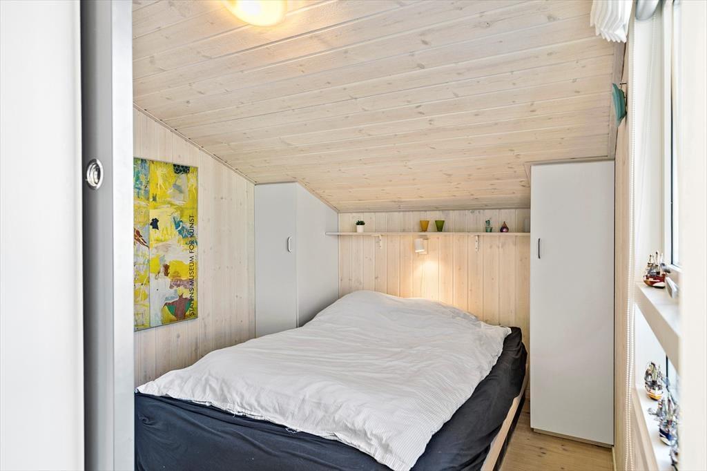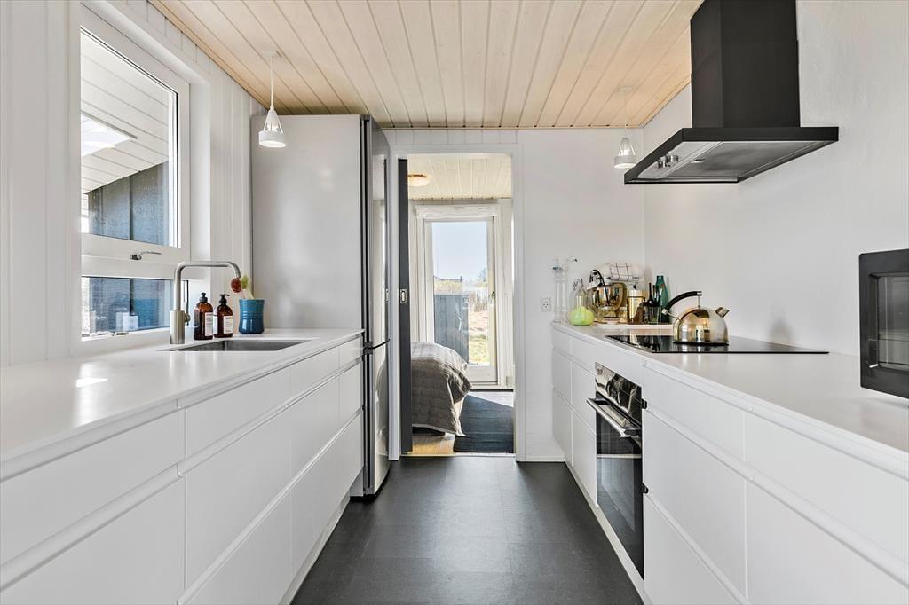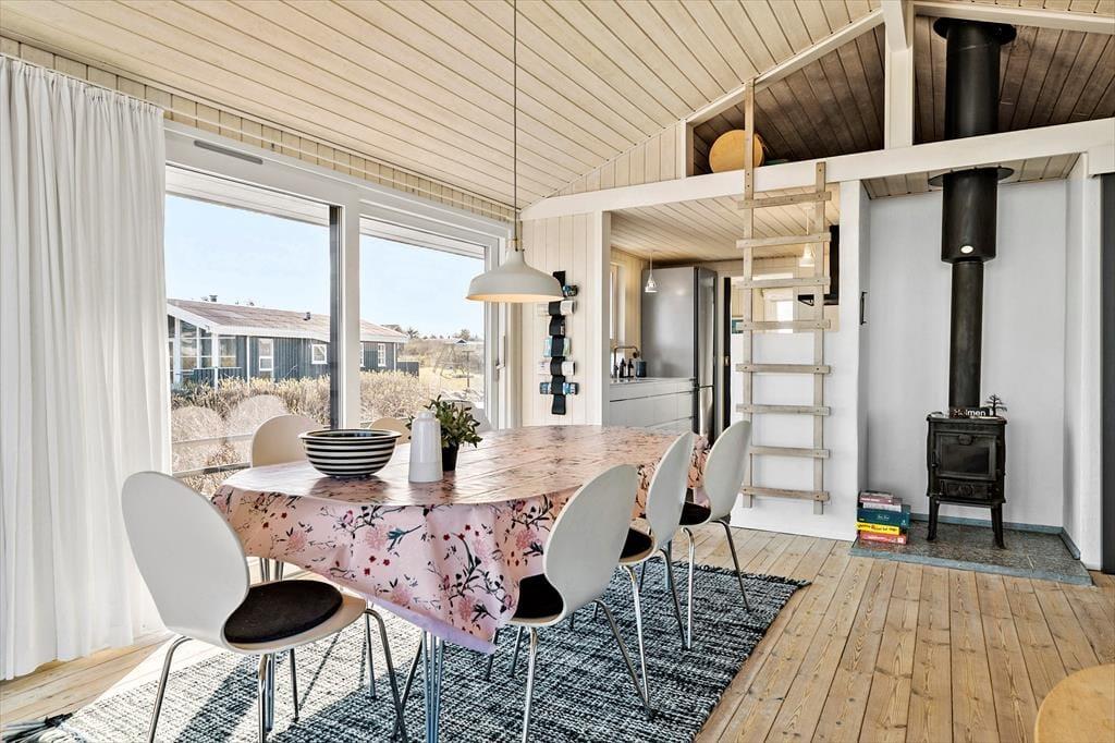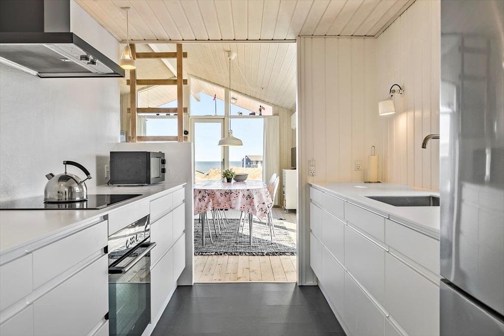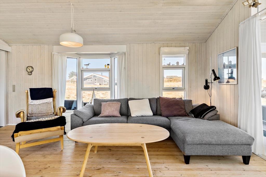 Huset er et klassisk sommerhus med sortmalet træfacade og hvide vinduesrammer. Det charmerende førstehåndsindtryk fortsætter indenfor, hvor man straks føler sig hjemme. Husets hjerte er den hyggelige opholdsstue og køkken, som er forbundet i et åbent rum med loft til kip. De lyse trævægge og lofter skaber en let og luftig nordisk stemning, og de store vinduer lader masser af naturligt lys strømme ind. Fra stuen har I en smuk udsigt over landskabet med Vesterhavet som baggrund. Køkkenet er moderne og godt udstyret, så I nemt kan tilberede feriens måltider. Huset har tre soverum, alle med dobbeltsenge, samt et badeværelse med brusebad og vaskefaciliteter.